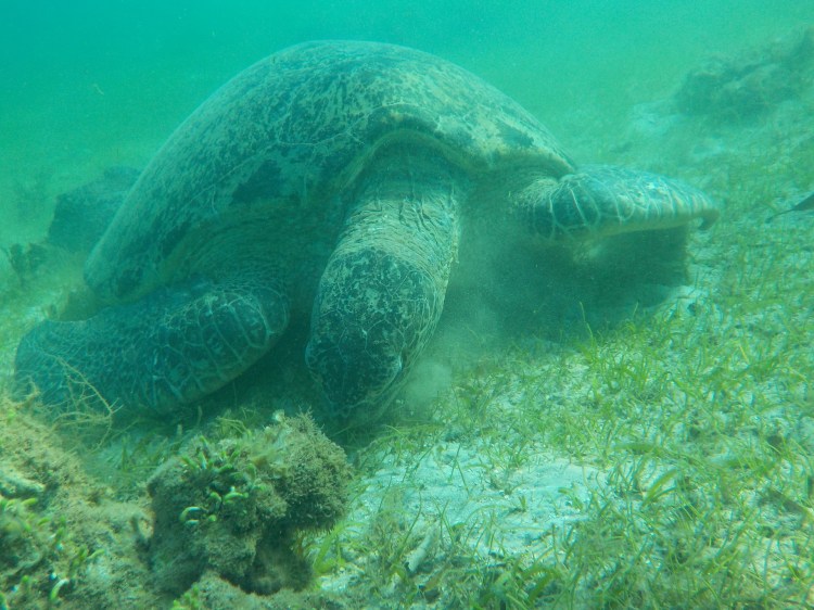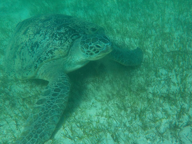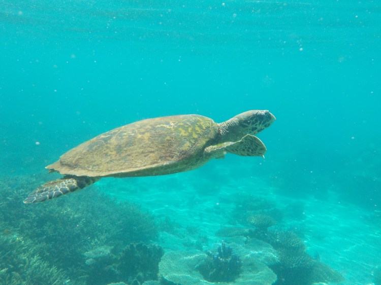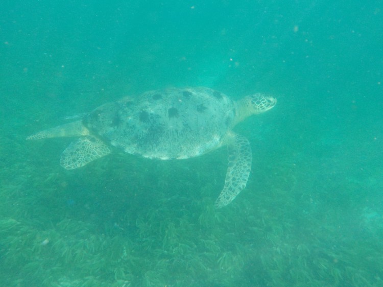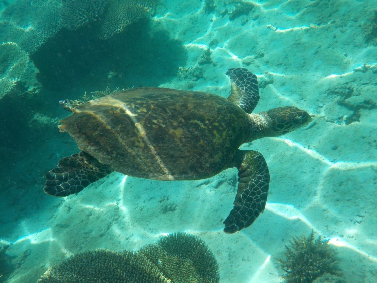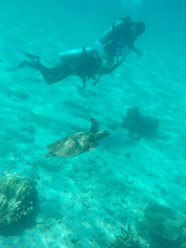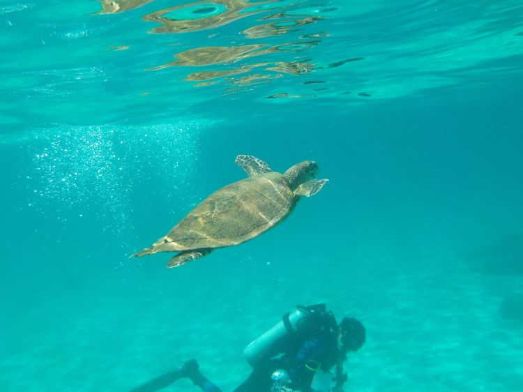 Philippe accompagne pendant un moment les plongeurs dans leur évolution sous-marine et très rapidement un monde merveilleux s’offre à nous. Proche de la surface, ce sont de multiples poissons ainsi que des tortues qui nagent autour de nous. C’est un vrai bonheur de pouvoir évoluer si près de ces magnifiques tortues marines.