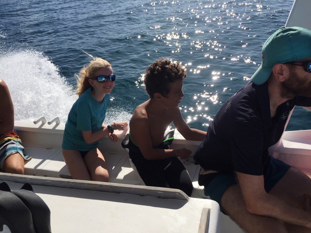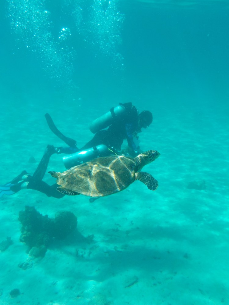 Gabrielle est soulagée car après quelques minutes dans l’eau, les réflexes sont revenus et l’appréhension disparaît. Elle peut donc profiter d’aller à sa guise, en s’assurant de garder son partenaire de plongée à portée de vue et vice-versa. Nathalia et Gabrielle auront le chance d’observer un requin guitare, ce qui n’est apparemment pas fréquent 🦈!