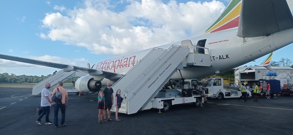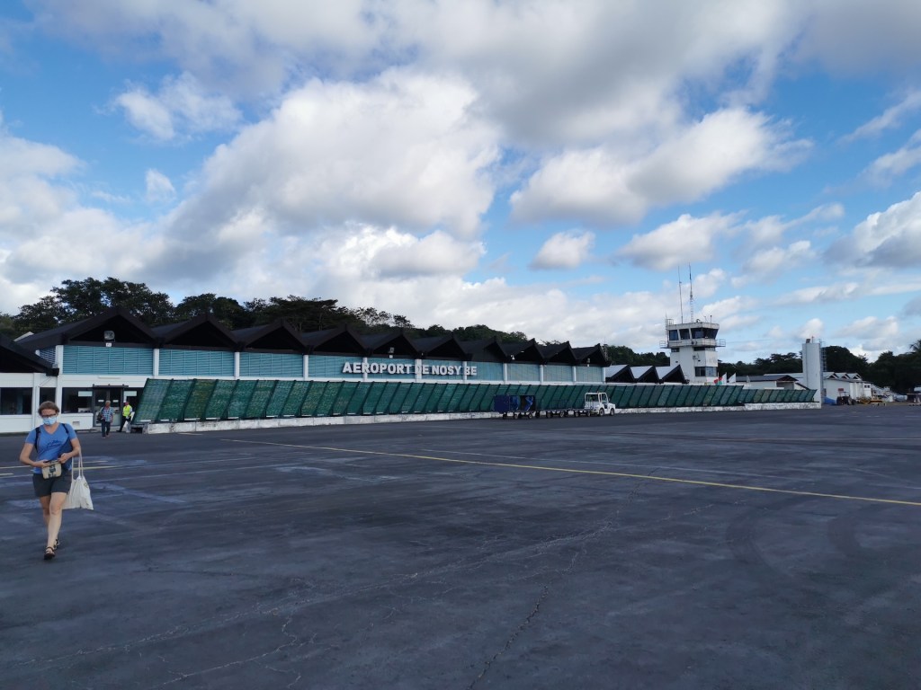 Après avoir parcouru les derniers kilomètres, nous arrivons dans un tout petit aéroport. Difficile à croire que nous allons quitter le pays pour rejoindre notre prochaine destination depuis ce minuscule terminal. Nous procédons aux derniers achats de souvenirs puis vient le moment des adieux avec les Rama 😢. C’est le coeur gros que nous nous disons au revoir, même si nous savons que nous allons rapidement nous retrouver puisqu’ils seront dans un mois et demi à Genève! Nous les remercions chaleureusement pour leur accueil, pour nous avoir permis de partager leur vie à Ambatozavavy et pour nous avoir fait découvrir cette magnifique île de Nosy Be.