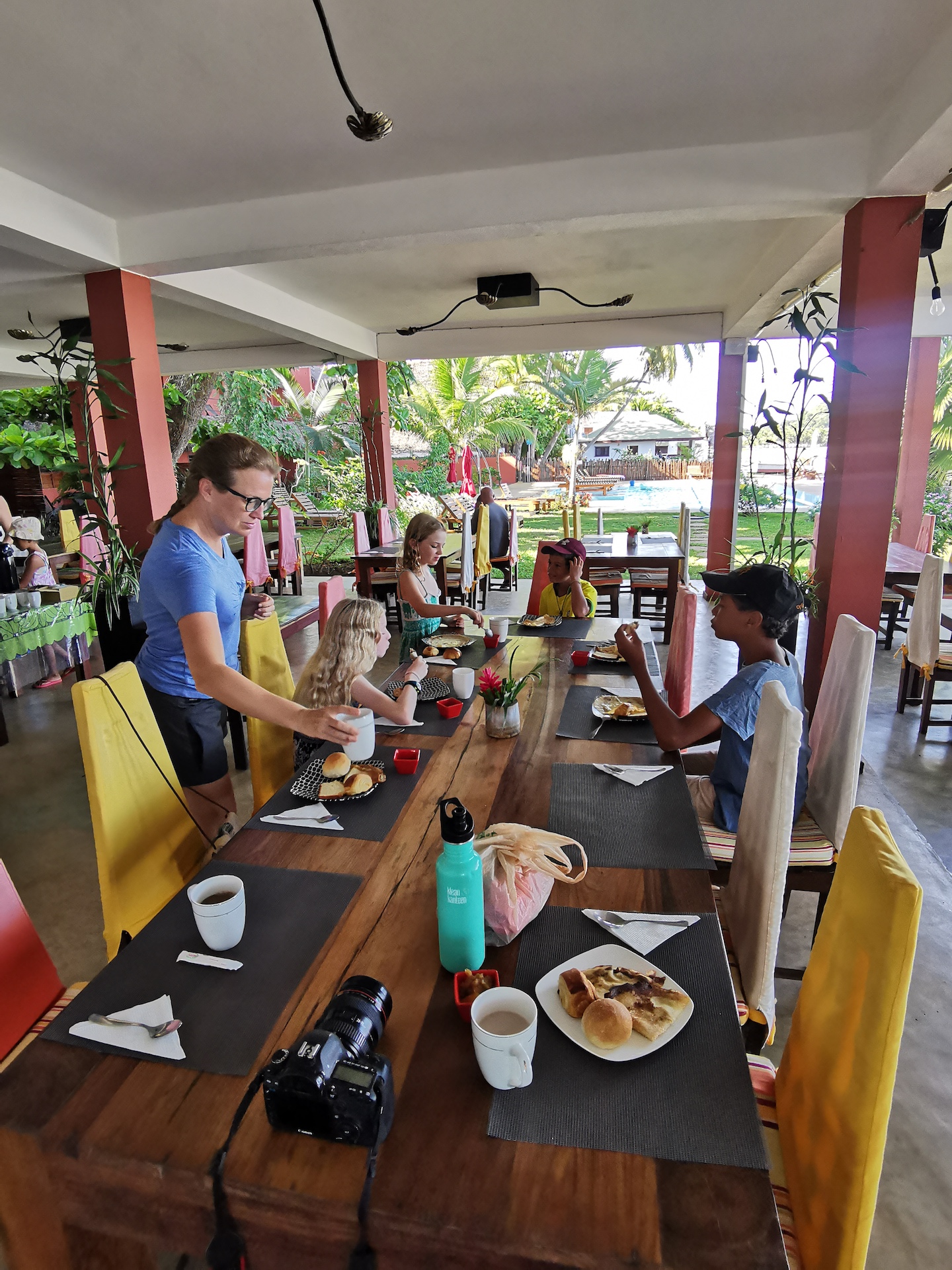 Une fois les prélèvements « si appréciés » effectués, nous félicitons les filles pour leur courage (c’est quand même le dixième depuis notre départ… 😅) en allant prendre un délicieux petit-déjeuner à la Casa Mofo. Il s’agit d’une boulangerie/tea-room de la capitale que nous avons découvert grâce aux Rama, qui en ont fait un passage quasi obligé lors de leurs régulières venues à Hell-Ville. Il s’y vend de nombreuses et délicieuses viennoiseries et pâtisseries 🥐, qui nous rappellent la maison.
