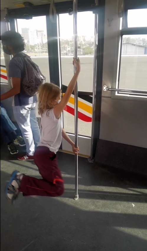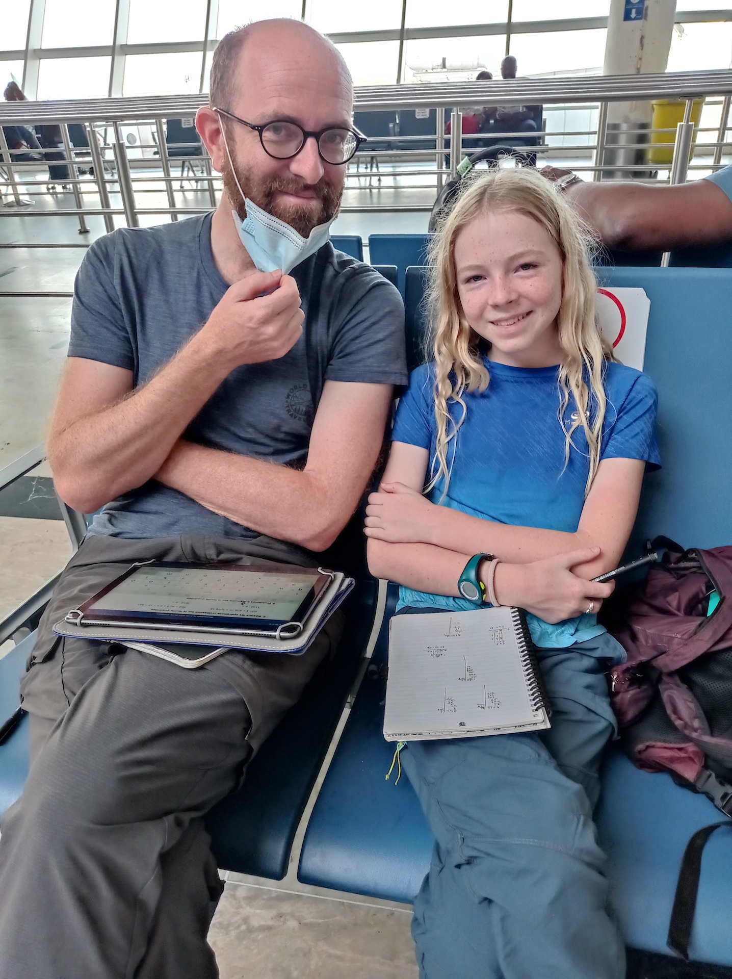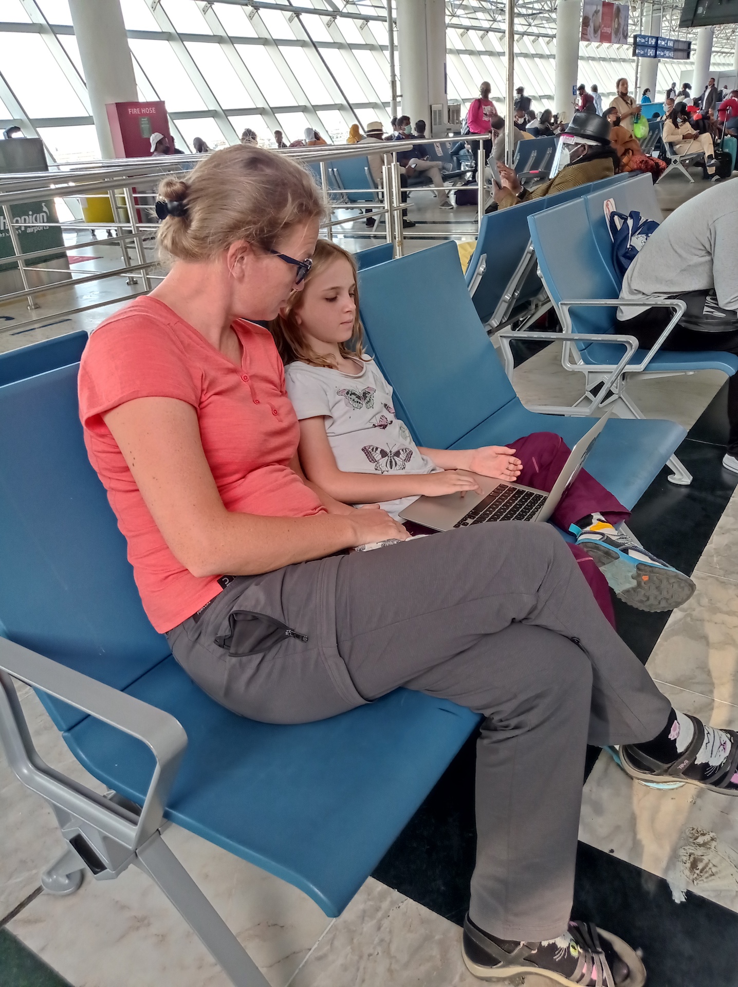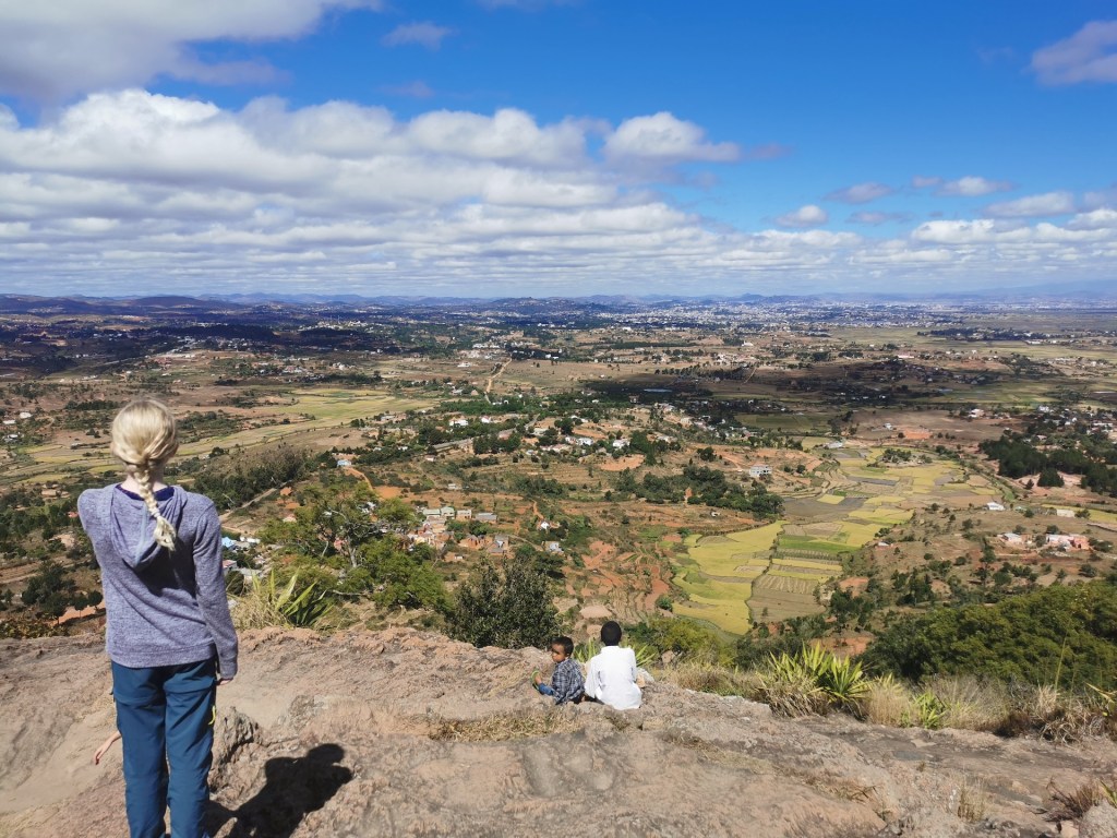 Notre 5ème et dernier continent, l’Afrique, nous attend. Pour cette nouvelle étape de notre tour du monde, nous commençons par la découverte de la grande île de Madagascar. Le périple pour y arriver est plutôt long car certaines compagnies n’ont pas encore repris leurs vols autour de l’océan indien. Nous profitons donc des escales pour faire un peu d’école, pour le plus grand bonheur des filles 😜! Nous devons d’abord revenir sur Bangkok en soirée puis poursuivre au milieu de la nuit sur Addis-Abbeba avant de finalement atterrir en milieu d’après-midi à la capitale de Madagascar, Antananarivo, dite Tana pour les intimes (enfin… pour tout le monde, c’est plus simple!). Estelle s’amuse comme elle peut dans le bus… en copiant une de ses tantes qui pratique le pôle sport (le pole dance, mais en sport, donc dit de manière moins connotée 😉, sport qu’elle va d’ailleurs elle-même commencer à notre retour en terres helvétiques).