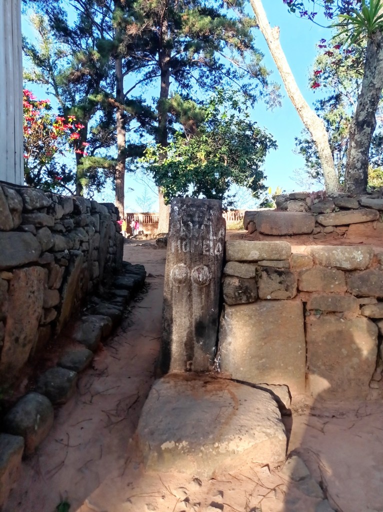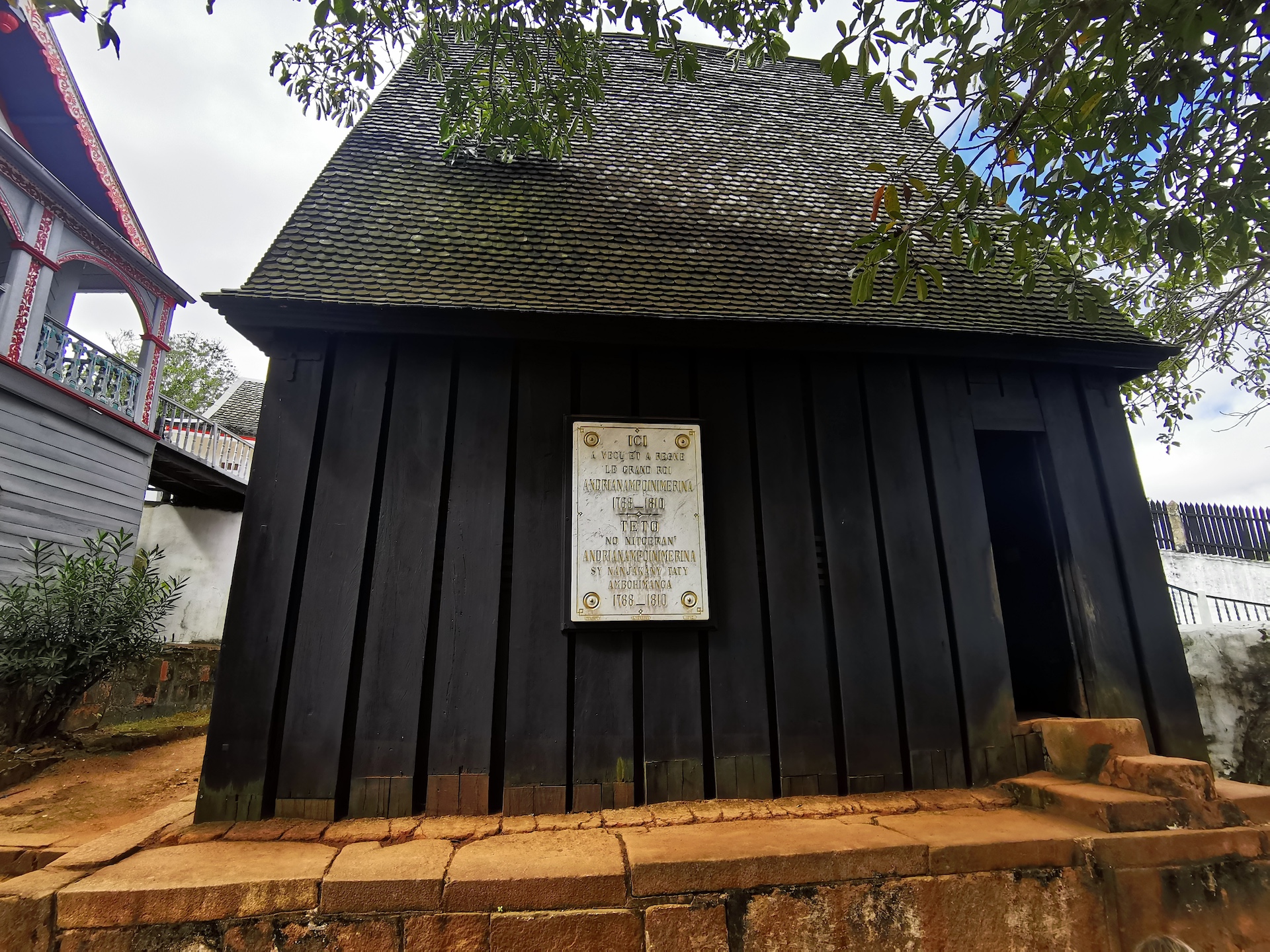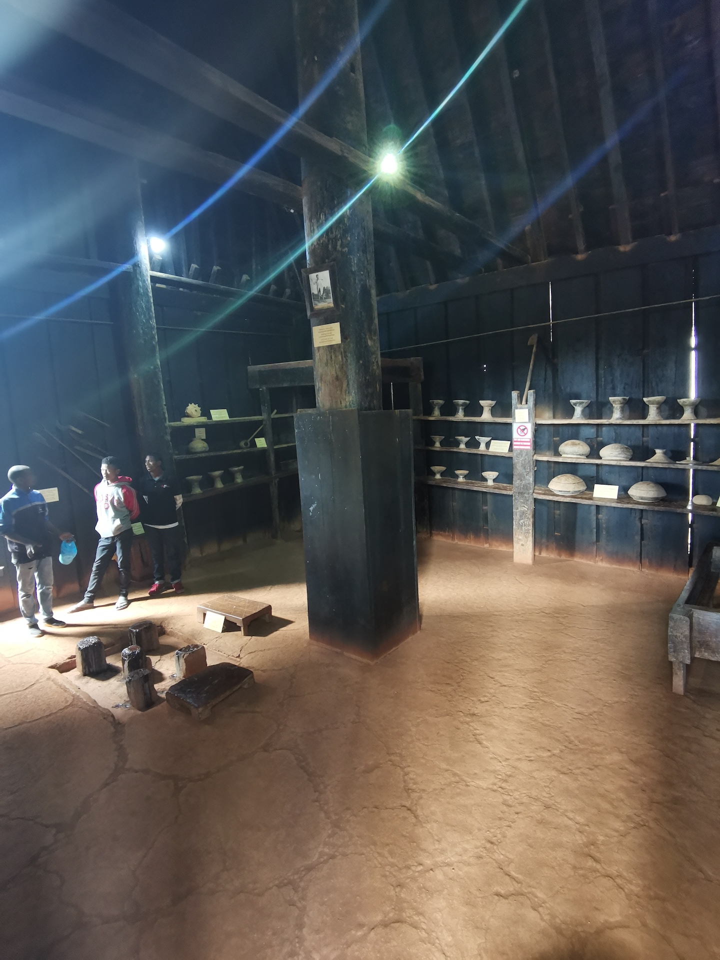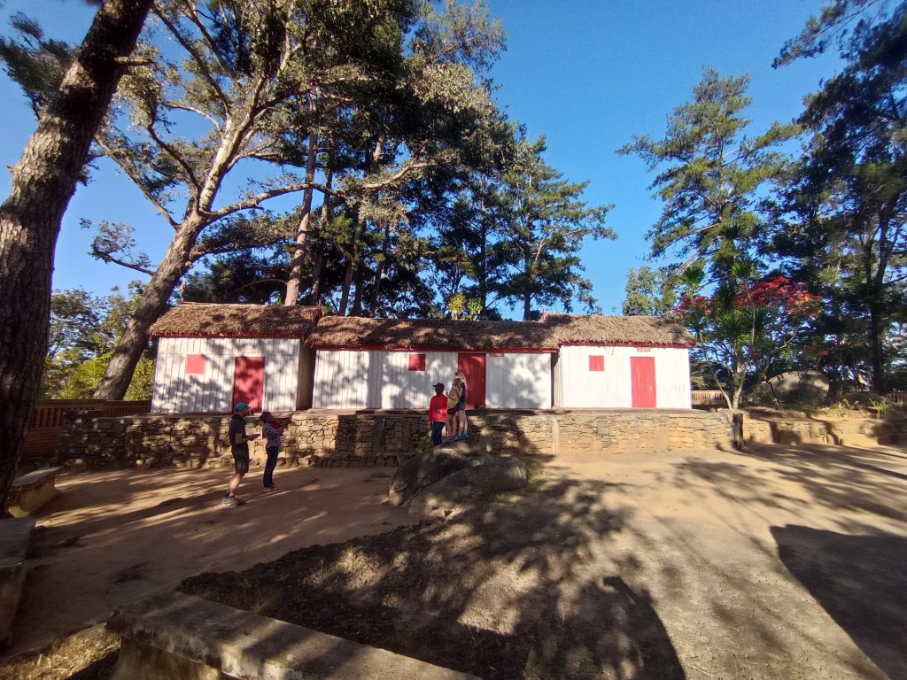 Au niveau supérieur, notre guide nous fait visiter le lieu où le premier roi a habité: une simple case noire, dans laquelle il dormait en hauteur, tandis que son épouse couchait au sol. Le lit du roi était placé au coin nord-est de l’habitation car c’était le lieu sacré des maisons, là où se trouvaient les ancêtres. A Madagascar, une partie de la population pratiquait le culte des ancêtres, et cela perdure encore aujourd’hui. Dans cette bâtisse, nous retrouvons également des objets simples de la vie quotidienne, tels que des ustensiles de cuisine par exemple puisque celle-ci se trouvait dans la même pièce. Pour entrer et sortir de la case, notre guide nous indique qu’il faut y aller à reculons pour une question de superstition (mais nous ne nous souvenons pas exactement de laquelle 😅).