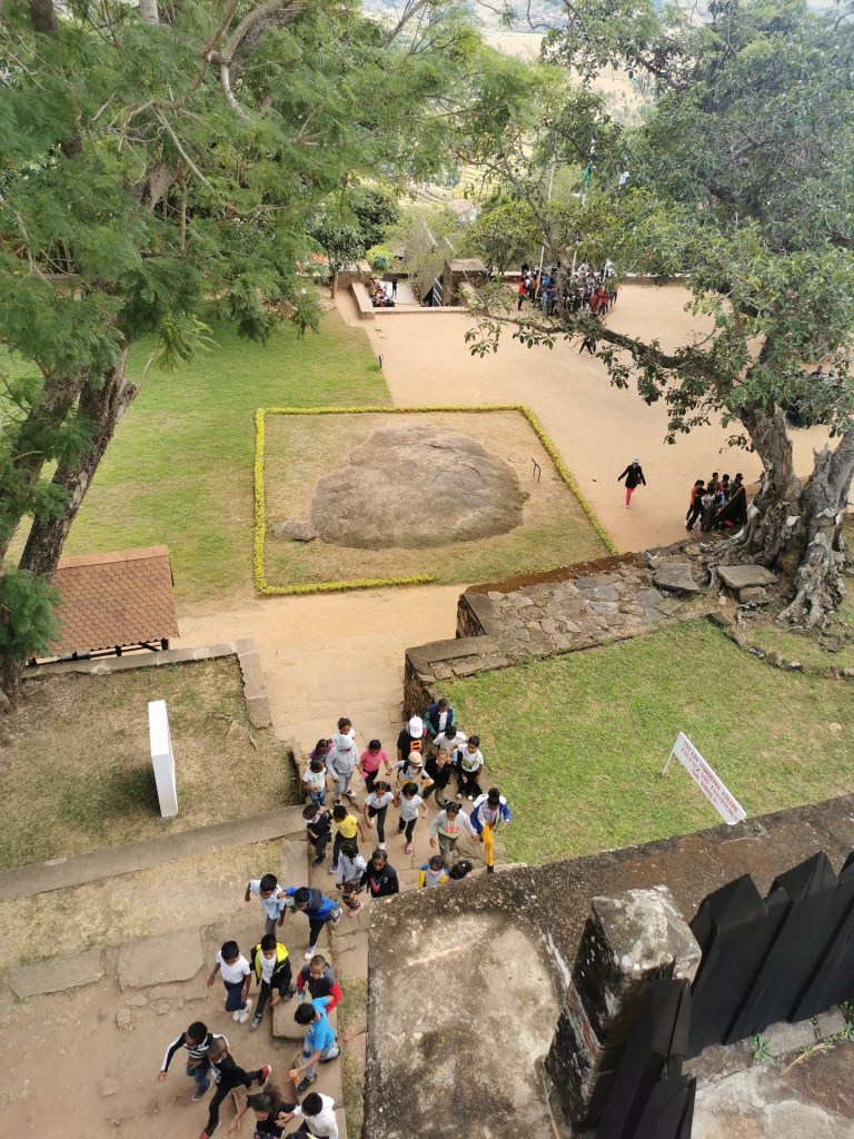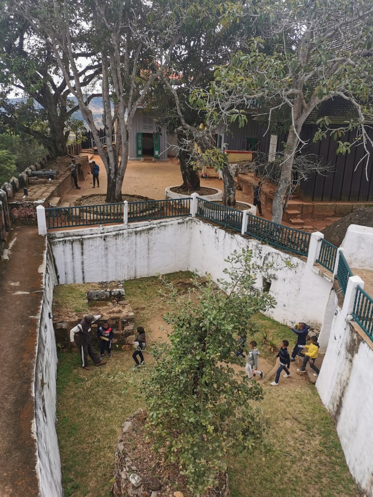 Après un réveil et un début de journée tout en douceur, nous partons avec Christina à Ambohimanga-Rova, sur une des 12 collines sacrées qui entourent la capitale, à une vingtaine de kilomètres au nord de celle-ci. Le site abrite le palais du roi Andrianampoinimerina (qui régna de 1787 à 1810). C’est lui qui fonda la dynastie des rois de Madagascar. Ce palais se trouve dans un joli complexe de bâtiments qui, initialement, accueillaient le roi (ou la reine) des Merina, le peuple du centre de l’île, qui petit à petit va s’imposer sur les royaumes voisins. Nous décidons de prendre un guide afin de mieux entrer dans l’histoire des rois malgaches et celui-ci nous explique que ce premier roi avait 12 femmes, provenant des douze peuples de la région. Chacune avait été installée sur une des collines sacrées qui entourent la capitale afin de réunifier tous ces peuples en un seul. Nous nous retrouvons sur place en même temps que de nombreux écoliers en sortie scolaire, ce qui apporte beaucoup de vie au site historique 😝! Nous commençons par le premier niveau du complexe où se trouve la place cérémonielle, sur laquelle nous pouvons voir une grande pierre en forme de coeur (il faut avoir un peu d’imagination pour y voir un 🤍). C’est sur cette pierre que des sacrifices de zébus avaient lieu. Au second niveau, un petit enclos entouré de murs abritait le prochain zébu avant son sacrifice. Ceux-ci étaient choisis exprès pour le roi et ils devaient impérativement être beige, avec une tâche blanche sur la tête et les pattes et la queue blanches.
