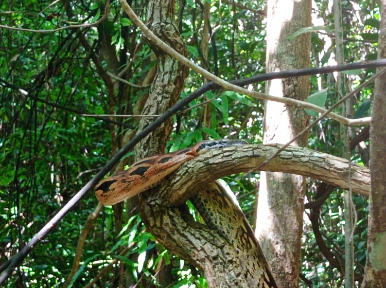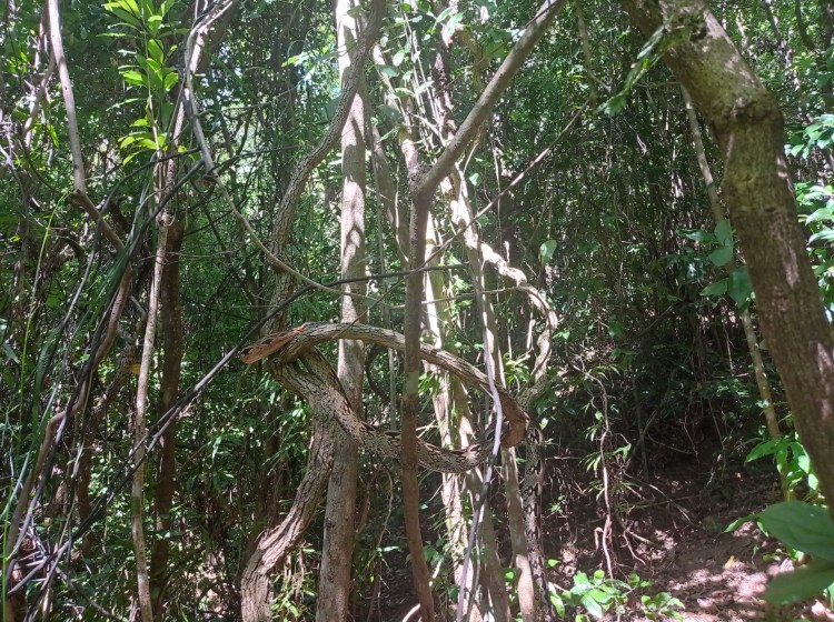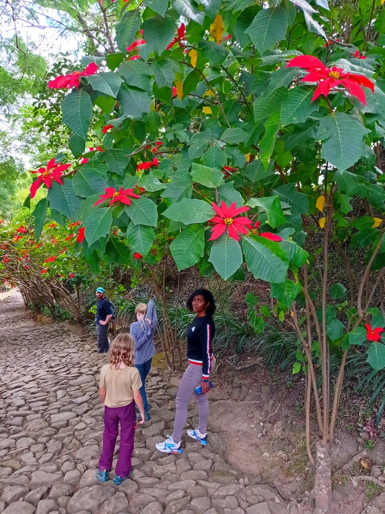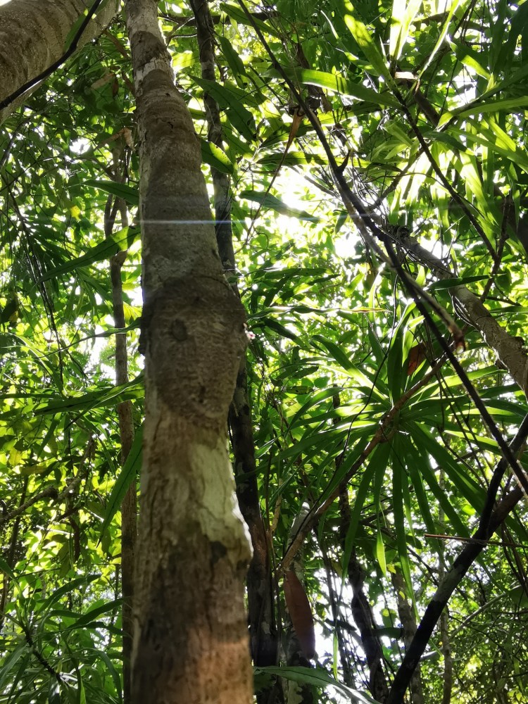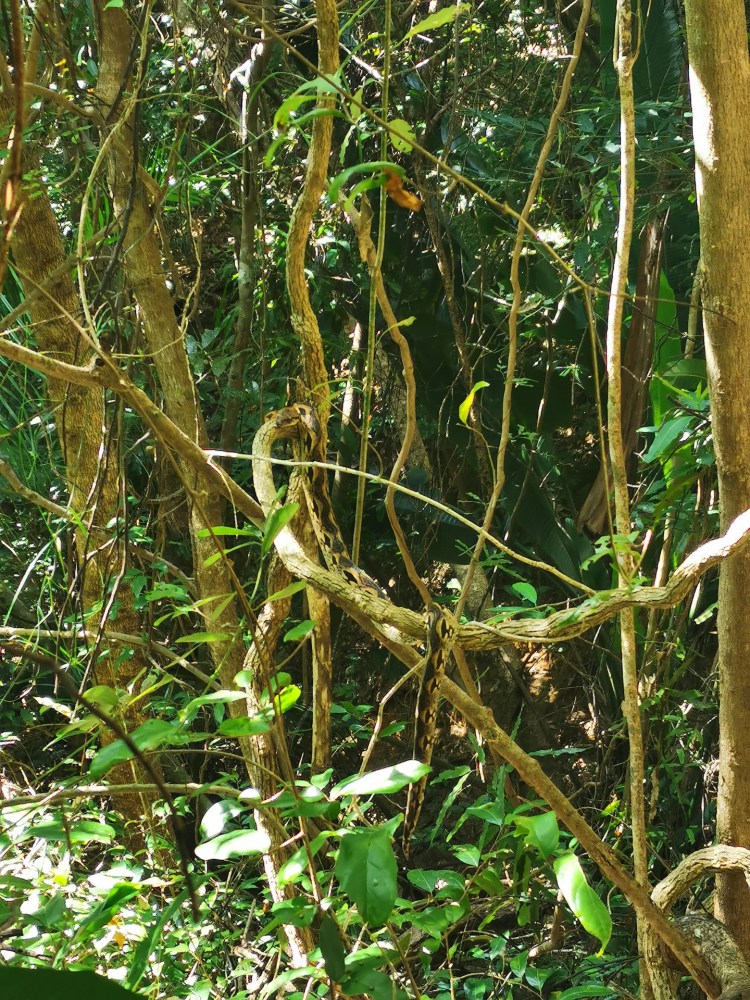 Nous débutons par quelques jolies plantes, dont la liane qui, d’après notre guide, monterait toujours autour des arbres dans le sens inverse des aiguilles d’une montre.