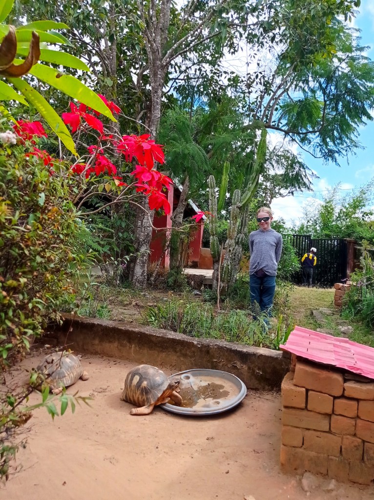 Si les lémuriens sont libres d’aller à leur guise, où ils veulent, ce n’est pas le cas des prochains animaux que nous rencontrons. Il s’agit de quelques tortues terrestres, de différentes tailles, conservées dans des sortes d’enclos entourés d’un muret en pierres 🐢. Certaines sont très, très grandes et elles ressemblent beaucoup à celles que nous avions découvertes aux Galapagos! Bon, nous n’avons retrouvé qu’une photo de ces tortues et c’est une toute petite qui est dessus 😜. Nos guides nous montrent encore une fosse dans laquelle se trouvent deux boas 🐍(un peu glauque…), quelques lézards et un joli caméléon orangé. Notre guide nous explique que leur langue peut être très longue, parfois plus longue que leur queue et qu’elle possède une sorte de petite ventouse au bout pour attraper les proies!