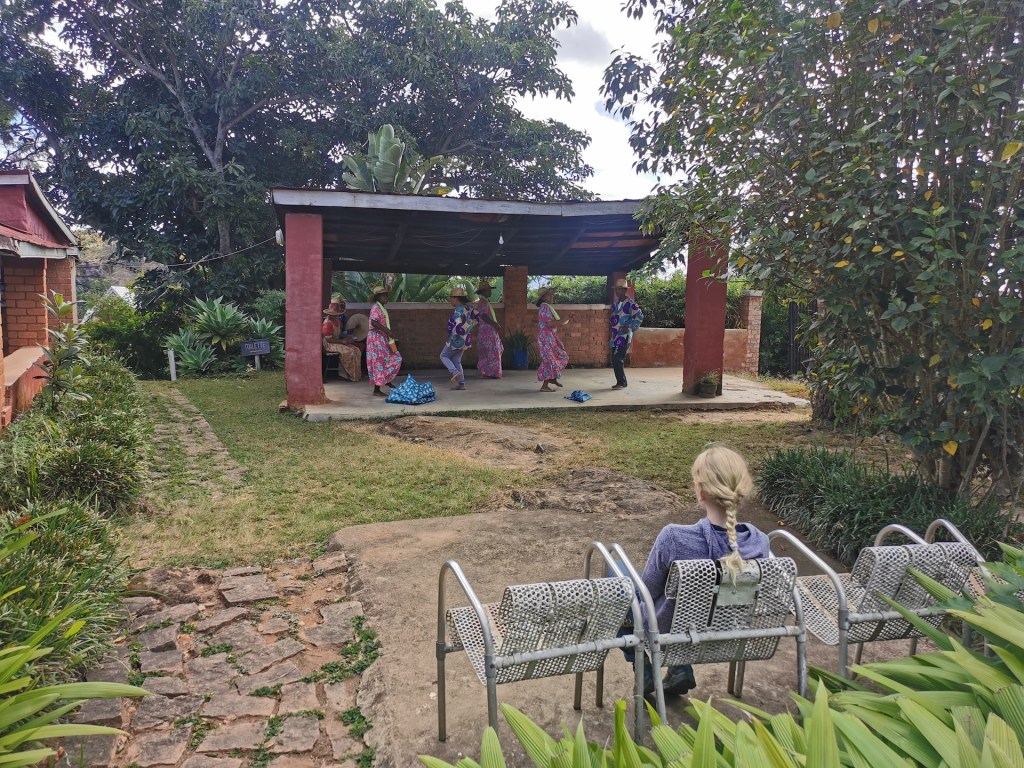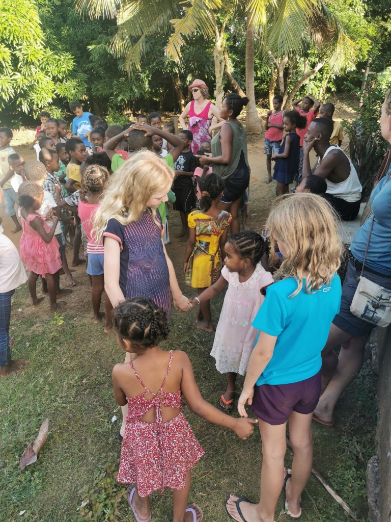 Les baptêmes se faisant en plein soleil et la cérémonie durant longtemps (trois heures au total, culte + baptêmes), nous trouvons un coin ombragé vers quelques arbres un peu à l’écart. Nous y retrouvons plusieurs jeunes filles en train de répéter des danses Tik Tok. Cela intrigue beaucoup Marine, Estelle, Mialy et quelques unes de ses amies, alors elles les observent attentivement. Elles finissent même par essayer de reproduire les pas observés, aidées par une des jeunes adolescentes. La jeunesse n’est pas différente à Mada qu’en Europe 😉.