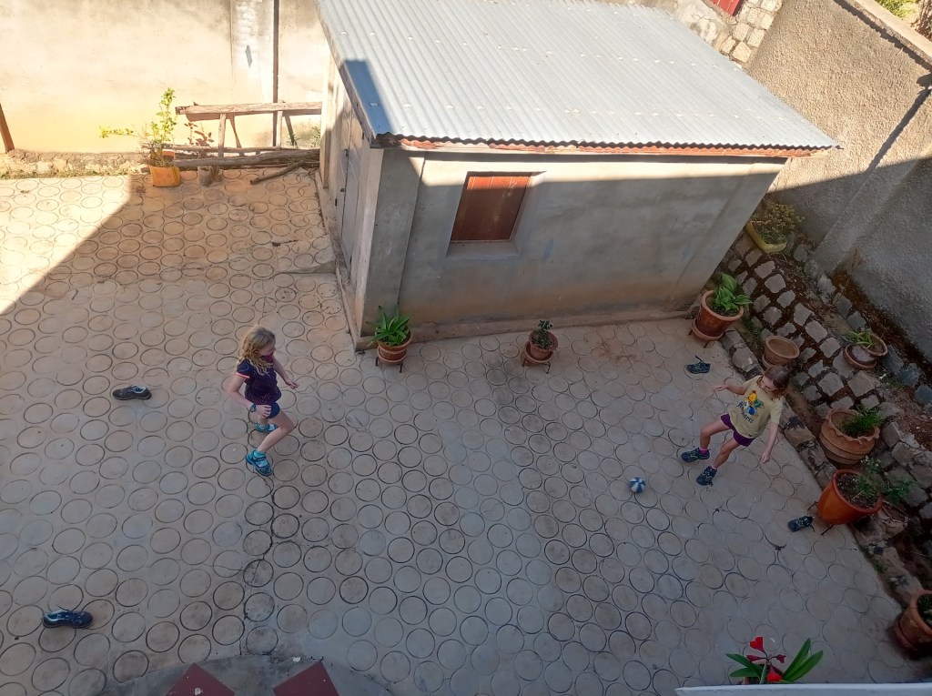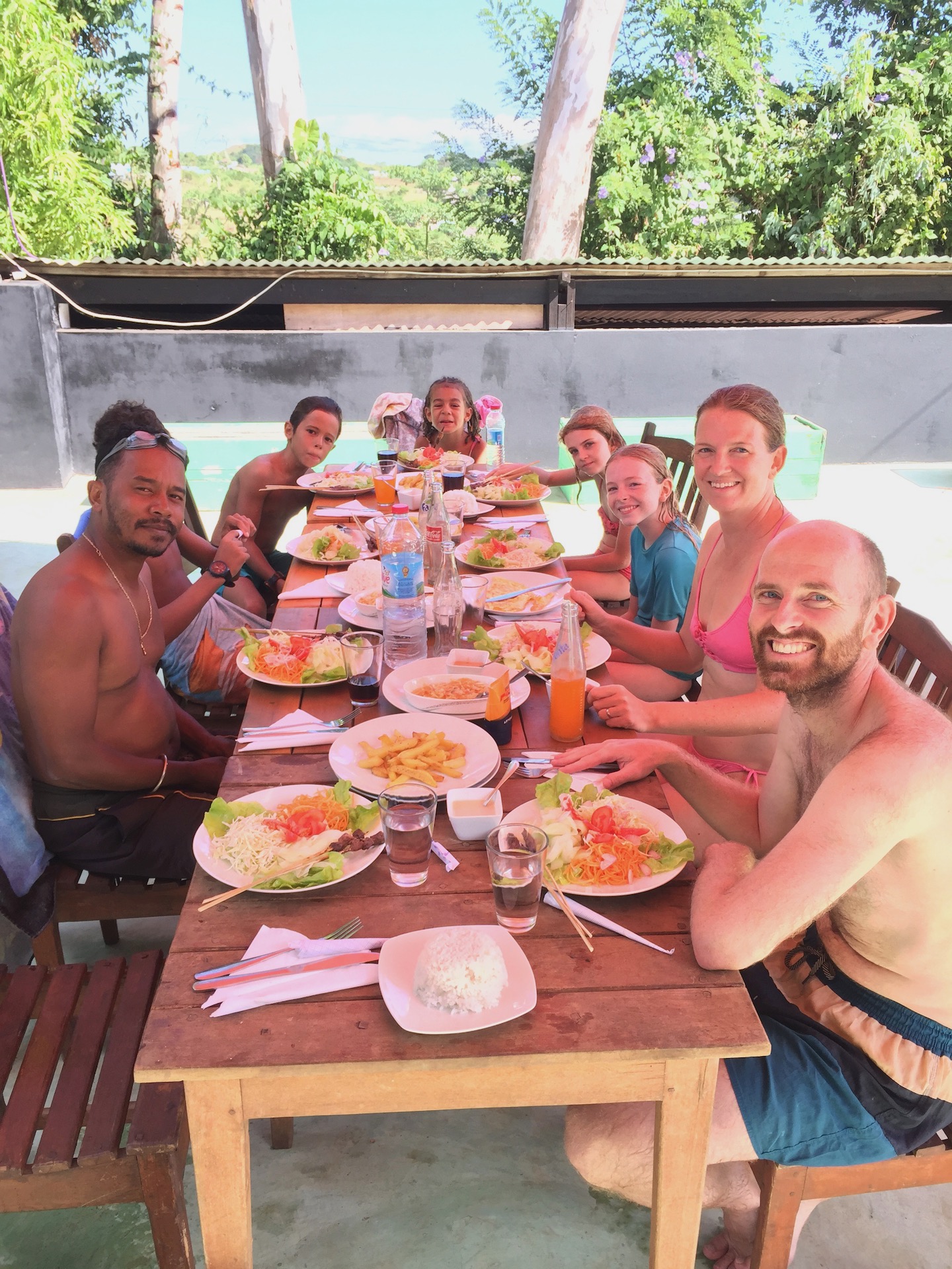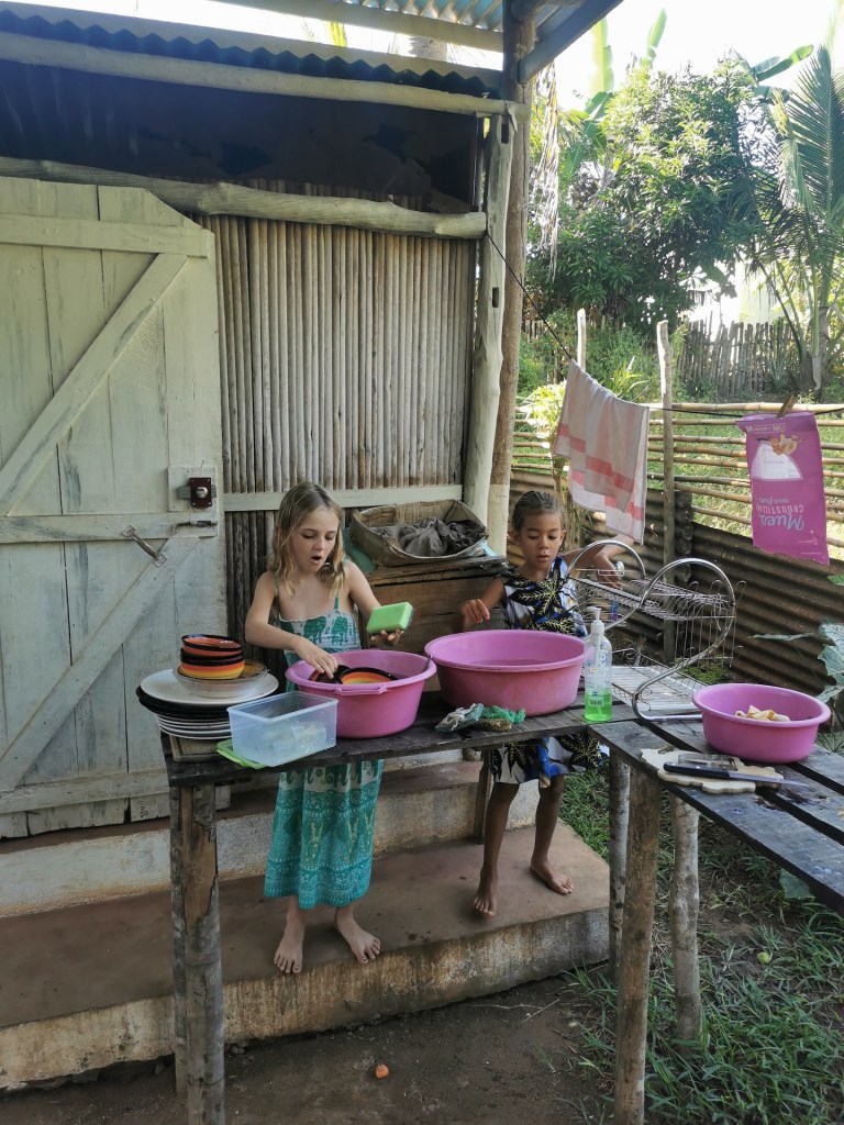 Le travail scolaire se termine autour de 13h puis nous nous mettons à table. Parfois ce sont des restes du soir d’avant et parfois les garçons vont au centre du village pour acheter un plat préparé dans une gargotte. Avec les Rama, nous retrouvons une certaine forme de stabilité et de routine qui plaît bien à toute la famille, après ces nombreux mois de changements continus. Nous nous calquons donc sur leur programme et sur leur organisation. Pour la gestion des tâches domestiques, les filles s’intègrent au tournus mis en place par Nathalia et Hervé, comme mettre la table, la débarrasser, faire la vaisselle, etc. Elles aident leurs cousin.e.s à les effectuer… Pourvu qu’elles gardent cet enthousiasme lors de notre retour à Genève!!! 🤞🏻😄