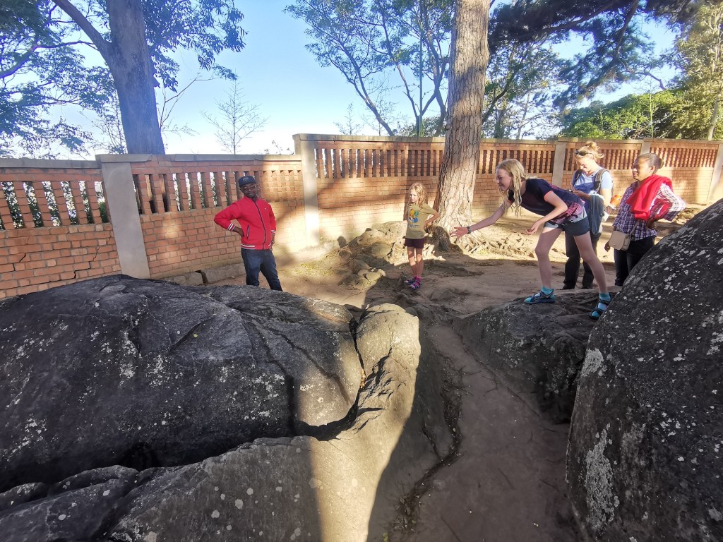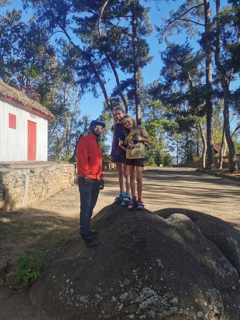 Pour la suite de la journée, nous nous promenons dans le quartier où habitent les Rama. Philippe part se faire couper les cheveux ainsi que la barbe en compagnie d’Alain puis nous nous rendons tous à pied sur une autre des 12 collines sacrées, celle de Rovan’Ambohidratrimo. Au sommet de celle-ci se trouve le palais d’une des douze reines, dont il ne reste que les fondations. Sur place nous pouvons encore voir trois tombes royales qui ont été rénovées récemment car elles ont été incendiées en 2015. Ces tombes sont en fait de petites « maisons » rouges et blanches, qui ne ressemblent donc pas aux tombes que nous avons l’habitude de voir. Le lieu est sacré et par conséquent l’alcool, l’ail, la chèvre, le porc et le poulet (ce dernier est un symbole de misère) y sont prohibés. Derrière les fondations du palais se trouve un rocher particulier: le rocher des 7 voeux. Il s’agit d’y lancer 7 pierres et si l’une d’entre elles (ou plusieurs) rentre dans le trou, on peut faire un/des vœux. Les filles tentent leur chance et, après de nombreuses essais, ont finalement chacune droit à leur voeu. Nous terminons ensuite notre visite avec une autre particularité « géologique » du site: la roche aux deux seins. Les femmes viennent y faire des sacrifices et toucher les deux renflements de pierre pour tomber enceinte ou choisir le sexe du bébé. Il est écrit en blanc dessus « pour résoudre la stérilité ».