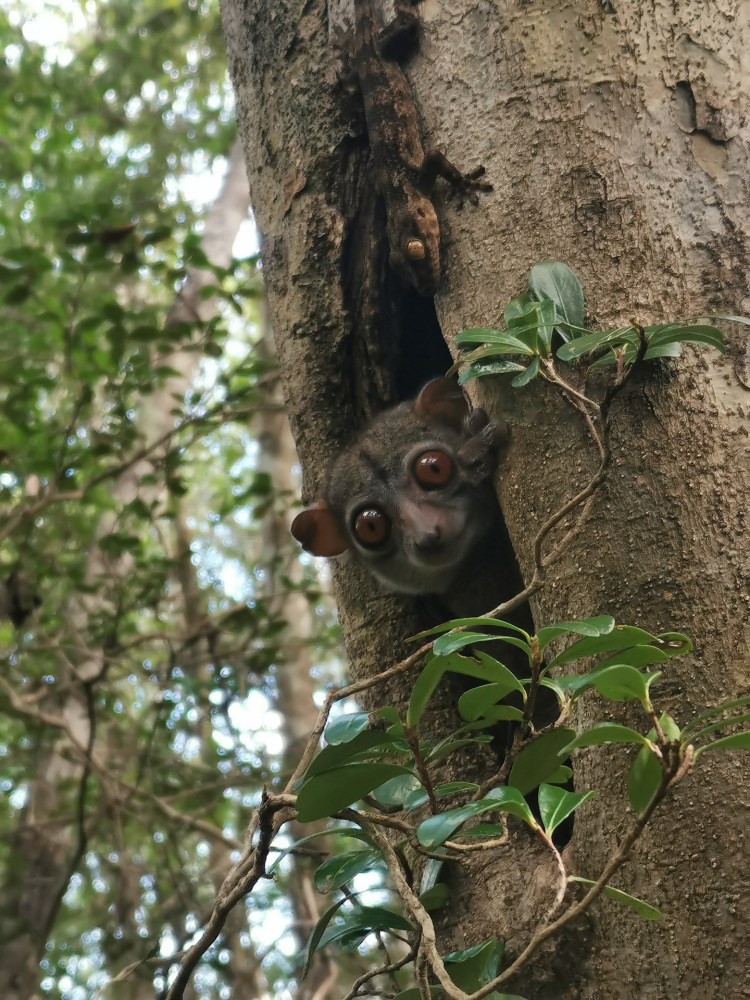 Un peu plus loin, le guide débusque un lémurien sportif endormi dans la cavité d’un arbre (pour rappel, le sportif est un lémurien nocturne qui dort donc pendant le jour). Nous terminons notre tour avec encore quelques animaux, tels que des caméléons et des lézards. Nous apprécions tout spécialement la démarche du caméléon qui avance de manière tout à fait particulière!