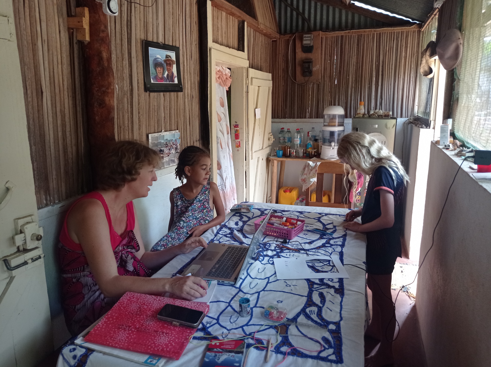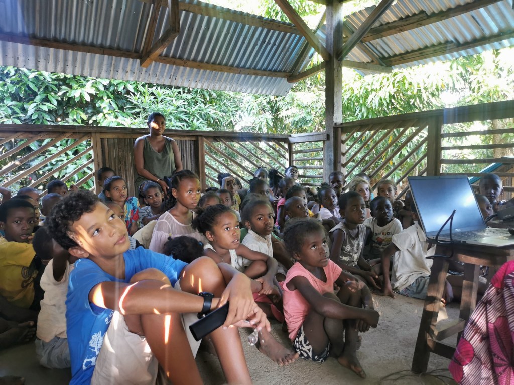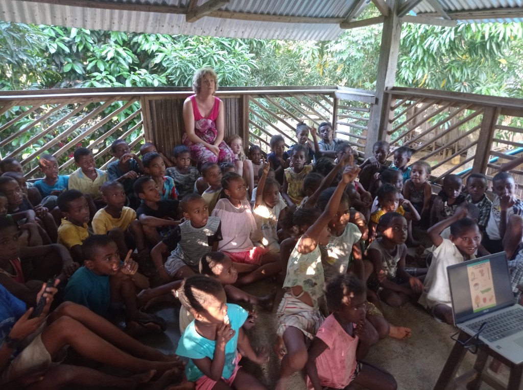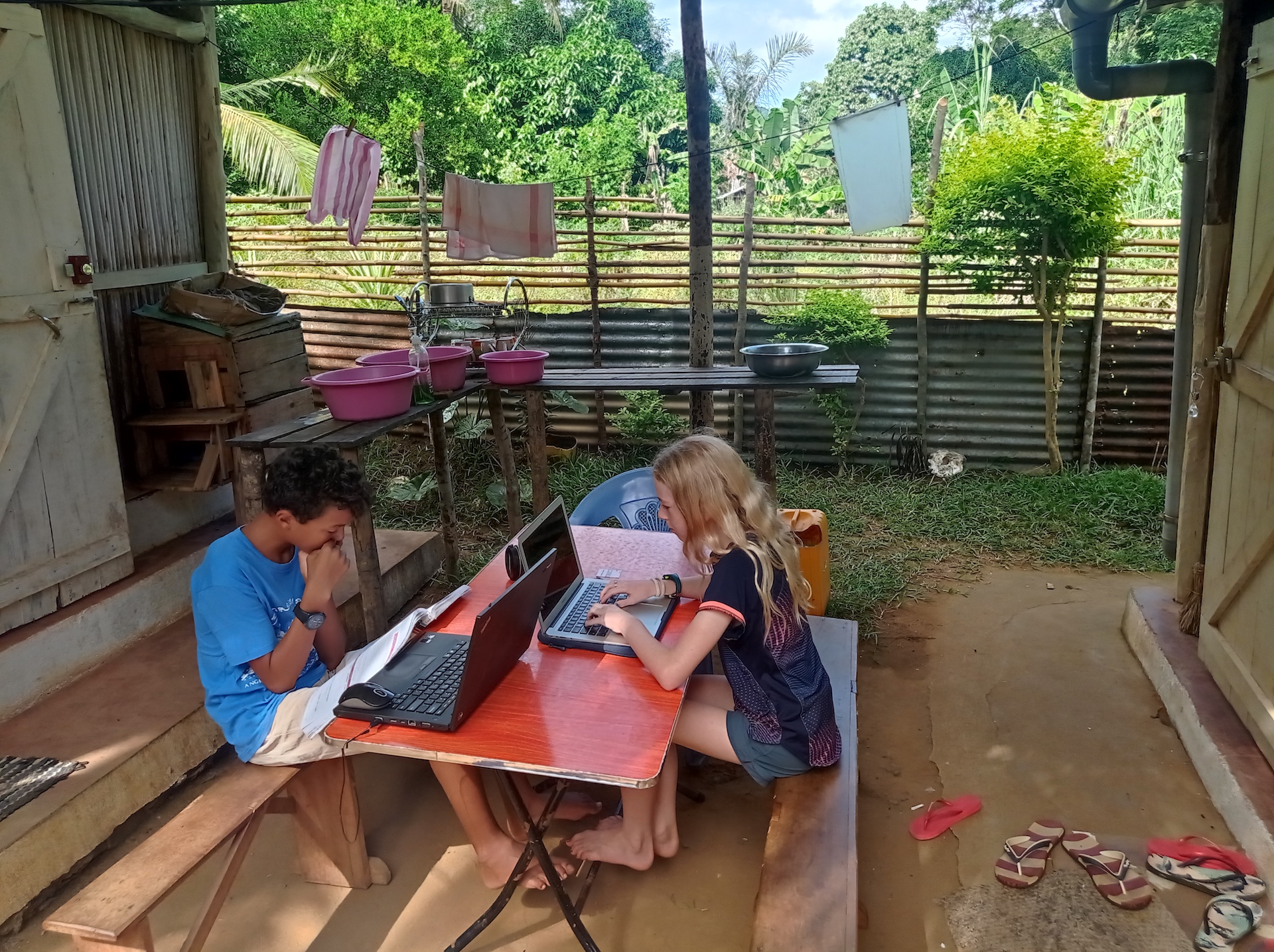 En parallèle, elle accompagne leurs trois enfants dans leur scolarité. Ils suivent des cours à domicile grâce au CNED, le centre national d’étude à distance (programme scolaire français). Rija et Andry, 13 et 11 ans, font la plupart de leurs tâches en ligne et ils font preuve d’une belle autonomie dans leur travail (même s’il faut quand même garder un oeil… 😉). Mialy, 7 ans, a besoin d’une présence continue afin de l’aider à avancer dans ses apprentissages. Pour cette dernière, les manuels sont principalement en version papier. Il existe une école française à Hell-Ville, mais pour des questions pratiques et de places, ils ont choisi cette option. Pour pouvoir suivre ces cours, les Rama ont du faire venir internet jusqu’à leur maison, mais la qualité n’est pas toujours optimale et il faut parfois compter avec des coupures de courant. Les enfants du coin vont à l’école du village, mais le niveau y est basique et les classes très remplies. Les enfants fréquentent l’école jusqu’en début d’après-midi (en fait selon l’horaire d’arrivée et de départ du professeur… 😜) et les trois Ramangalahy essayent de finir dans les même eaux afin de pouvoir les rejoindre pour jouer.
