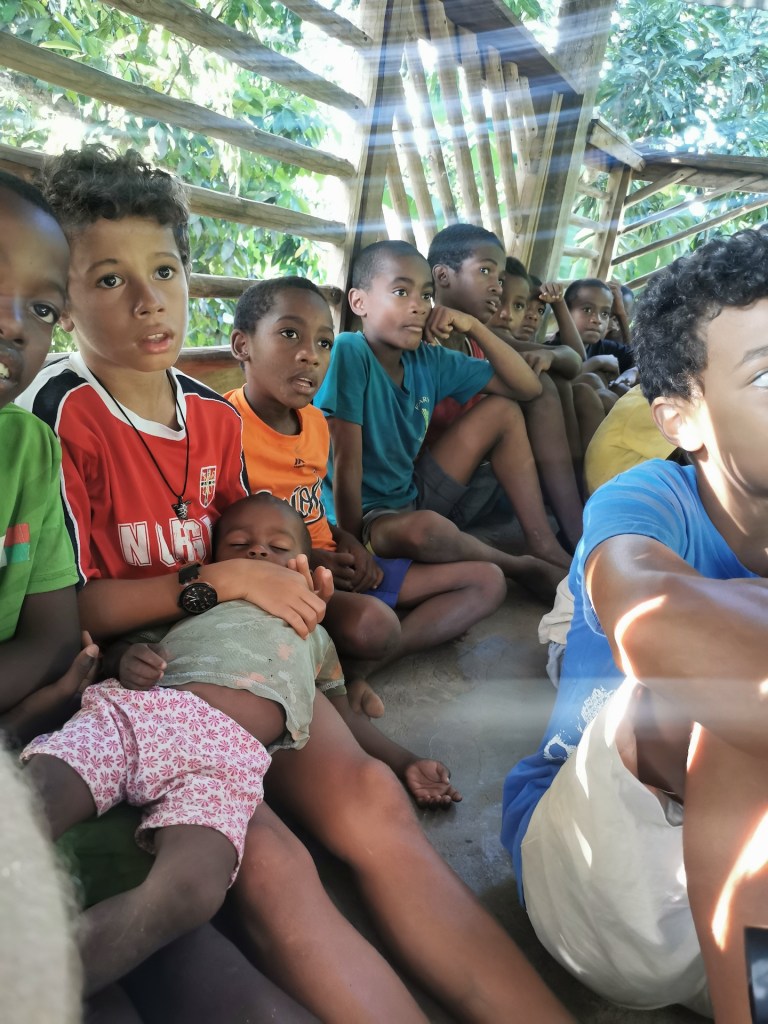 Cet après-midi, nous accompagnons Nathalia pour l’animation du groupe enfants du village. Nous nous retrouvons dans un petit abri avec une cinquantaine de jeunes, de 2 à 15 ans. C’est rigolo de voir nos deux filles au milieu de tous ces petits malgaches. La plupart ne savent pas parler français mais ça ne pose pas de problème, elles sont vite intégrées. Il y a d’abord une lecture d’une histoire biblique en malgache par Nathalia (celle de Moïse), accompagnée d’un extrait du film de Disney, Moïse prince d’Egypte. Puis, après quelques animations et chants, nous terminons ce moment par quelques jeux à l’extérieur. La tâche de Nathalia n’est pas simple car elle ne sait jamais combien d’enfants elle aura, et il y a du va et vient continuellement. Cependant, bien des paroisses en Europe désireraient ardemment pouvoir toucher un si grand nombre d’enfants…