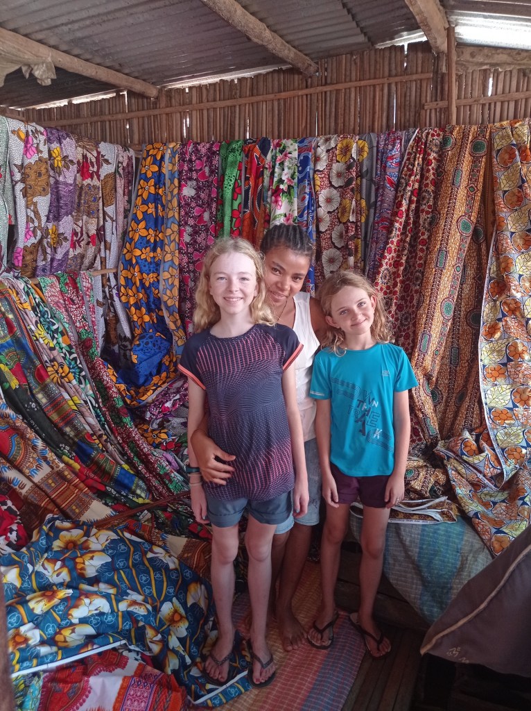 Le programme d’aujourd’hui est très basique après la grande journée de fête d’hier. Au menu, farniente et rapide passage à Hell-Ville afin de déposer les tissus, achetés au marché il y a quelques jours, chez une tailleuse. Elle en profitera pour prendre les mesures de tout le monde car Philippe et Gabrielle ont également décidé de commander respectivement un pantalon et une robe. Une fois cela fait, le reste de la journée se passe à jouer, papoter et profiter de ce temps ensemble.