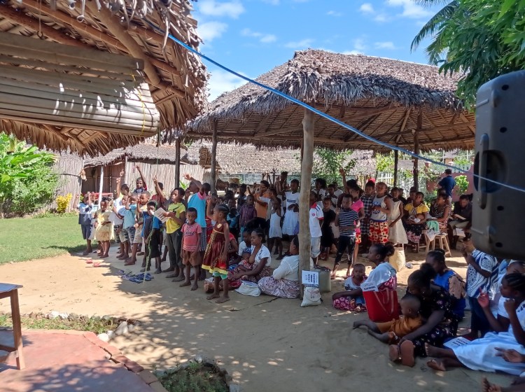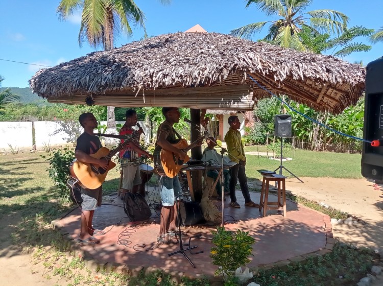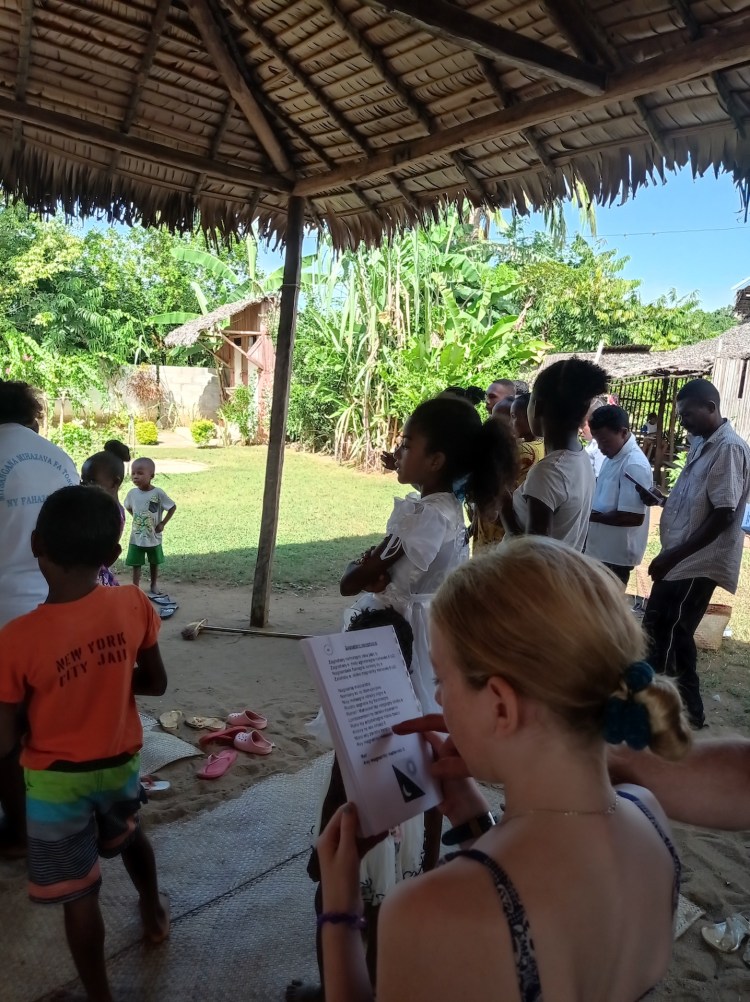 En ce jour du dimanche de Pentecôte, nous allons vivre un moment spécial dans la vie de la paroisse d’Ambatozavavy. Le culte va célébrer plusieurs baptêmes de personnes venant des différentes églises de la région. Non pas des baptêmes de jeunes enfants, mais d’adultes qui ont fait le choix de rejoindre la communauté officiellement et de laisser derrière eux leurs croyances animistes. Ce sont majoritairement des femmes qui ont fait ce choix, dont six du village. Pour l’occasion, nous nous retrouvons tous dans la cour d’un bâtiment, assez grand pour accueillir tout le monde. Le culte démarre avec environ une heure de retard et nous sommes une centaine. Nous tentons de suivre mais c’est compliqué car tout est en sakalava, le dialecte de Nosy Be 😅. Il y a de nombreux chants, des témoignages des futur.e.s baptisé.e.s ainsi qu’un message biblique.