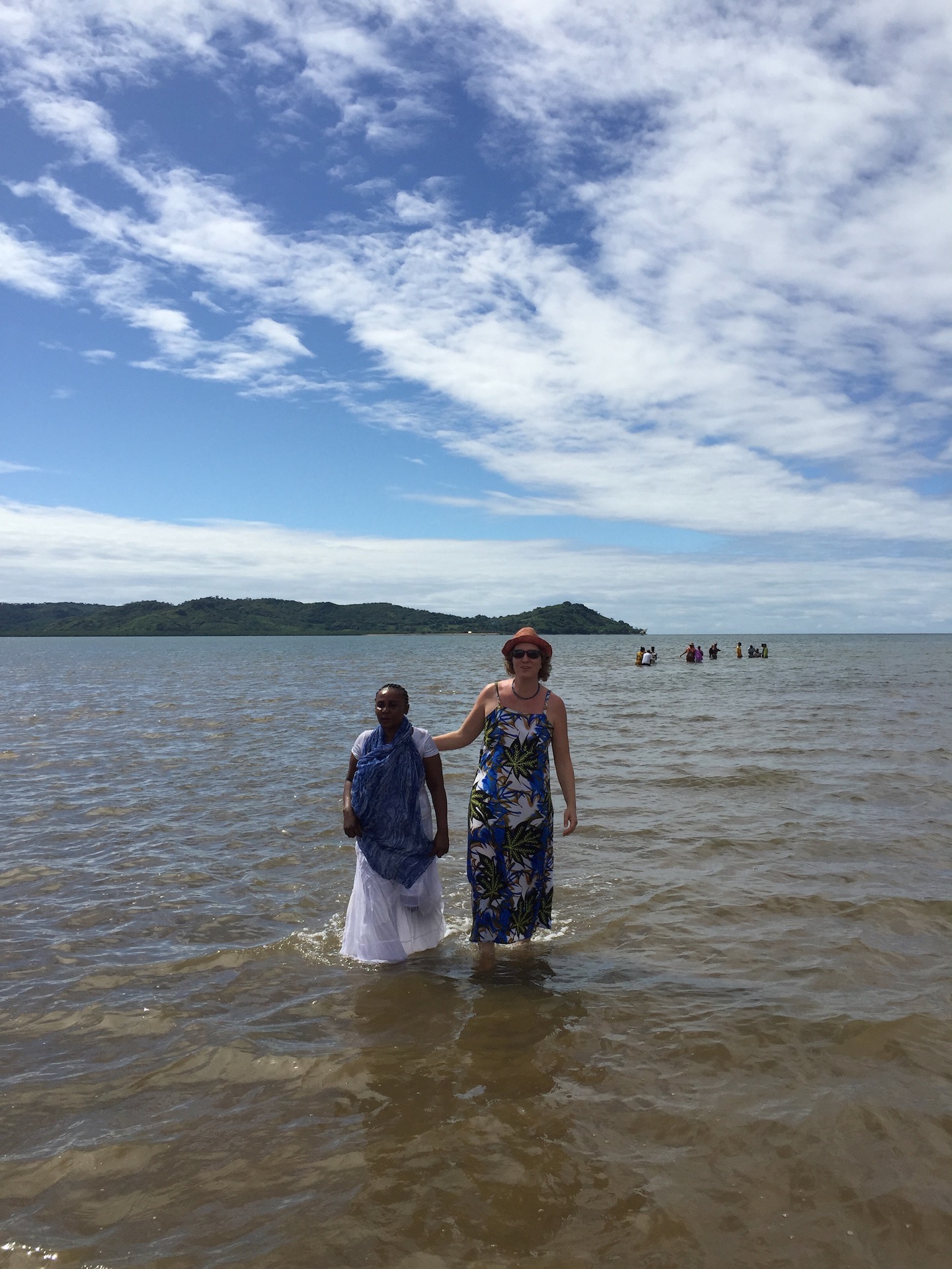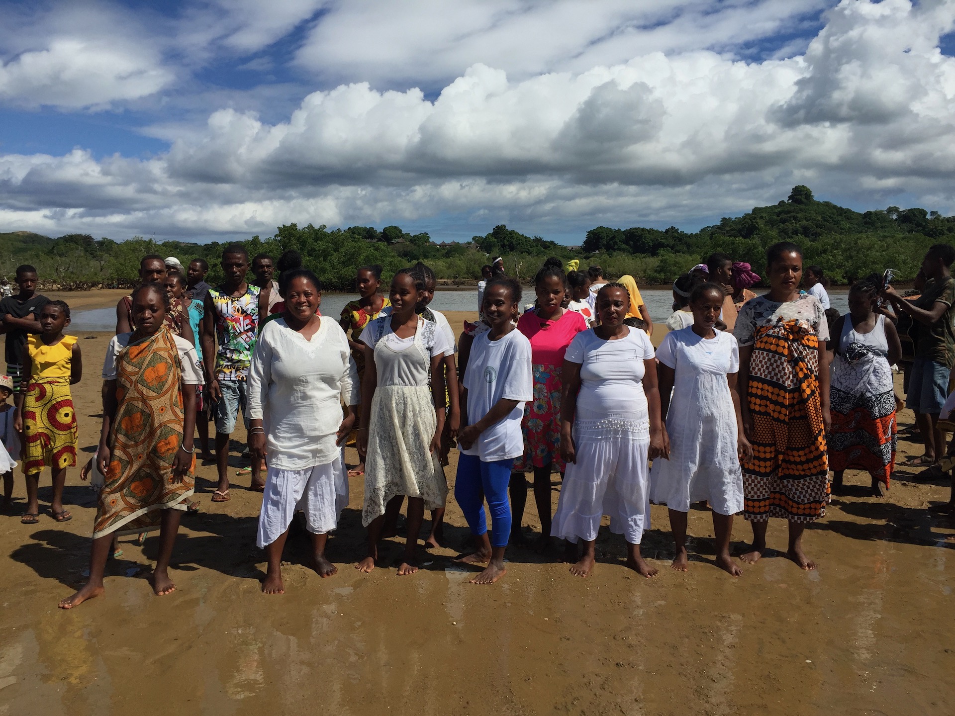 Une fois ce moment de culte terminé, tout le monde se déplace à une quinzaine de minutes du village, afin de rejoindre un endroit de la côte, où les paroissiens vont pouvoir recevoir le baptême, directement dans l’eau de la mer. Il faut savoir qu’il est déconseillé de se baigner aux abords immédiats du village car l’eau n’y est pas propre, certains habitants faisant leurs besoins directement dedans… Accompagnés de chants et de musique, c’est un moment émouvant de voir ces personnes recevoir les unes après les autres le baptême par immersion.