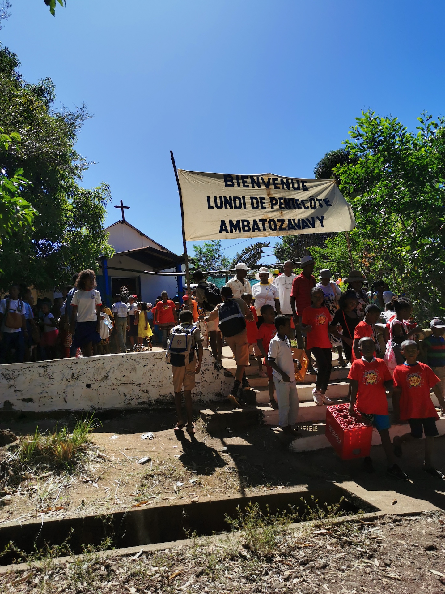 En ce lundi de Pentecôte, nous sommes réveillés par une étrange procession qui se présente au village. Elle est partie de Hell-Ville tôt ce matin pour arriver à pied à Ambatozavavy aux alentours de 8h30. Une fois arrivés sur la place du village, ce cortège fait le tour de la fontaine (qui a été repeinte par des employés municipaux le jour d’avant) puis il repart en direction de l’église catholique. Là bas, de nombreux stands et un grand repas y est organisé, avec de la musique. C’est une procession traditionnelle qui a lieu chaque année et qui amène beaucoup de monde, même si le choix du village comme destination finale reste mystérieux…
