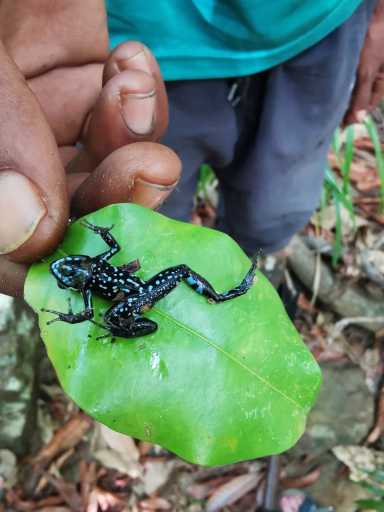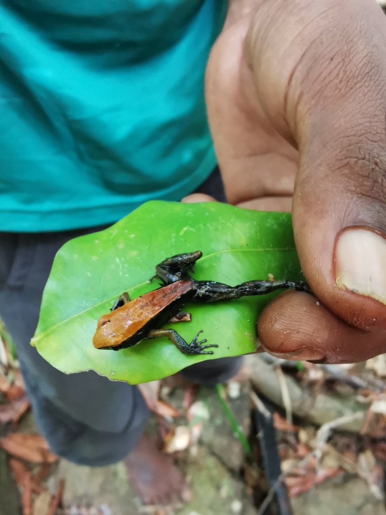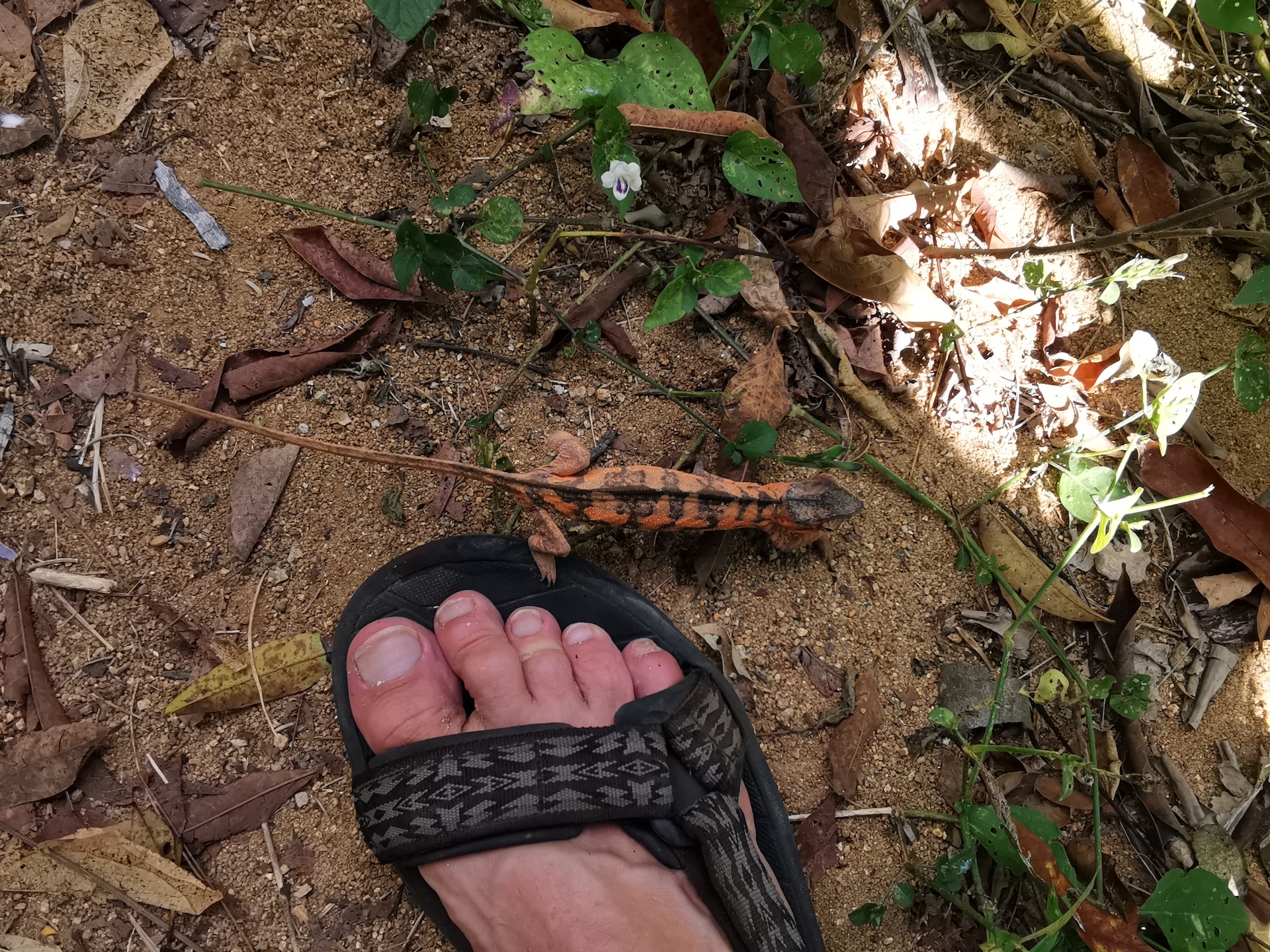 Après cette jolie balade au fil de l’eau et ce premier contact avec le parc national, nous rentrons nous reposer un moment dans notre bungalow. Nous profitons de ce temps libre et du calme pour avancer un peu dans le travail scolaire avec les filles. Notre souper nous est livré tôt, vers 17h30, car nous avons bientôt rendez-vous avec un guide pour une sortie de nuit. Ce soir, nous avons droit à des brochettes de zébu, du riz et des haricots, c’est très bon 😋! Une fois nos ventres bien remplis, nous partons pour notre deuxième activité de la journée, une sortie nocturne dans les sentiers du parc afin d’y découvrir la faune dans le noir. Ces sorties de nuit sont toujours très sympas et nous nous réjouissons de déambuler à la recherche des animaux à la lumière de nos torches. Pas besoin de veiller tard pour qu’il fasse noir, dès 18h la nuit est bien présente, ce qui nous arrange bien. Nous retrouvons notre guide et nous partons pour environ 1h30 de marche dans la forêt. Les sentiers sont bien marqués et balisés et nous n’avons aucune peine à nous déplacer, nos regards pouvant se concentrer sur les environs. Le guide ne tarde pas à nous montrer plusieurs petits lézards, dont le plus petit de l’île, qui fait à peine 5cm 🦎.