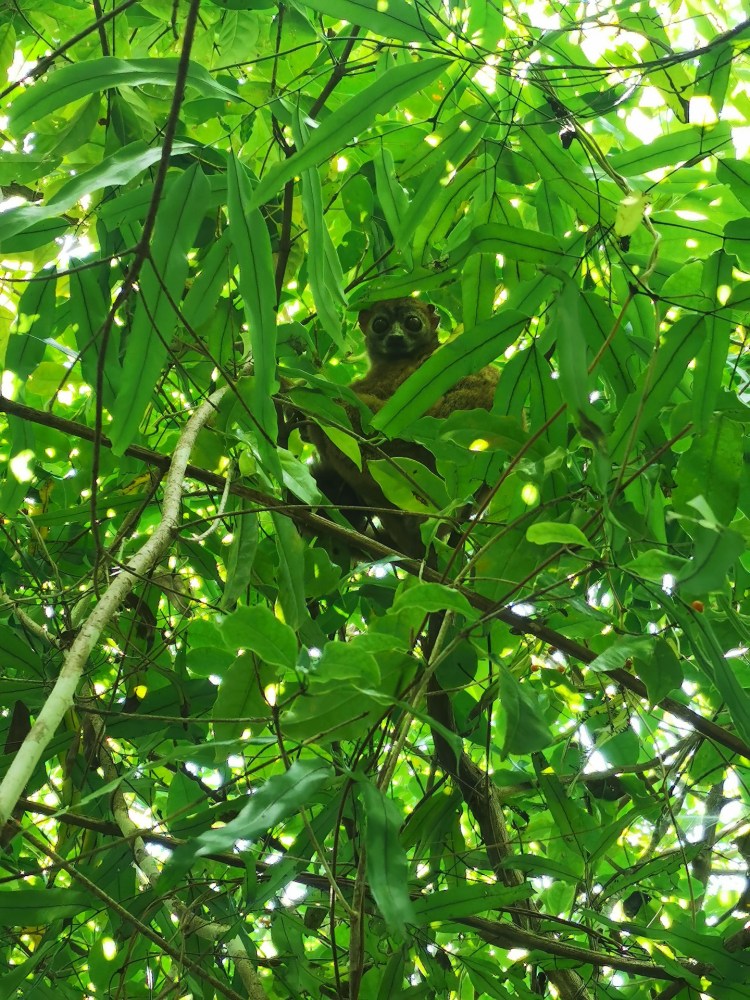 Alors que nous quittons le site de la cascade, nous avons le plaisir d’observer tout un groupe de lémuriens (une quinzaine) qui se trouvent au-dessus de nos têtes dans la canopée. Il s’agit d’eulemur fulvus sanfordi qui se déplacent à une vitesse folle, sautant d’arbre en arbre, sans se préoccuper de nous.