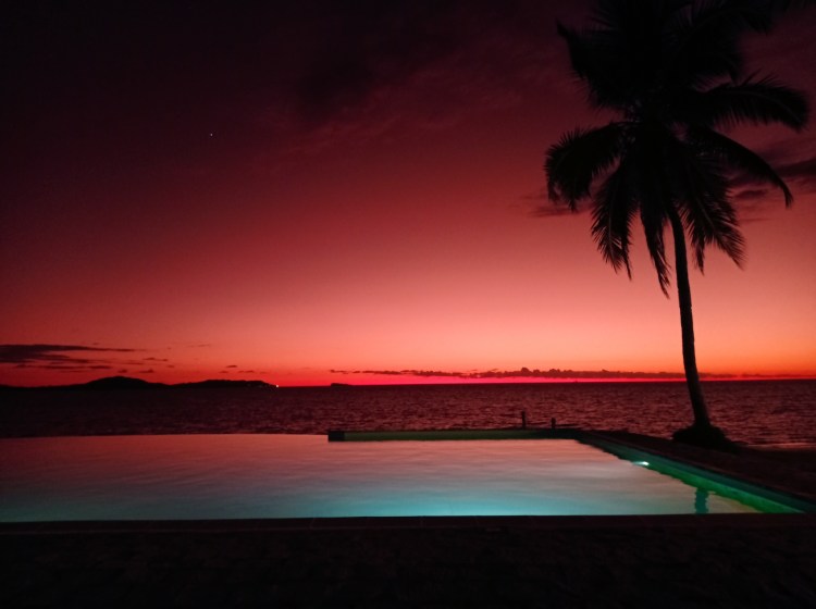 Après cette inoubliable matinée sous-marine, nous rentrons en début d’après-midi à Ambondrona. Nos ventres commençant sérieusement à gronder, nous prenons le dîner dans l’hôtel Nosy Lodge qui se trouve juste à côté de notre auberge de jeunesse. C’est un très bel hôtel avec piscine 🤩. C’est l’occasion de manger un bon repas d’anniversaire et surtout un délicieux gâteau préparé par Nathalia pour fêter comme il se doit le jubilaire 🎂! Nous pouvons également profiter de la piscine et de ses transats, même si l’eau est plutôt très fraîche! Comme les touristes sont encore rares, nous n’avons pas vraiment de concurrence pour les transats ou la baignade 😎.