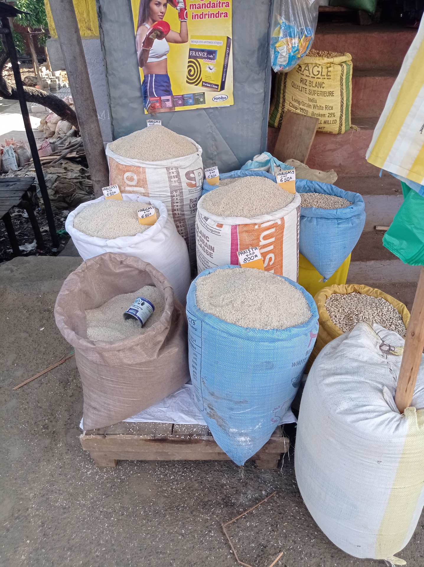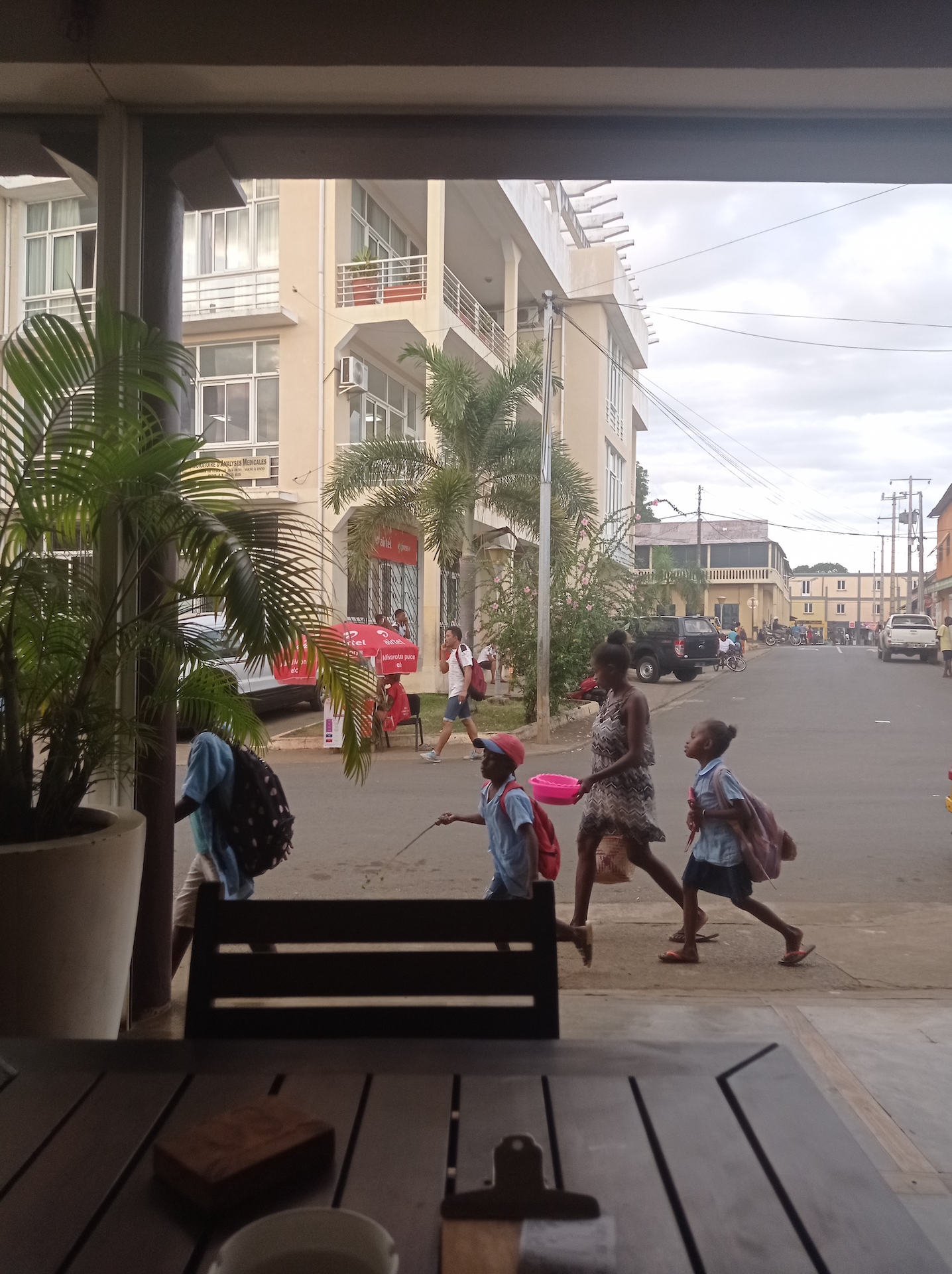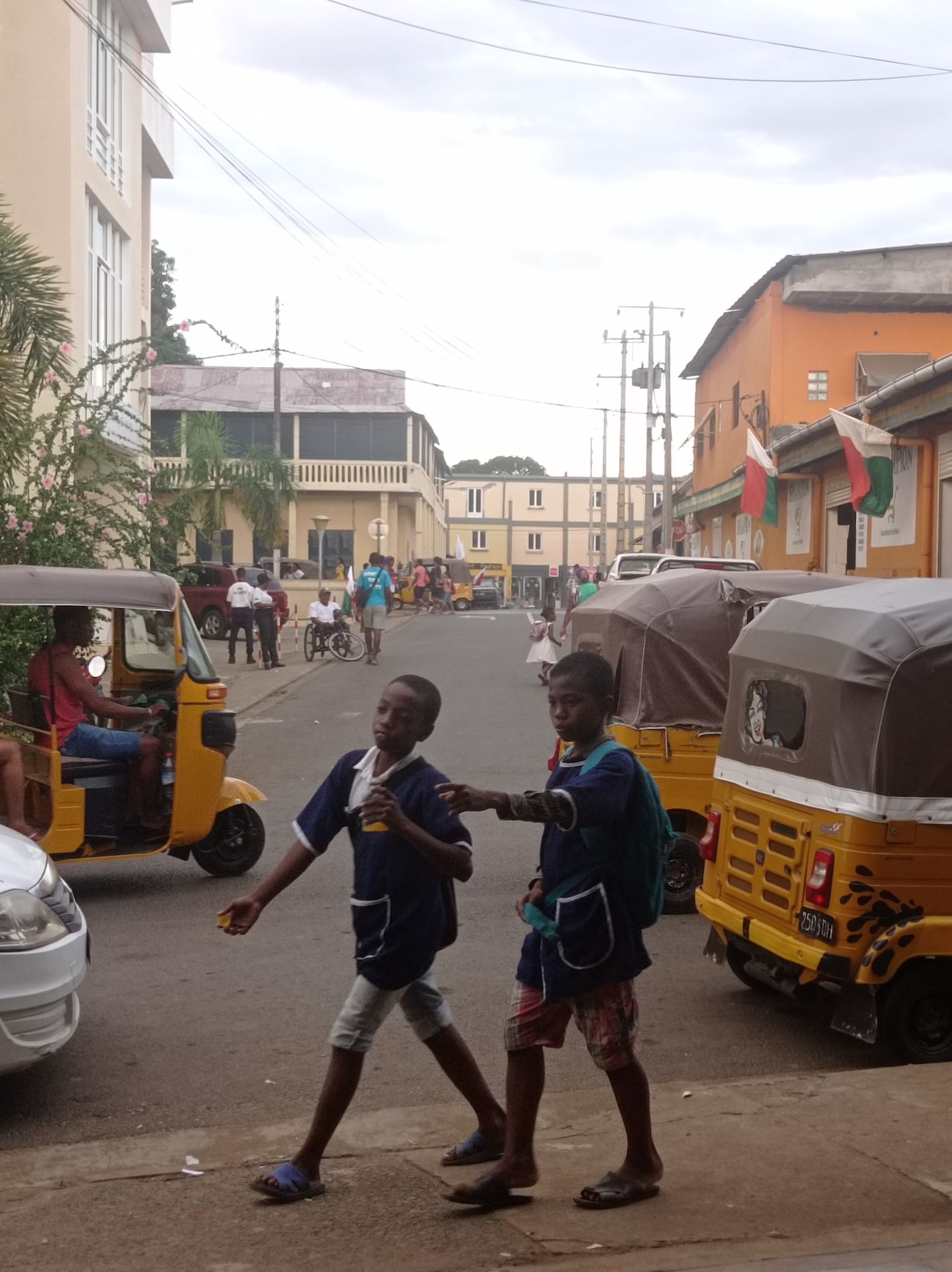 Aujourd’hui, nous commençons la journée en compagnie de Haingo. Elle nous accompagne en ville afin de trouver les médicaments qu’il nous manque, changer nos dollars en ariary, la monnaie locale (prononcé « ariar », car on ne prononce généralement pas les dernières lettres des mots en malagasy), et faire quelques courses. La Malarone étant rarement utilisée par les locaux, nous devons visiter trois pharmacies afin de réussir à acheter nos trois boîtes 💊(chacune n’en a à chaque fois qu’une seule en stock…). C’est également très compliqué de trouver de la crème solaire, denrée rare et chère dans la région, mais indispensable pour nos peaux de Vazahas (c’est le terme utilisé à Madagascar pour désigner l’étranger blanc d’origine européenne. Terme qui sera souvent utilisé pour nous désigner durant notre séjour). Enfin, après comparaison des taux de change, nous trouvons une banque pour changer nos dollars, même si ce n’est pas si simple 💵. Il nous faut en effet patienter près de 20 minutes, présenter nos passeports et remplir divers papiers. Mais au final, c’est une matinée couronnée de succès, même s’il nous aura fallu de la patience pour accomplir toutes nos tâches.