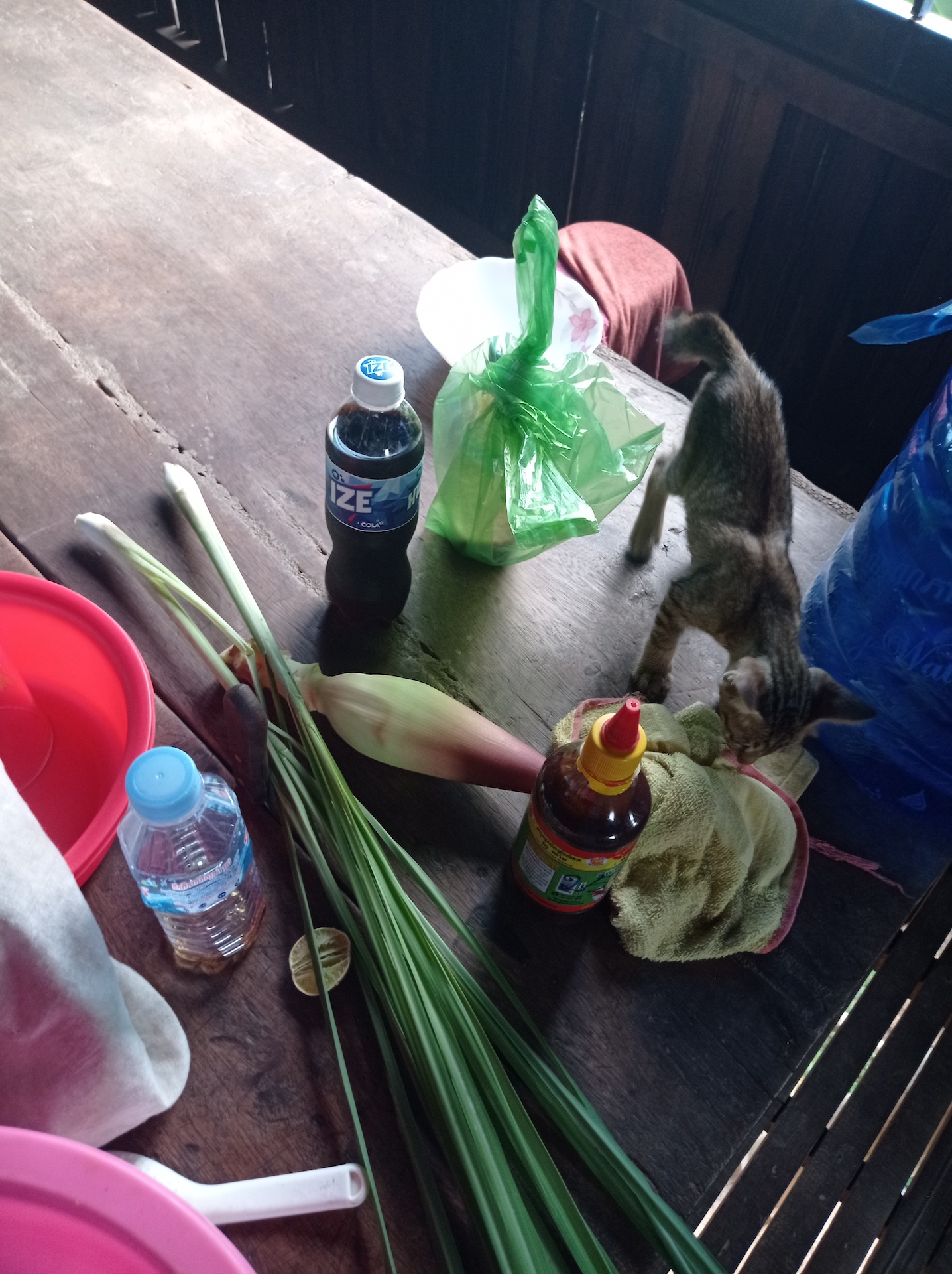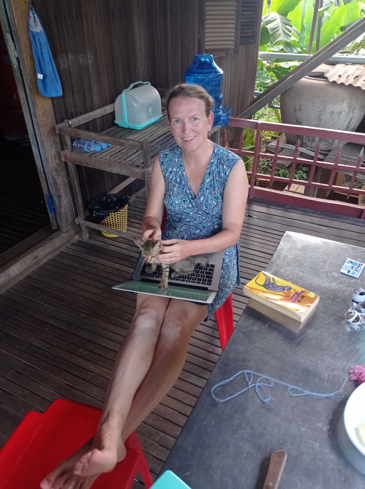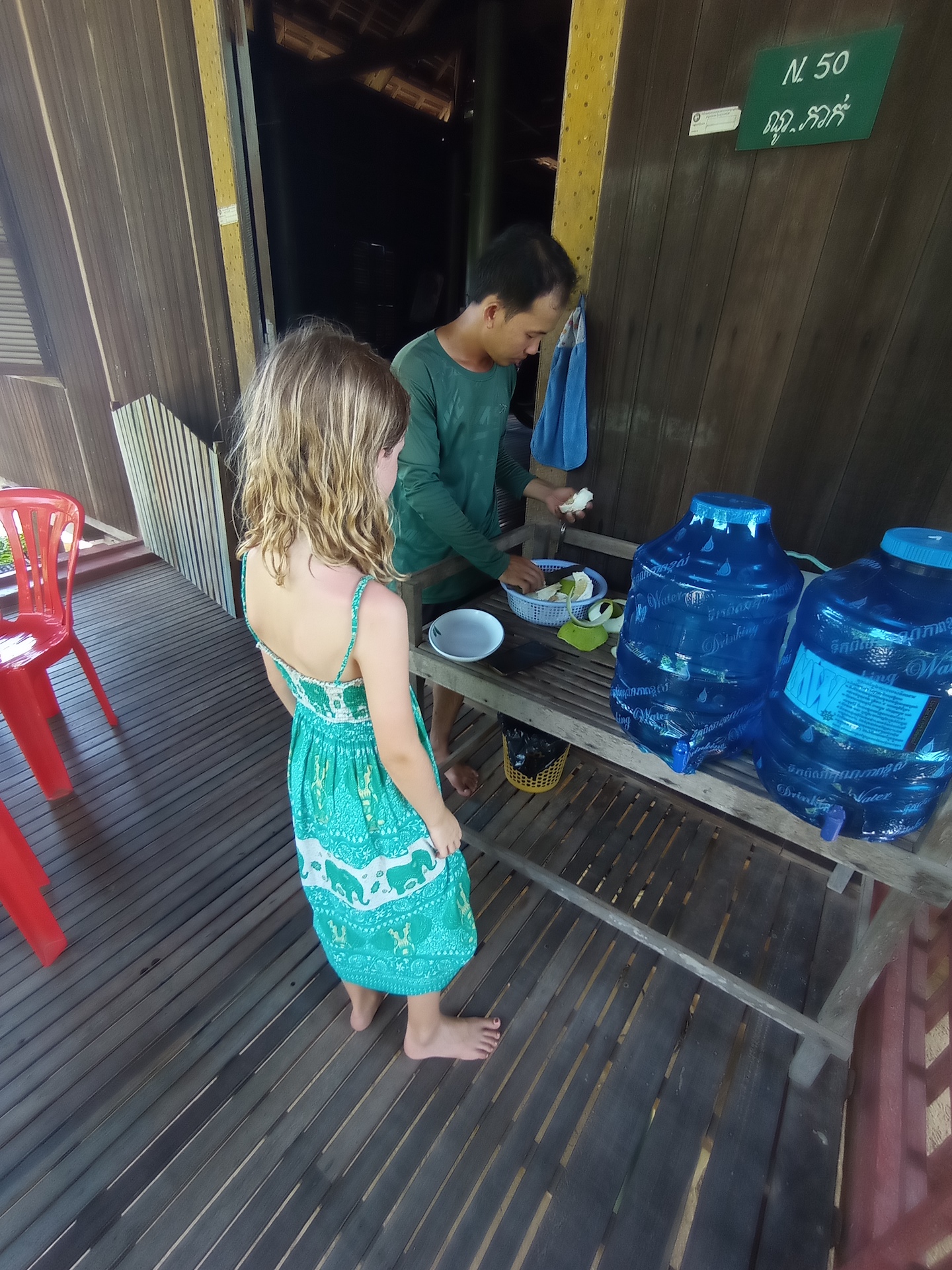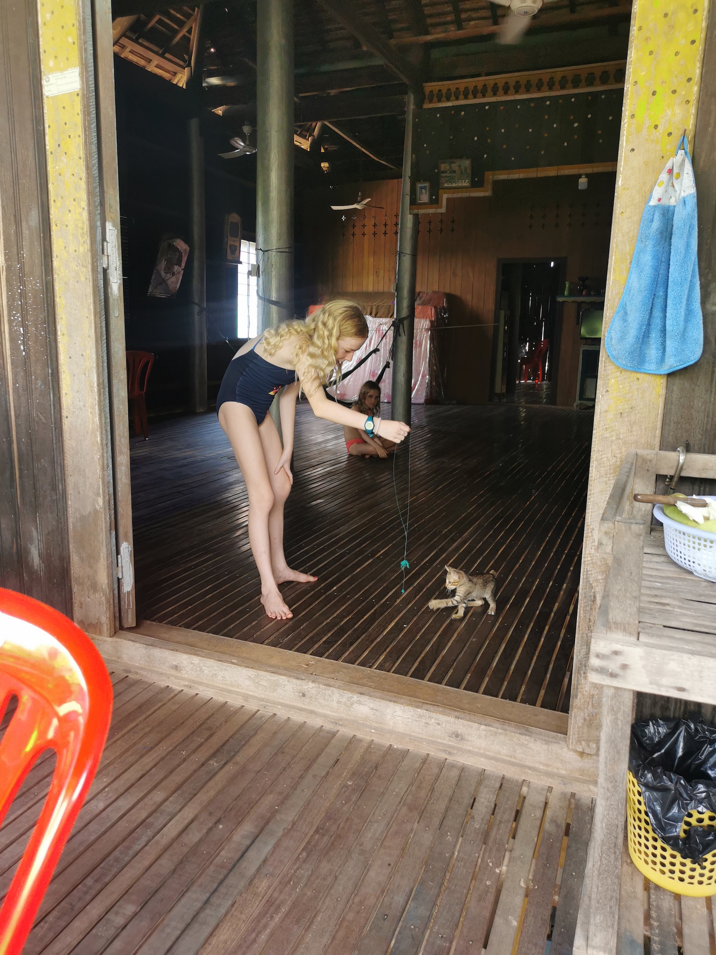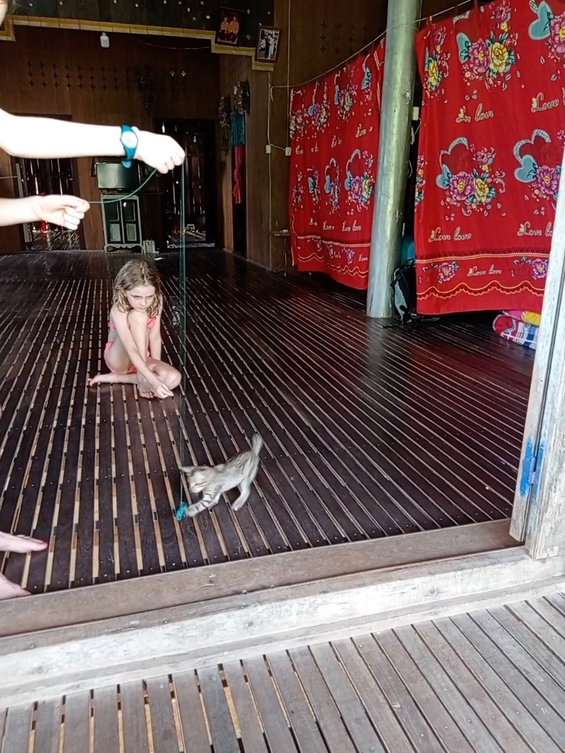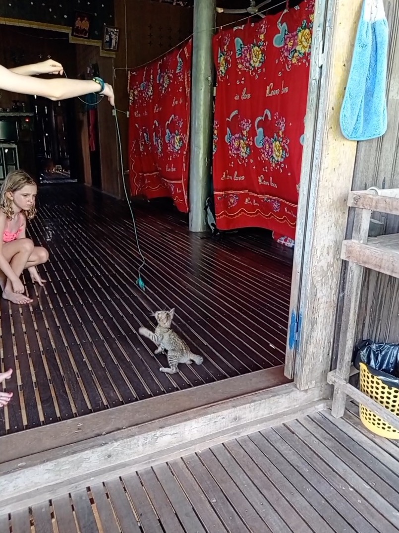 A la fin de la sortie, nous dînons dans un restaurant tout simple sur la terre ferme avant de reprendre la barque pour rejoindre l’île de Koh Trong en milieu d’après-midi Une fois chez Virek, nous en profitons pour nous reposer un peu, lire, avancer le blog, faire un peu d’école et, bien sûr, jouer avec Ficelle 🐱.