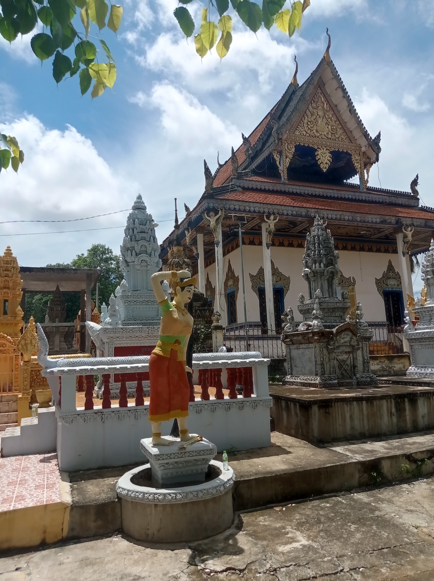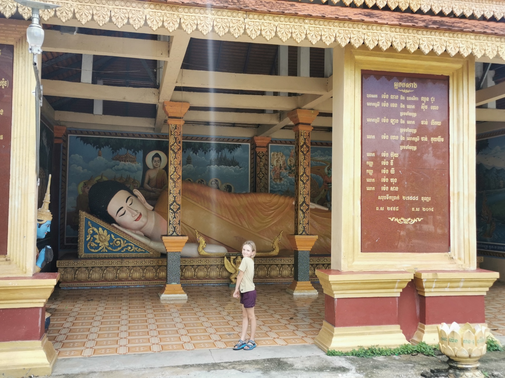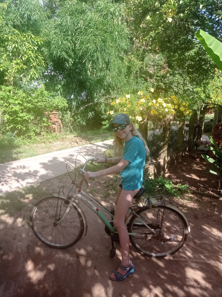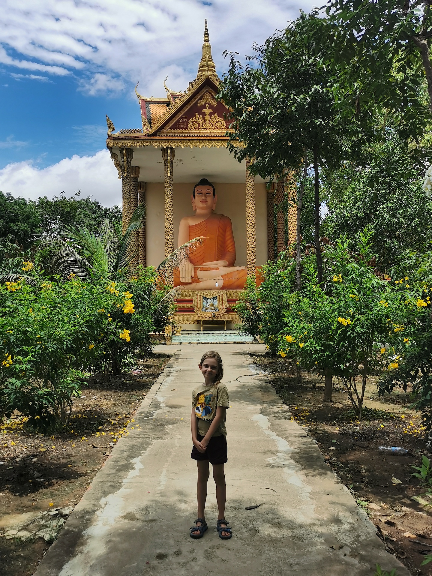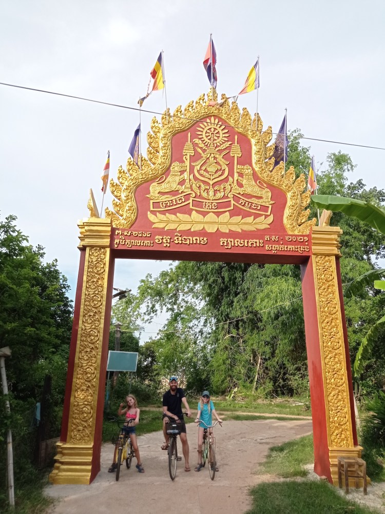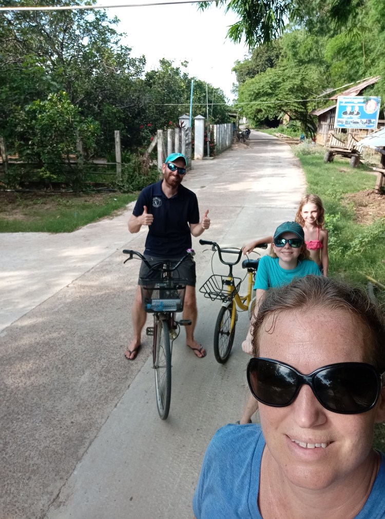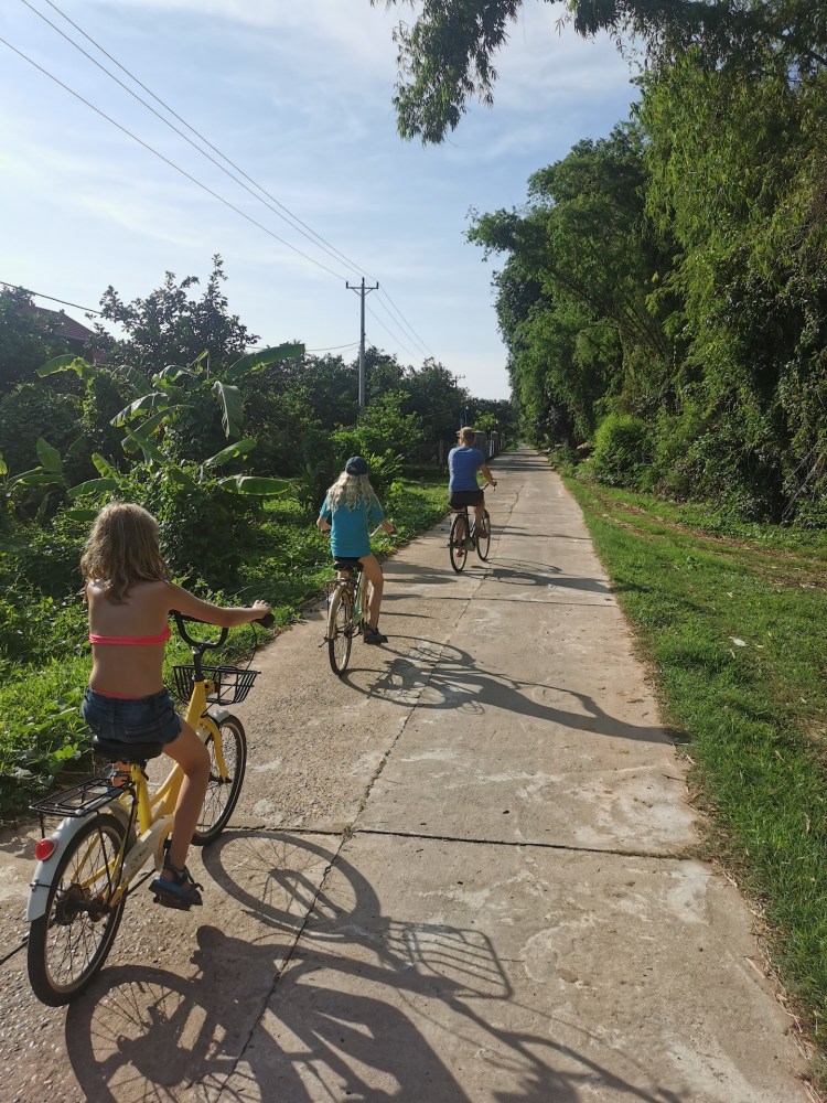 Une fois la dégustation terminée, notre hôte nous propose de partir à la découverte de l’île et quoi de mieux pour le faire qu’à vélo? Il s’éclipse rapidement chez des voisins afin de nous dégoter des vélos adaptés aux filles et nous partons tous les quatre sur la seule route de l’île. Une petite boucle de 9km environ nous attend, le tout à plat (heureusement vu l’âge de nos vélos…). Notre rythme est très tranquille, c’est un rythme de découverte et d’admiration des lieux. Nous n’hésitons pas à nous arrêter afin d’observer les gens dans les champs, les quelques temples ou encore une partie de volley (sport très apprécié car nous avons vu un peu partout au Cambodge des personnes s’y adonner en fin de journée). Nous peinons à trouver l’arbre aux chauves-souris géantes dont nous a parlé Virek… Raté, cette fois nous n’en verrons pas, car nous n’arrivons pas à trouver ce satané arbre 🤦🤦🏼♀️ ! Partis avec nos maillots de bain, nous renonçons cependant à nous baigner, les eaux brunes du Mékong ne nous attirant que très peu 🙃.