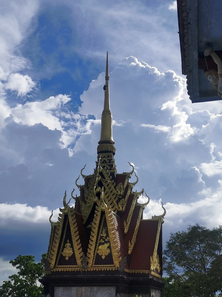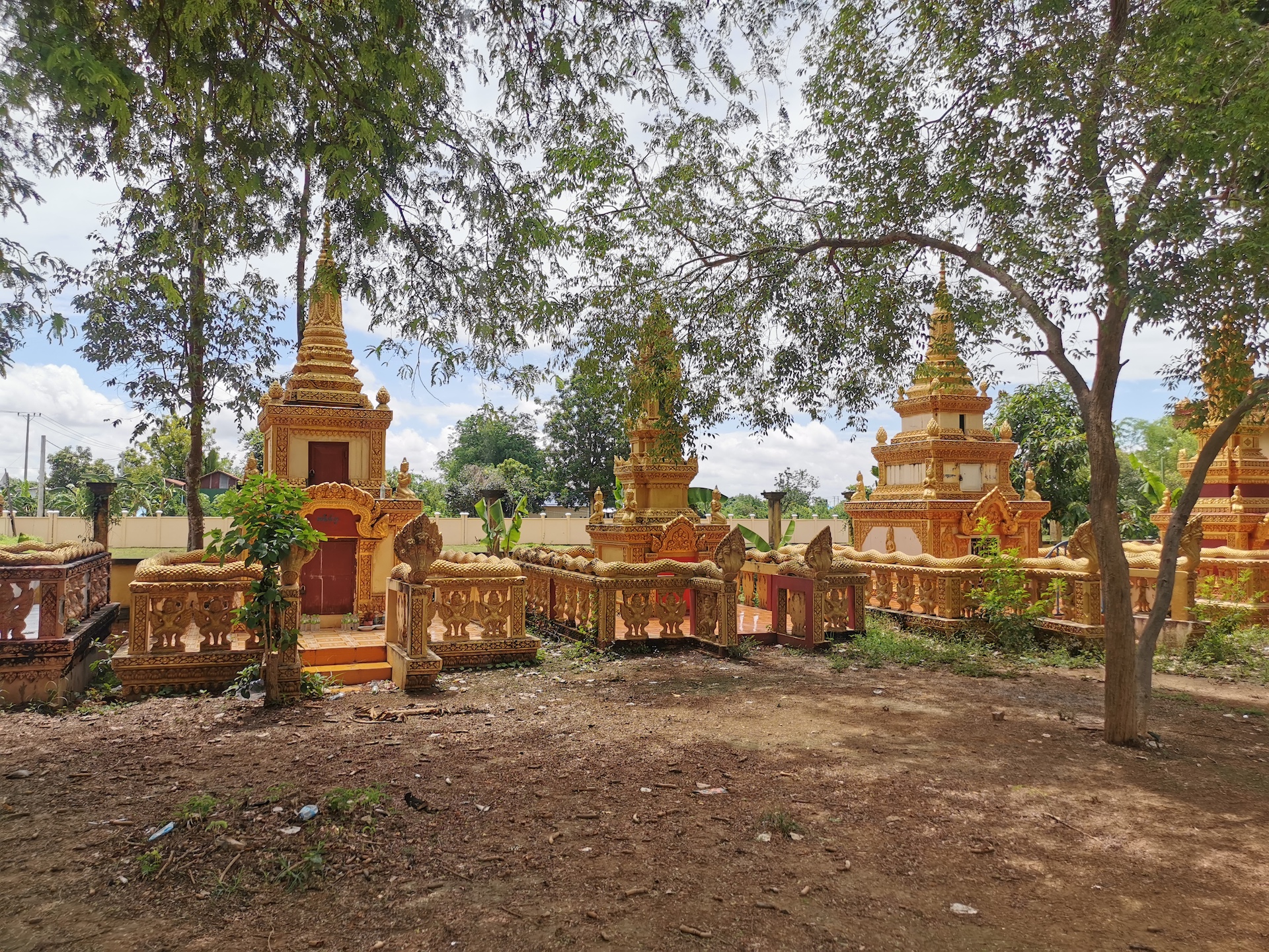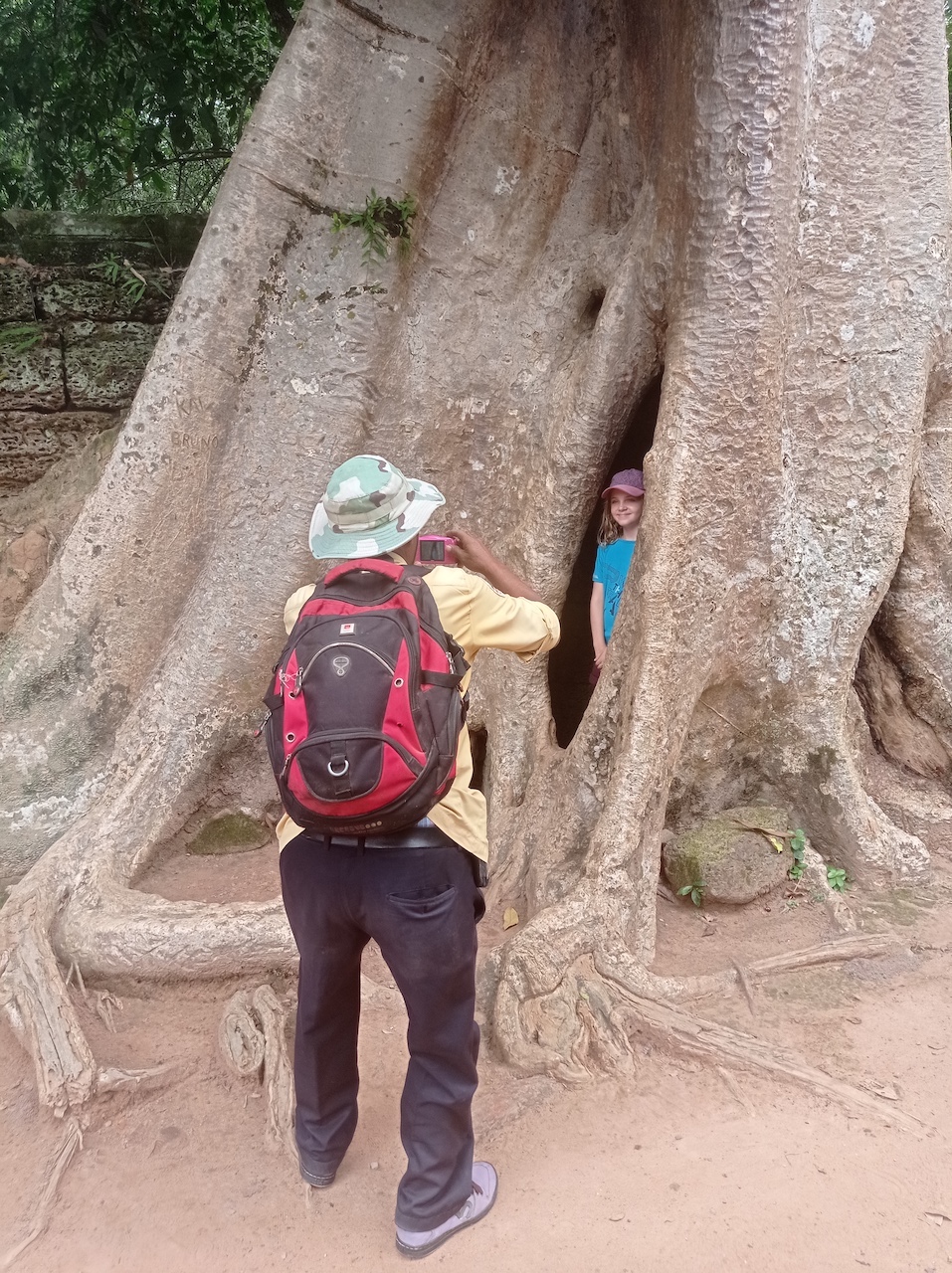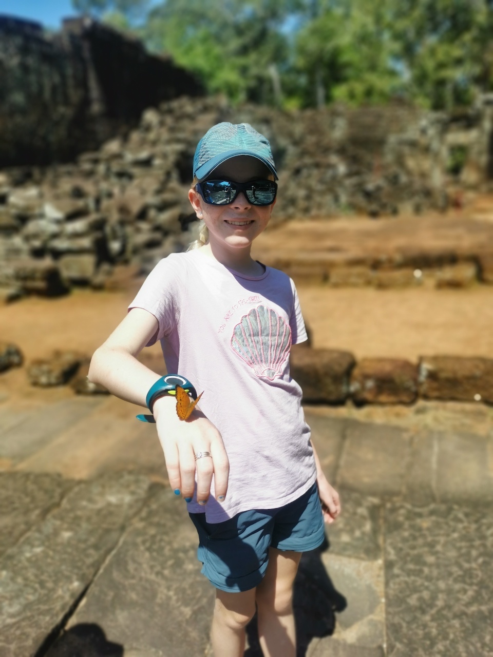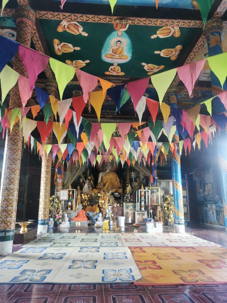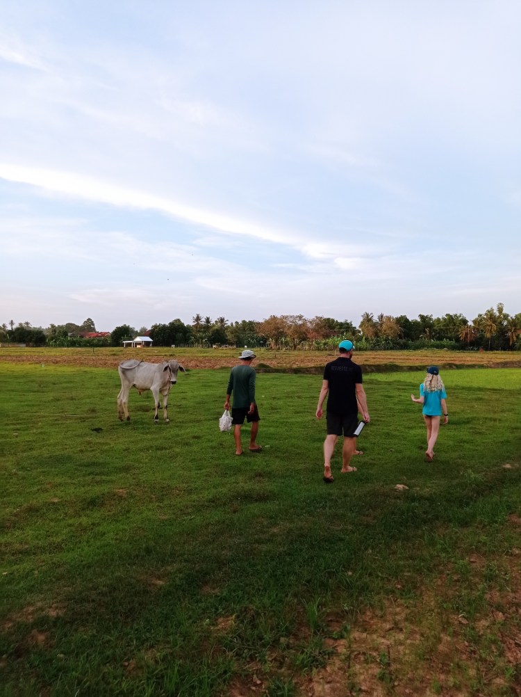 Une fois la dégustation terminée, notre hôte nous propose de partir à la découverte de l’île et quoi de mieux pour le faire qu’à vélo? Il s’éclipse rapidement chez des voisins afin de nous dégoter des vélos adaptés aux filles et nous partons tous les quatre sur la seule route de l’île. Une petite boucle de 9km environ nous attend, le tout à plat (heureusement vu l’âge de nos vélos…). Notre rythme est très tranquille, c’est un rythme de découverte et d’admiration des lieux. Nous n’hésitons pas à nous arrêter afin d’observer les gens dans les champs, les quelques temples ou encore une partie de volley (sport très apprécié car nous avons vu un peu partout au Cambodge des personnes s’y adonner en fin de journée). Nous peinons à trouver l’arbre aux chauves-souris géantes dont nous a parlé Virek… Raté, cette fois nous n’en verrons pas, car nous n’arrivons pas à trouver ce satané arbre 🤦🤦🏼♀️ ! Partis avec nos maillots de bain, nous renonçons cependant à nous baigner, les eaux brunes du Mékong ne nous attirant que très peu 🙃.