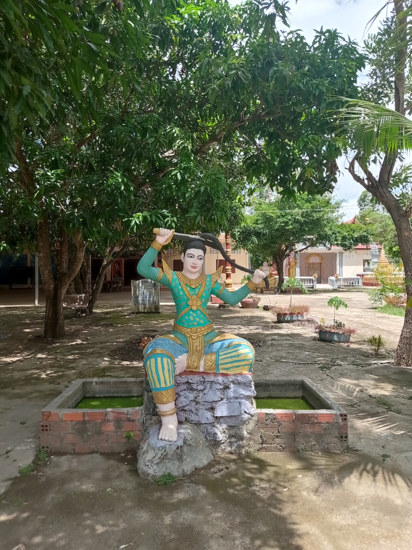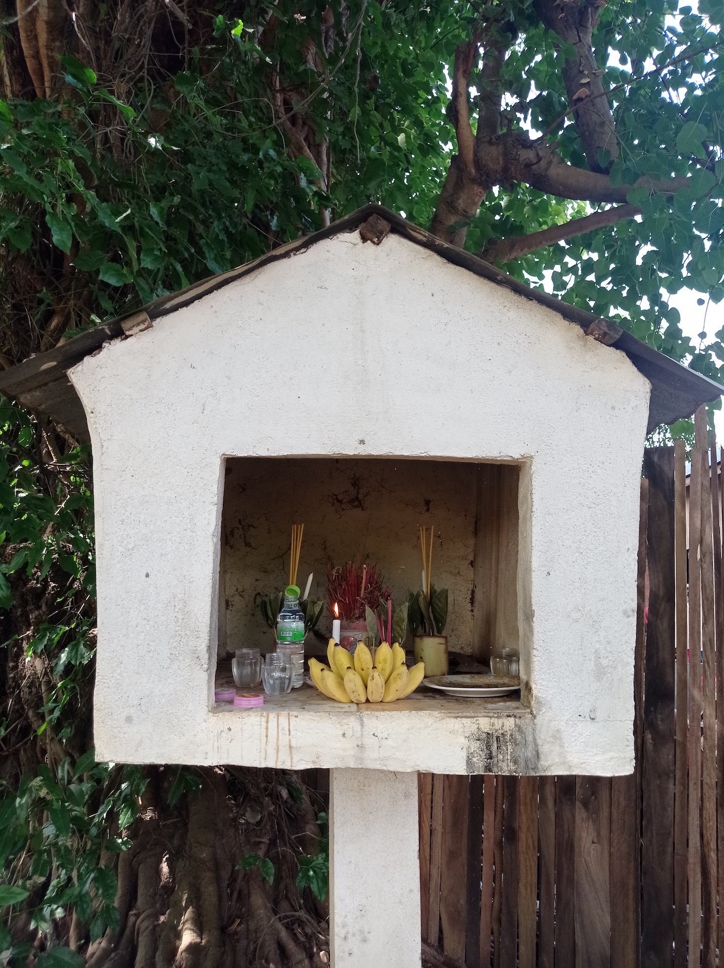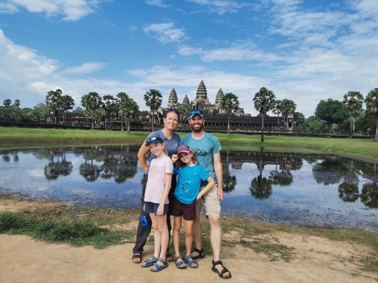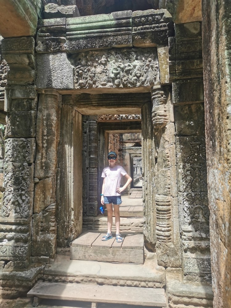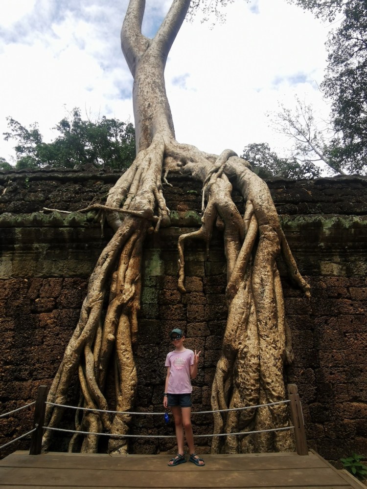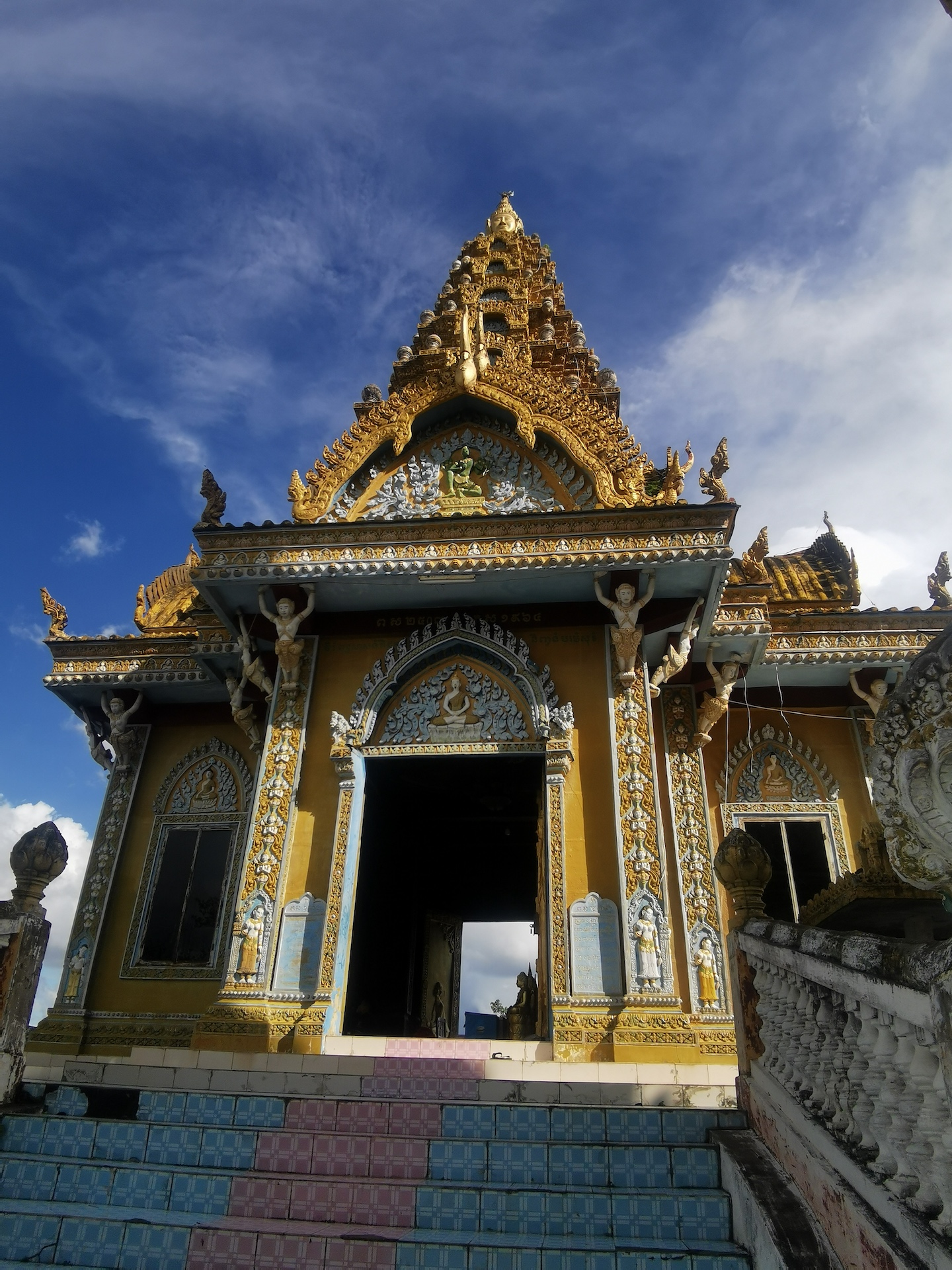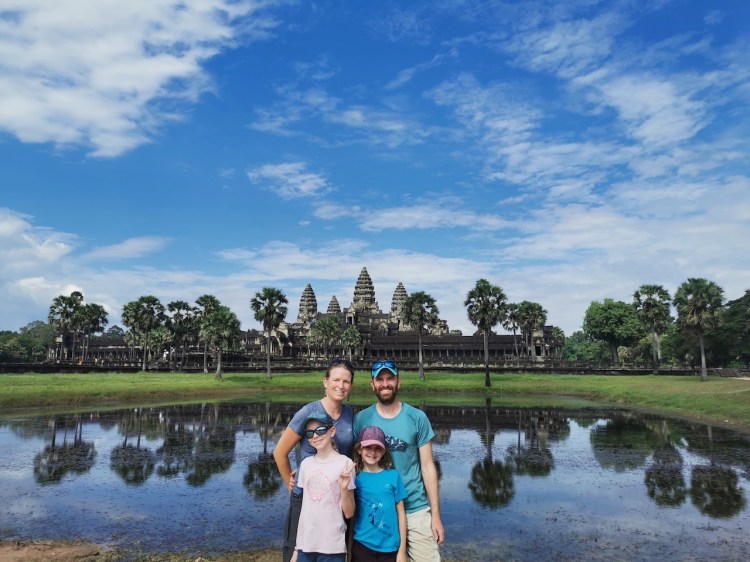 Une fois la dégustation terminée, notre hôte nous propose de partir à la découverte de l’île et quoi de mieux pour le faire qu’à vélo? Il s’éclipse rapidement chez des voisins afin de nous dégoter des vélos adaptés aux filles et nous partons tous les quatre sur la seule route de l’île. Une petite boucle de 9km environ nous attend, le tout à plat (heureusement vu l’âge de nos vélos…). Notre rythme est très tranquille, c’est un rythme de découverte et d’admiration des lieux. Nous n’hésitons pas à nous arrêter afin d’observer les gens dans les champs, les quelques temples ou encore une partie de volley (sport très apprécié car nous avons vu un peu partout au Cambodge des personnes s’y adonner en fin de journée). Nous peinons à trouver l’arbre aux chauves-souris géantes dont nous a parlé Virek… Raté, cette fois nous n’en verrons pas, car nous n’arrivons pas à trouver ce satané arbre 🤦🤦🏼♀️ ! Partis avec nos maillots de bain, nous renonçons cependant à nous baigner, les eaux brunes du Mékong ne nous attirant que très peu 🙃.
