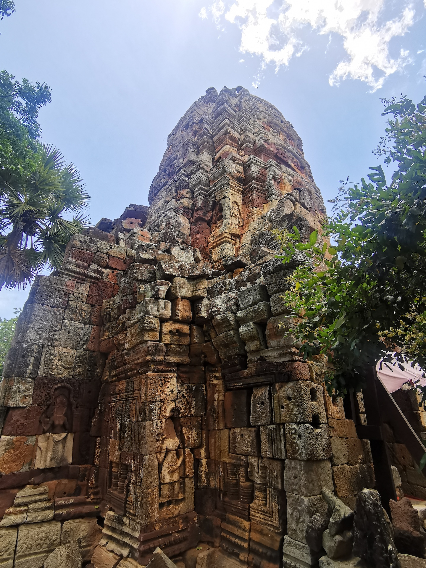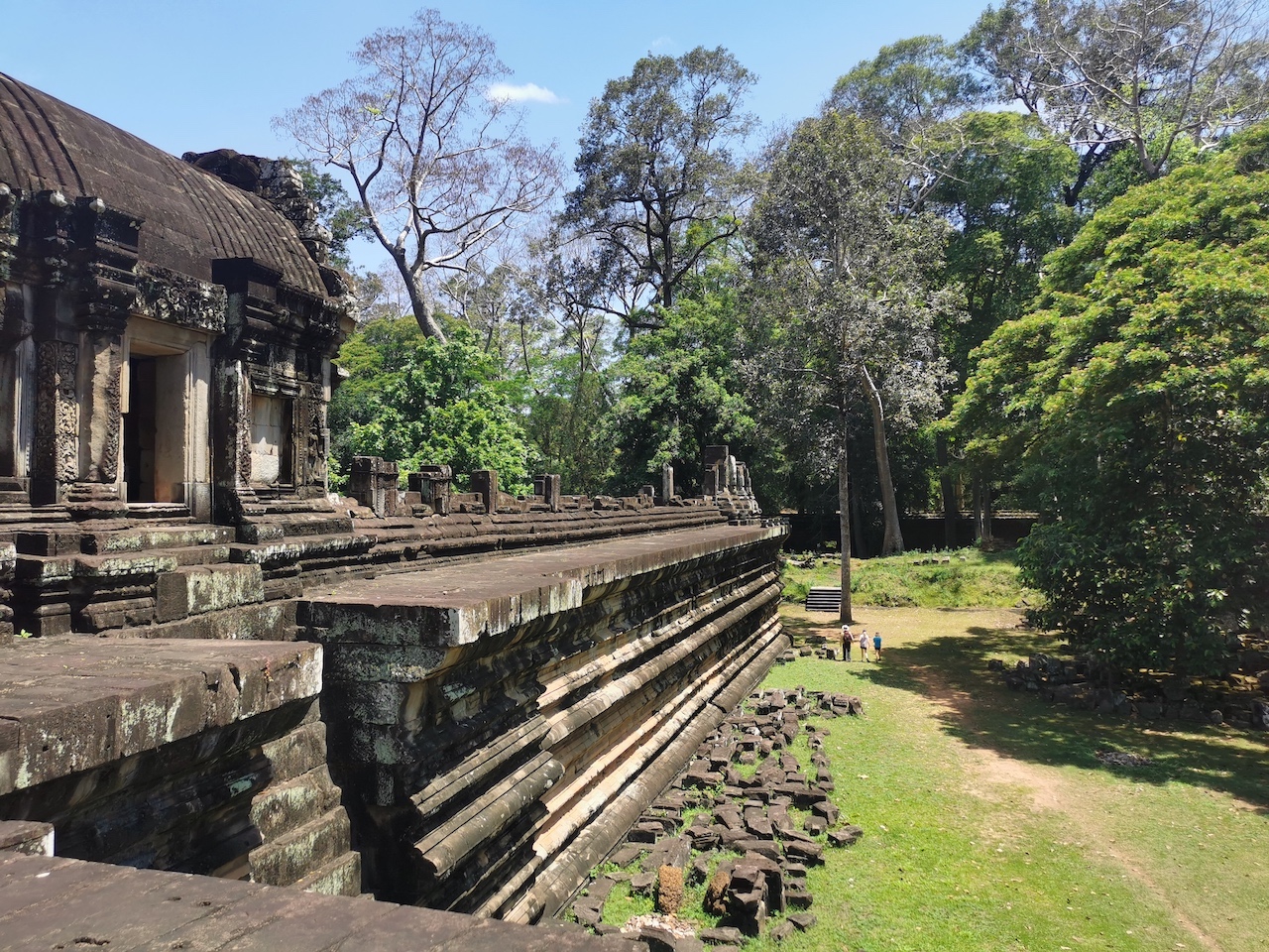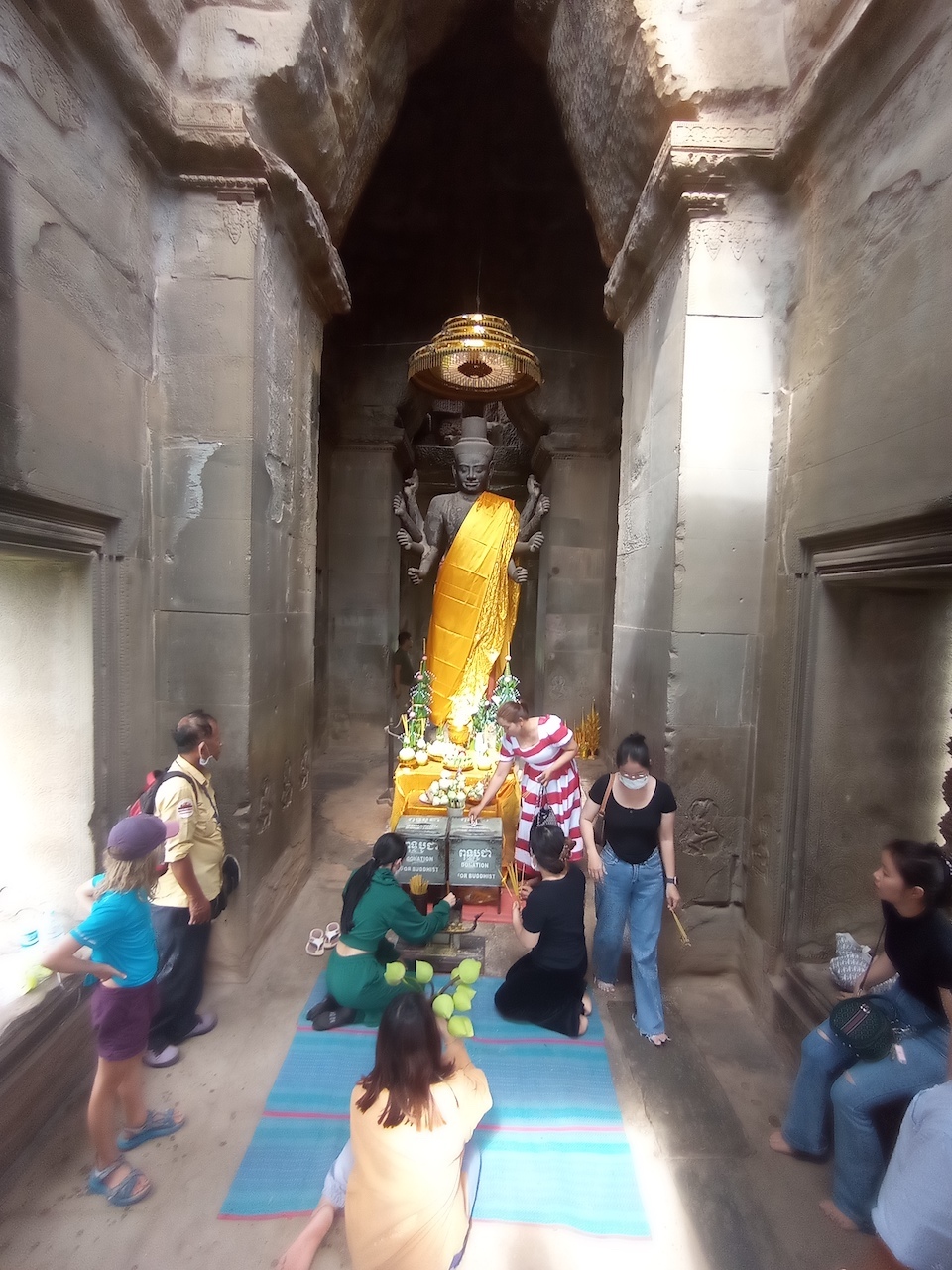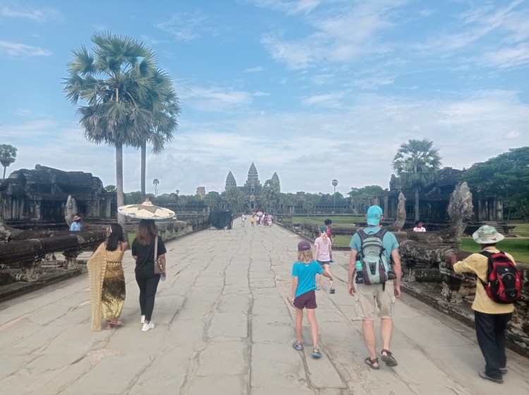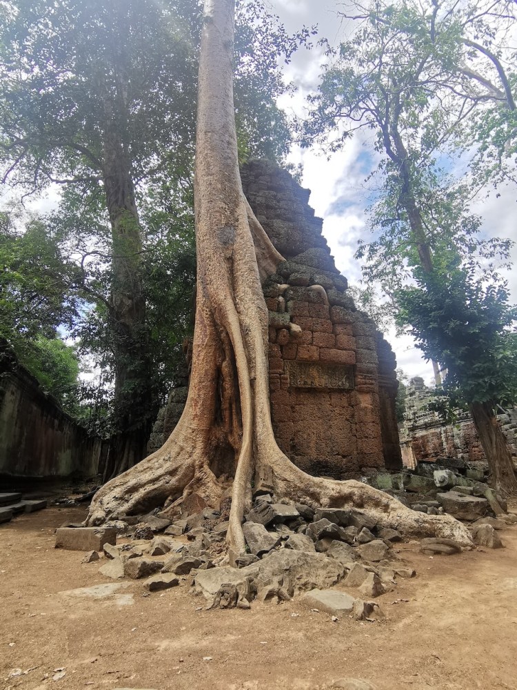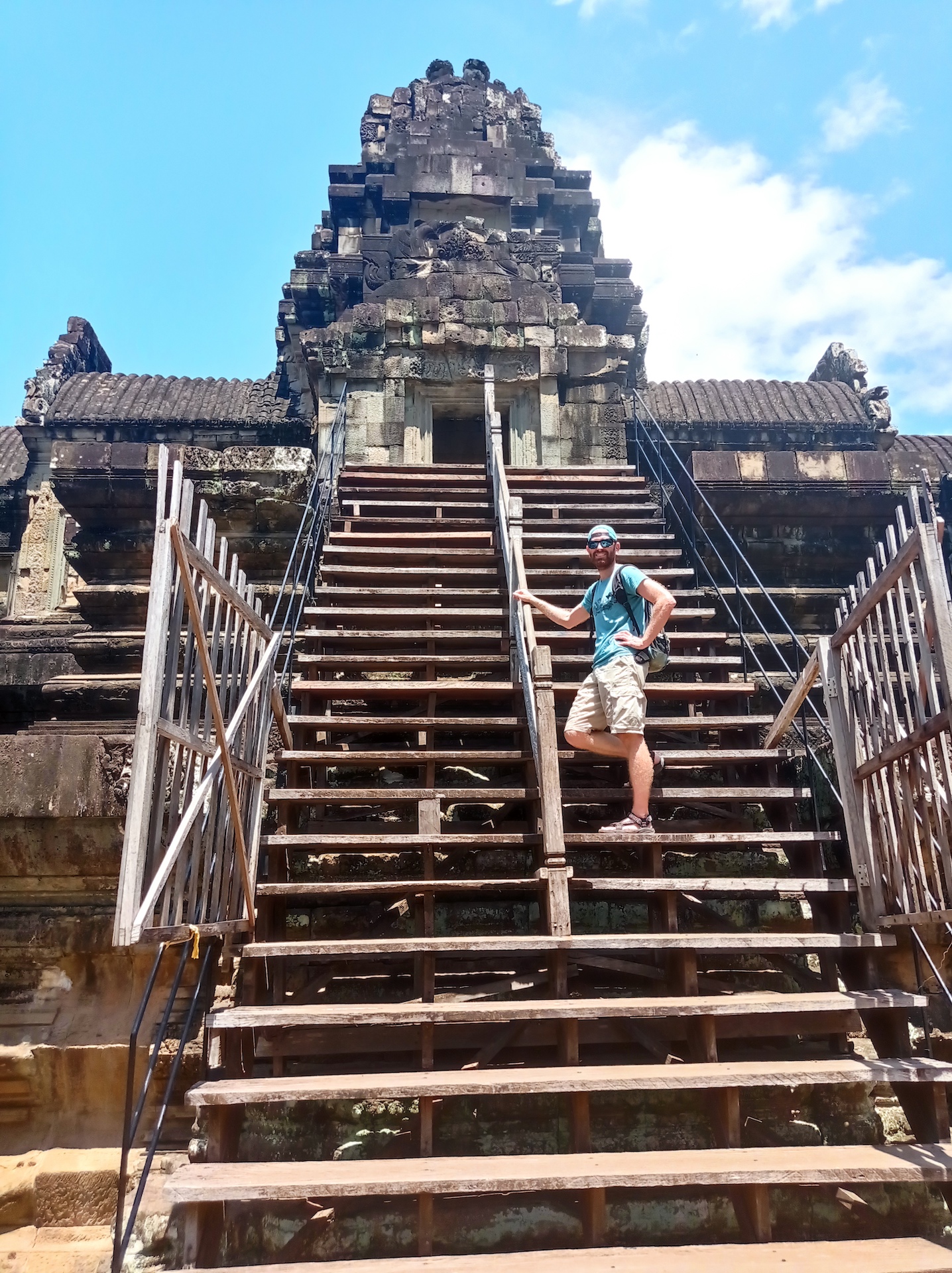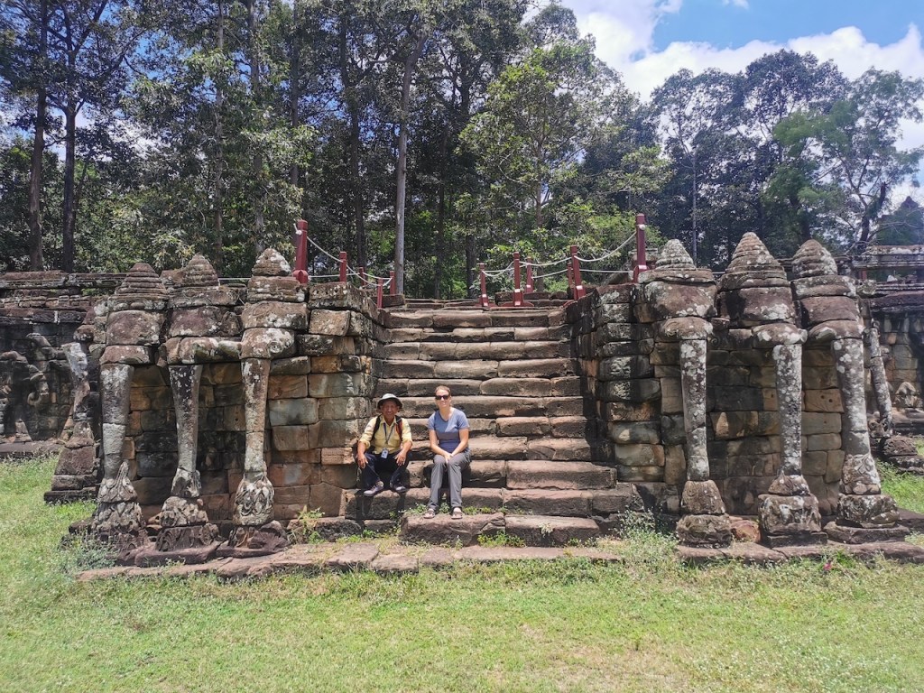 Une fois la dégustation terminée, notre hôte nous propose de partir à la découverte de l’île et quoi de mieux pour le faire qu’à vélo? Il s’éclipse rapidement chez des voisins afin de nous dégoter des vélos adaptés aux filles et nous partons tous les quatre sur la seule route de l’île. Une petite boucle de 9km environ nous attend, le tout à plat (heureusement vu l’âge de nos vélos…). Notre rythme est très tranquille, c’est un rythme de découverte et d’admiration des lieux. Nous n’hésitons pas à nous arrêter afin d’observer les gens dans les champs, les quelques temples ou encore une partie de volley (sport très apprécié car nous avons vu un peu partout au Cambodge des personnes s’y adonner en fin de journée). Nous peinons à trouver l’arbre aux chauves-souris géantes dont nous a parlé Virek… Raté, cette fois nous n’en verrons pas, car nous n’arrivons pas à trouver ce satané arbre 🤦🤦🏼♀️ ! Partis avec nos maillots de bain, nous renonçons cependant à nous baigner, les eaux brunes du Mékong ne nous attirant que très peu 🙃.