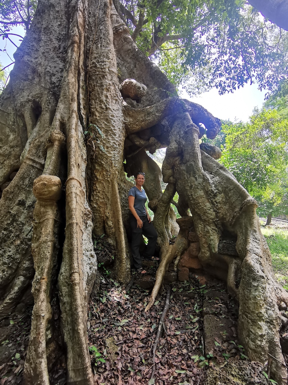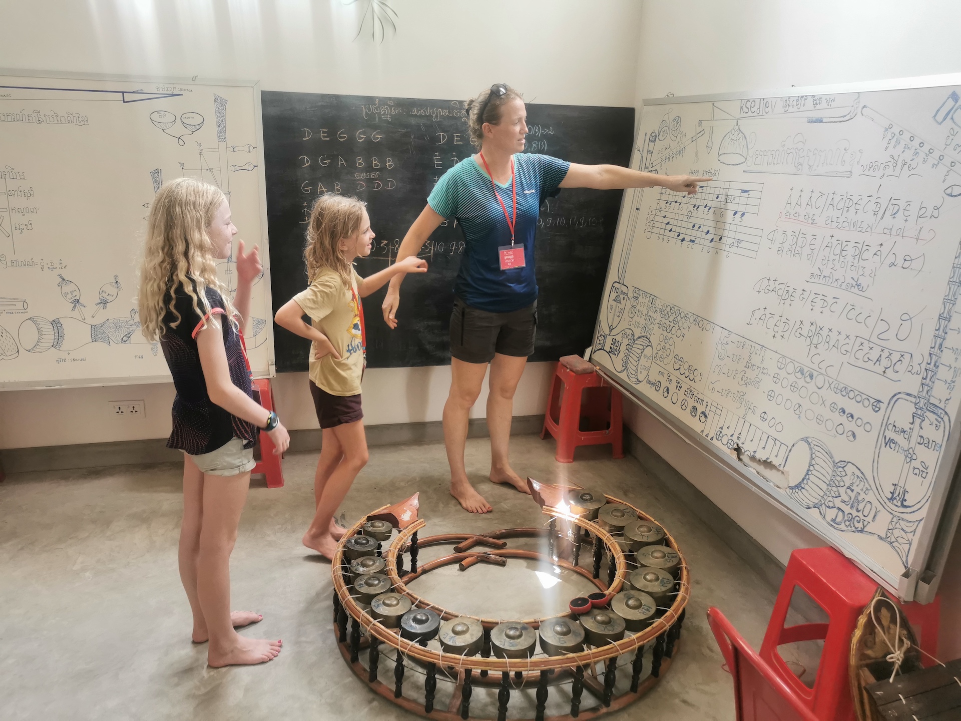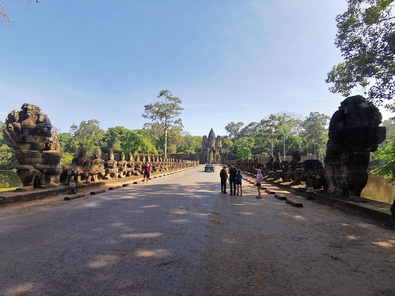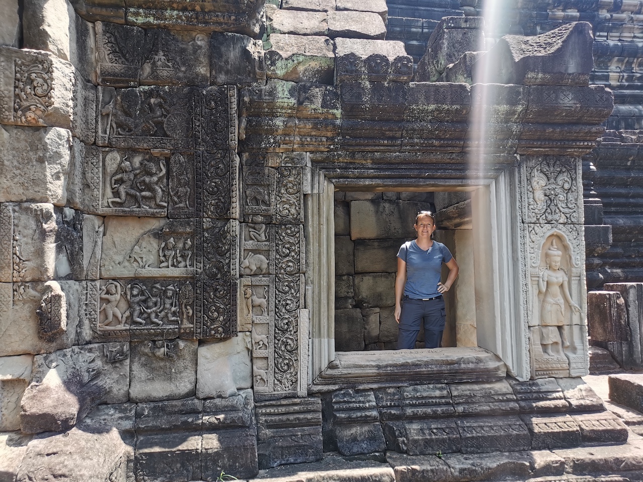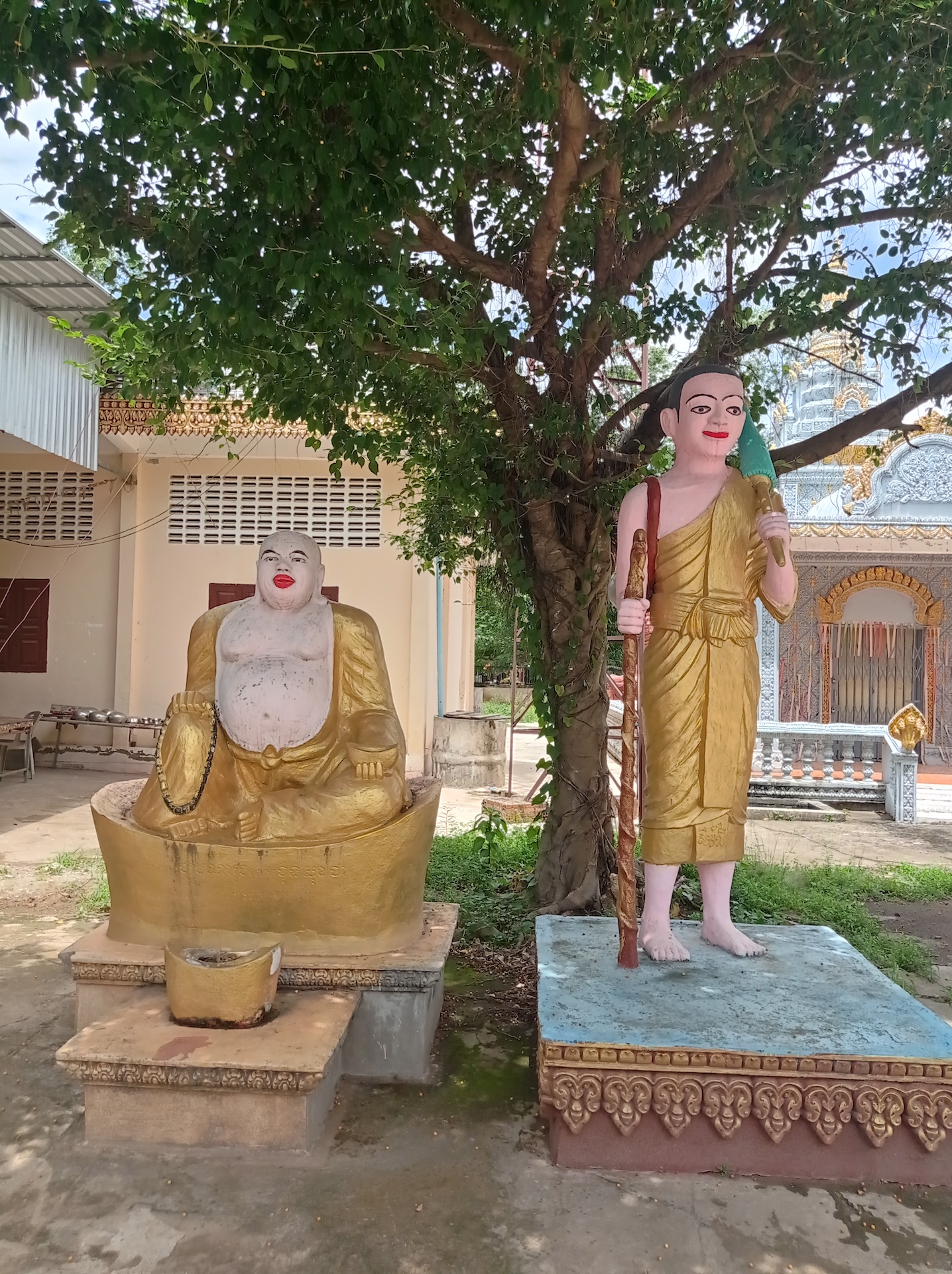 Une fois la dégustation terminée, notre hôte nous propose de partir à la découverte de l’île et quoi de mieux pour le faire qu’à vélo? Il s’éclipse rapidement chez des voisins afin de nous dégoter des vélos adaptés aux filles et nous partons tous les quatre sur la seule route de l’île. Une petite boucle de 9km environ nous attend, le tout à plat (heureusement vu l’âge de nos vélos…). Notre rythme est très tranquille, c’est un rythme de découverte et d’admiration des lieux. Nous n’hésitons pas à nous arrêter afin d’observer les gens dans les champs, les quelques temples ou encore une partie de volley (sport très apprécié car nous avons vu un peu partout au Cambodge des personnes s’y adonner en fin de journée). Nous peinons à trouver l’arbre aux chauves-souris géantes dont nous a parlé Virek… Raté, cette fois nous n’en verrons pas, car nous n’arrivons pas à trouver ce satané arbre 🤦🤦🏼♀️ ! Partis avec nos maillots de bain, nous renonçons cependant à nous baigner, les eaux brunes du Mékong ne nous attirant que très peu 🙃.