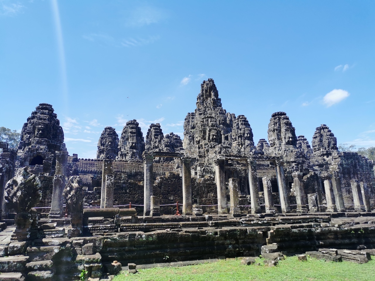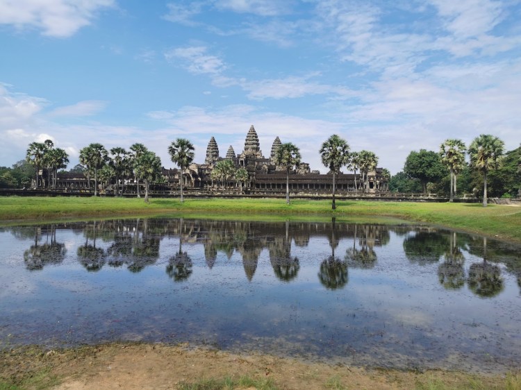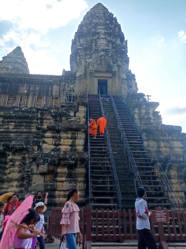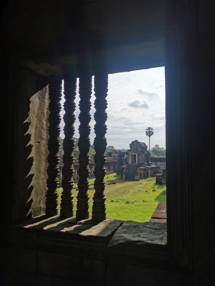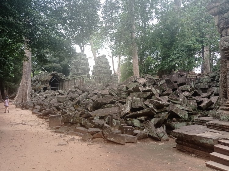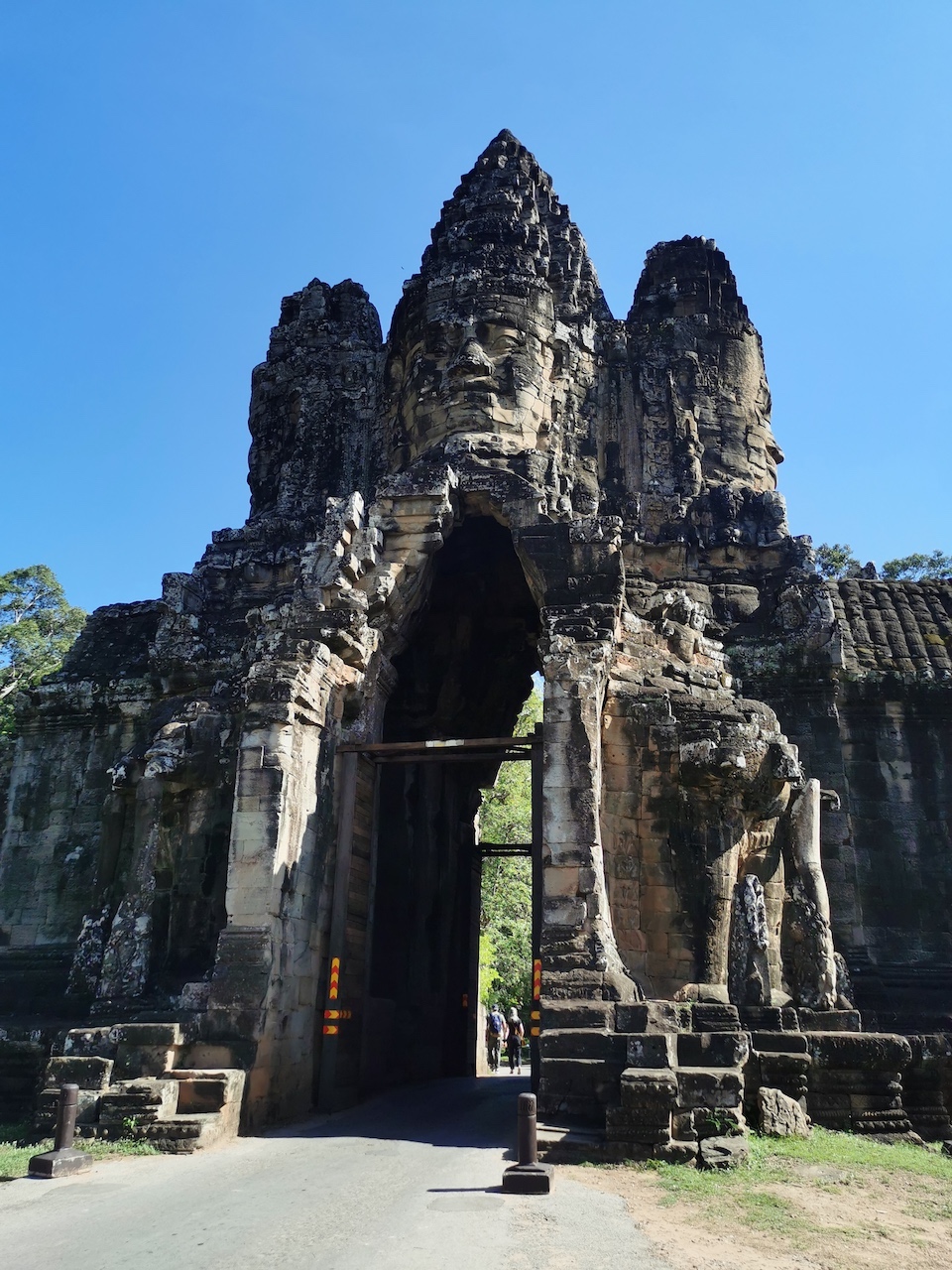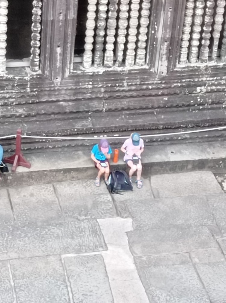 Une fois la dégustation terminée, notre hôte nous propose de partir à la découverte de l’île et quoi de mieux pour le faire qu’à vélo? Il s’éclipse rapidement chez des voisins afin de nous dégoter des vélos adaptés aux filles et nous partons tous les quatre sur la seule route de l’île. Une petite boucle de 9km environ nous attend, le tout à plat (heureusement vu l’âge de nos vélos…). Notre rythme est très tranquille, c’est un rythme de découverte et d’admiration des lieux. Nous n’hésitons pas à nous arrêter afin d’observer les gens dans les champs, les quelques temples ou encore une partie de volley (sport très apprécié car nous avons vu un peu partout au Cambodge des personnes s’y adonner en fin de journée). Nous peinons à trouver l’arbre aux chauves-souris géantes dont nous a parlé Virek… Raté, cette fois nous n’en verrons pas, car nous n’arrivons pas à trouver ce satané arbre 🤦🤦🏼♀️ ! Partis avec nos maillots de bain, nous renonçons cependant à nous baigner, les eaux brunes du Mékong ne nous attirant que très peu 🙃.