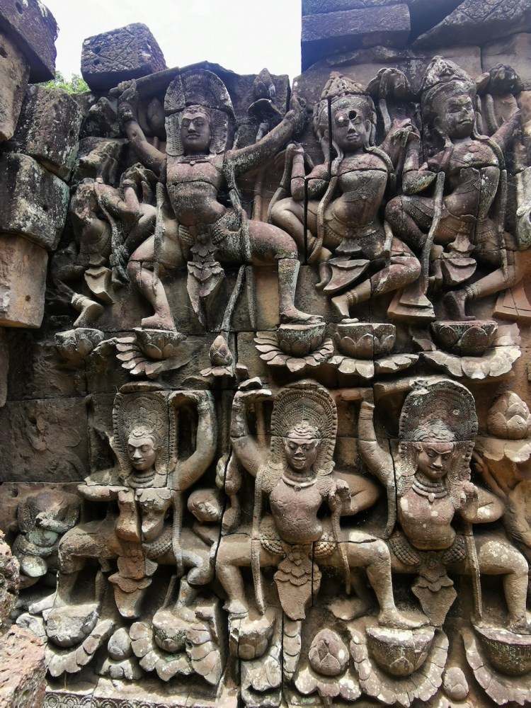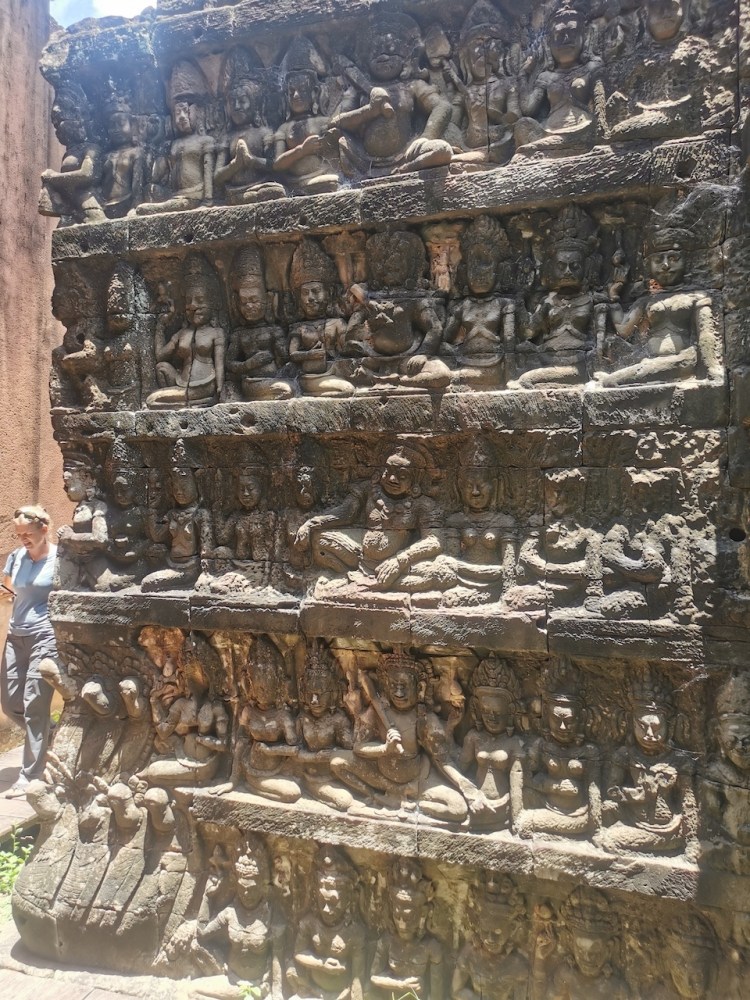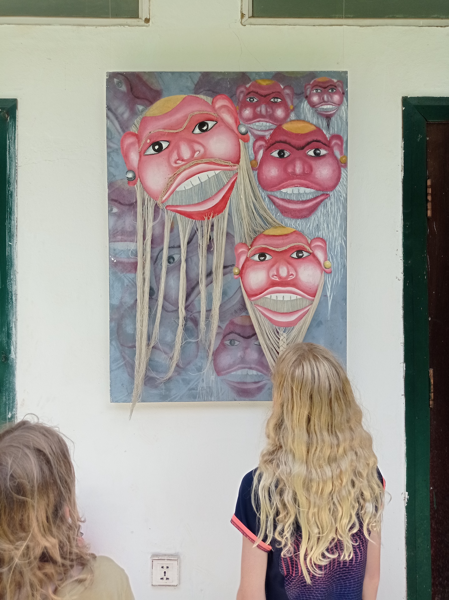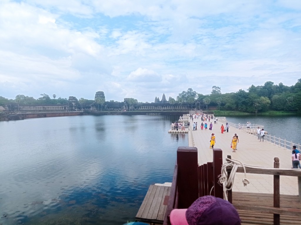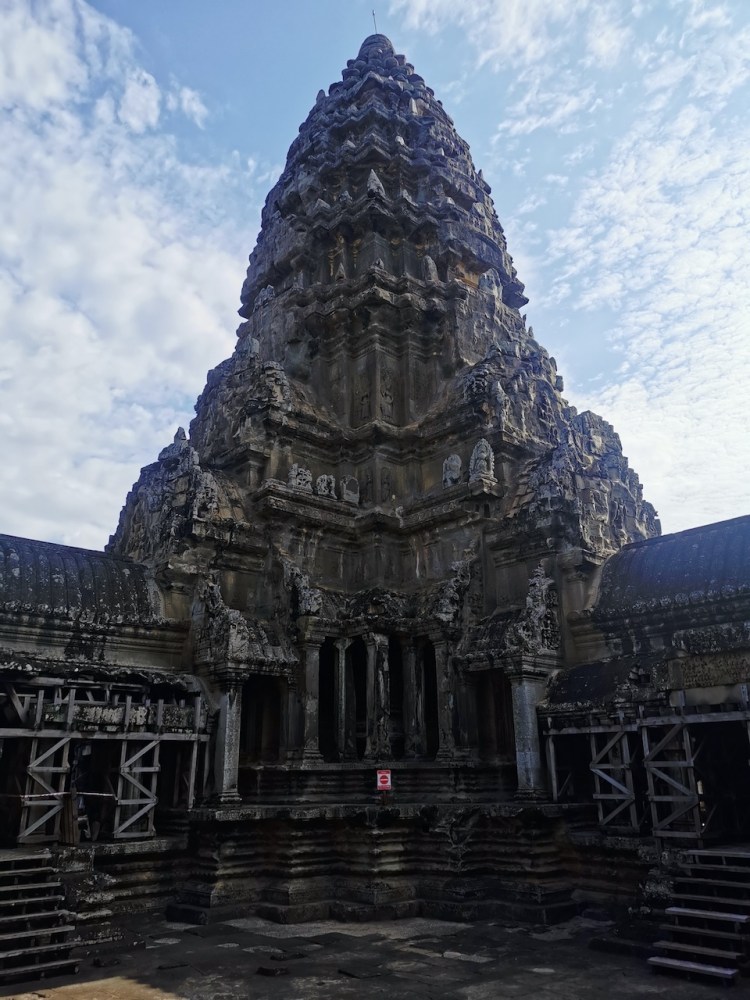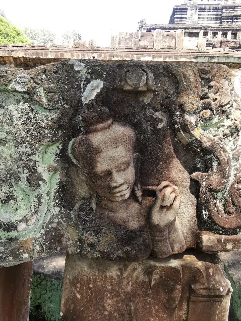 Une fois la dégustation terminée, notre hôte nous propose de partir à la découverte de l’île et quoi de mieux pour le faire qu’à vélo? Il s’éclipse rapidement chez des voisins afin de nous dégoter des vélos adaptés aux filles et nous partons tous les quatre sur la seule route de l’île. Une petite boucle de 9km environ nous attend, le tout à plat (heureusement vu l’âge de nos vélos…). Notre rythme est très tranquille, c’est un rythme de découverte et d’admiration des lieux. Nous n’hésitons pas à nous arrêter afin d’observer les gens dans les champs, les quelques temples ou encore une partie de volley (sport très apprécié car nous avons vu un peu partout au Cambodge des personnes s’y adonner en fin de journée). Nous peinons à trouver l’arbre aux chauves-souris géantes dont nous a parlé Virek… Raté, cette fois nous n’en verrons pas, car nous n’arrivons pas à trouver ce satané arbre 🤦🤦🏼♀️ ! Partis avec nos maillots de bain, nous renonçons cependant à nous baigner, les eaux brunes du Mékong ne nous attirant que très peu 🙃.