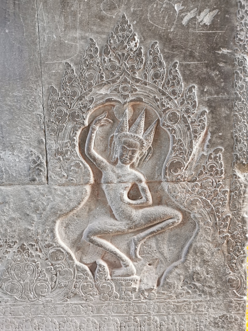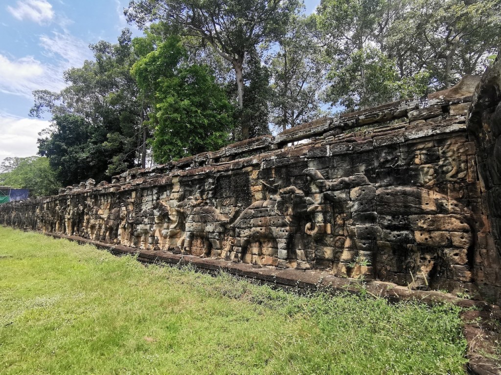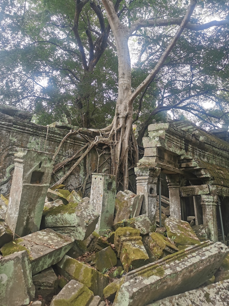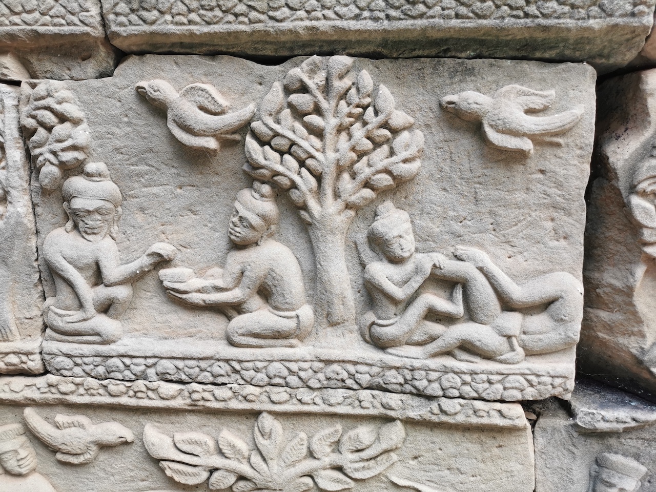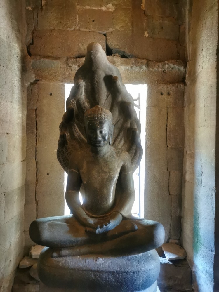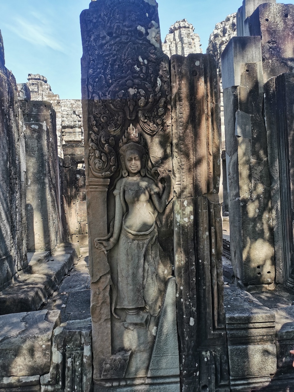 Une fois la dégustation terminée, notre hôte nous propose de partir à la découverte de l’île et quoi de mieux pour le faire qu’à vélo? Il s’éclipse rapidement chez des voisins afin de nous dégoter des vélos adaptés aux filles et nous partons tous les quatre sur la seule route de l’île. Une petite boucle de 9km environ nous attend, le tout à plat (heureusement vu l’âge de nos vélos…). Notre rythme est très tranquille, c’est un rythme de découverte et d’admiration des lieux. Nous n’hésitons pas à nous arrêter afin d’observer les gens dans les champs, les quelques temples ou encore une partie de volley (sport très apprécié car nous avons vu un peu partout au Cambodge des personnes s’y adonner en fin de journée). Nous peinons à trouver l’arbre aux chauves-souris géantes dont nous a parlé Virek… Raté, cette fois nous n’en verrons pas, car nous n’arrivons pas à trouver ce satané arbre 🤦🤦🏼♀️ ! Partis avec nos maillots de bain, nous renonçons cependant à nous baigner, les eaux brunes du Mékong ne nous attirant que très peu 🙃.