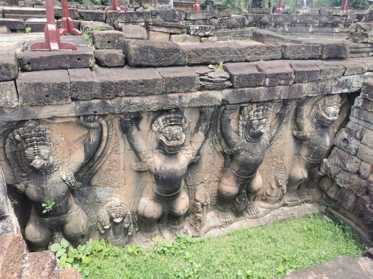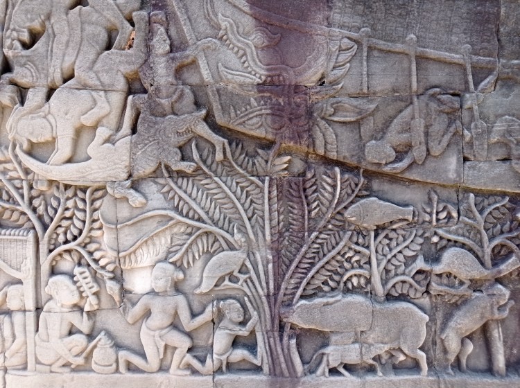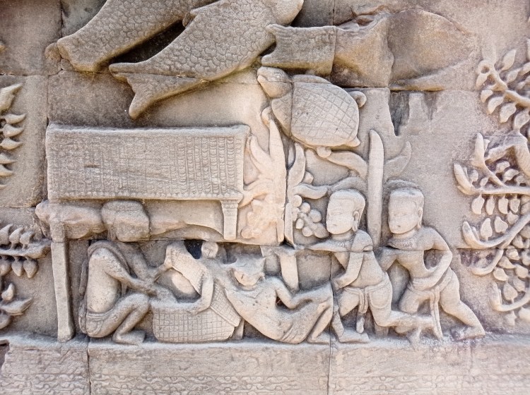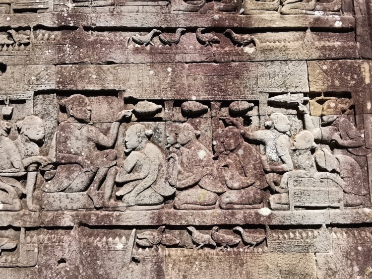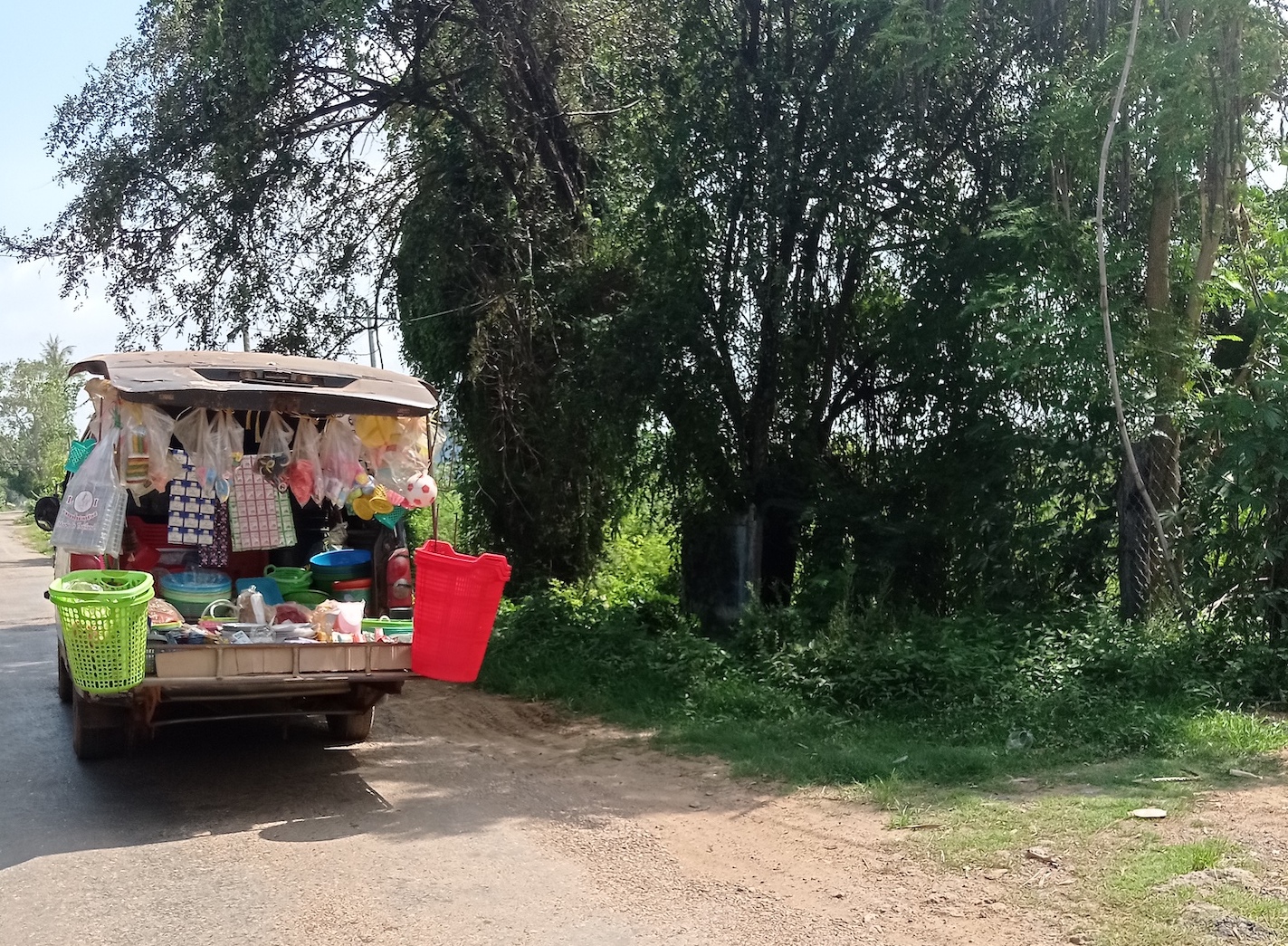 Durant cette pause, nous comprenons enfin ce que cette femme vendait sur le bord de la route: des krâlan. Ce mot désigne un petit snack consistant en un gâteau de riz, cuit dans un tube de bambou. C’est assez rigolo à ouvrir car il faut peler le bambou un peu comme une banane pour ensuite atteindre la pâte de riz gluant, accompagnée de haricots mungo et de chair de noix de coco râpée. Tout le monde se régale devant cette découverte culinaire.
