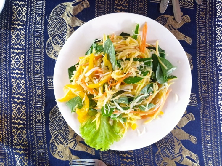 Après une bonne nuit de sommeil, nous nous mettons à la recherche d’un restaurant pour prendre notre petit-déjeuner. Pas facile de trouver quelque chose d’ouvert et les lieux indiqués par Google n’existent pas… Après une bonne demi-heure de vadrouille, nous tombons sur un tout petit café plutôt moderne qui semble pouvoir nous accueillir (le 90 Degrees). L’air conditionné est le bienvenu car la chaleur se fait de plus en plus ressentir et nous transpirons bien. Il n’y a pas grand chose à manger, mais les milk-shakes nous plaisent bien. Une fois notre petit-déjeuner avalé, nous nous rendons au port afin de prendre la barque qui va nous emmener sur l’île de Koh Trong que nous apercevons en face. Grimper dans le navire avec nos gros sacs à dos n’est pas des plus simple, mais personne ne tombe à l’eau 😜.