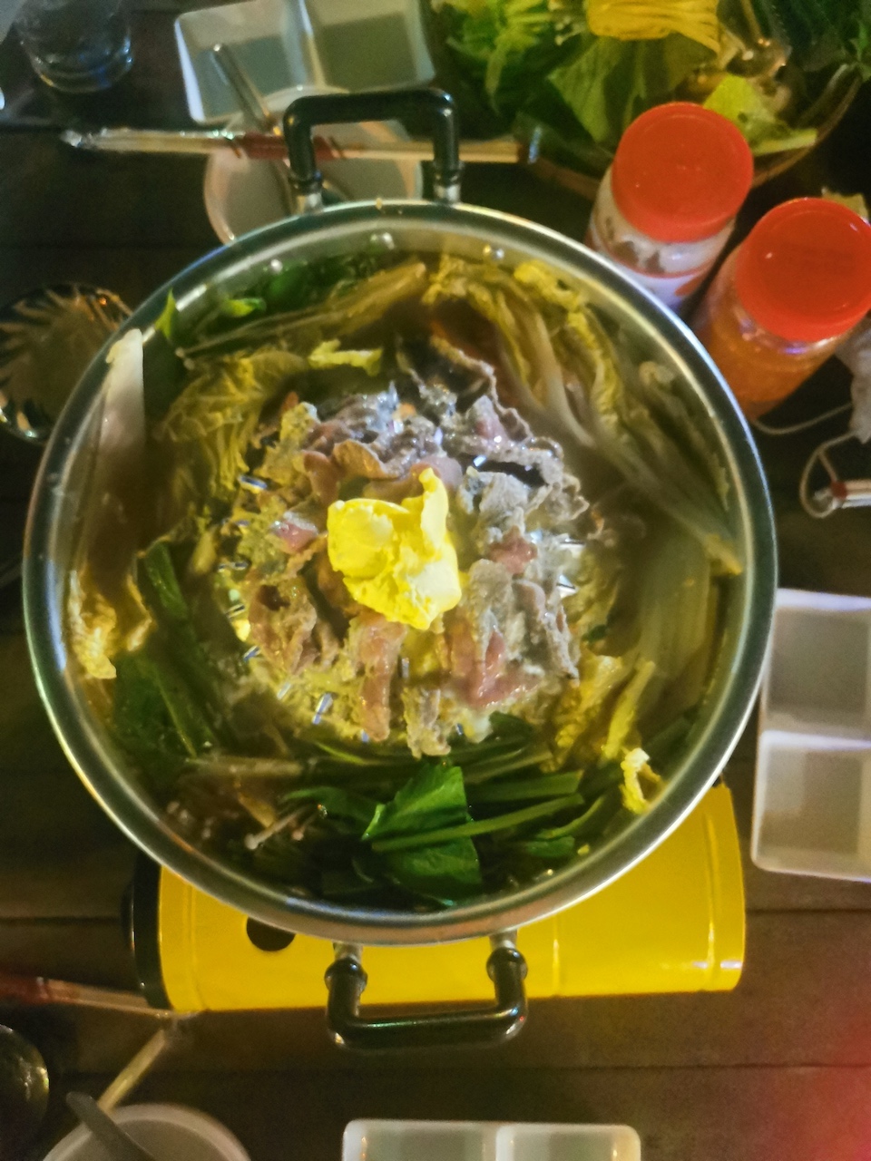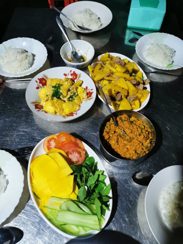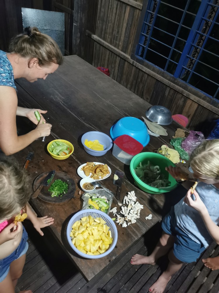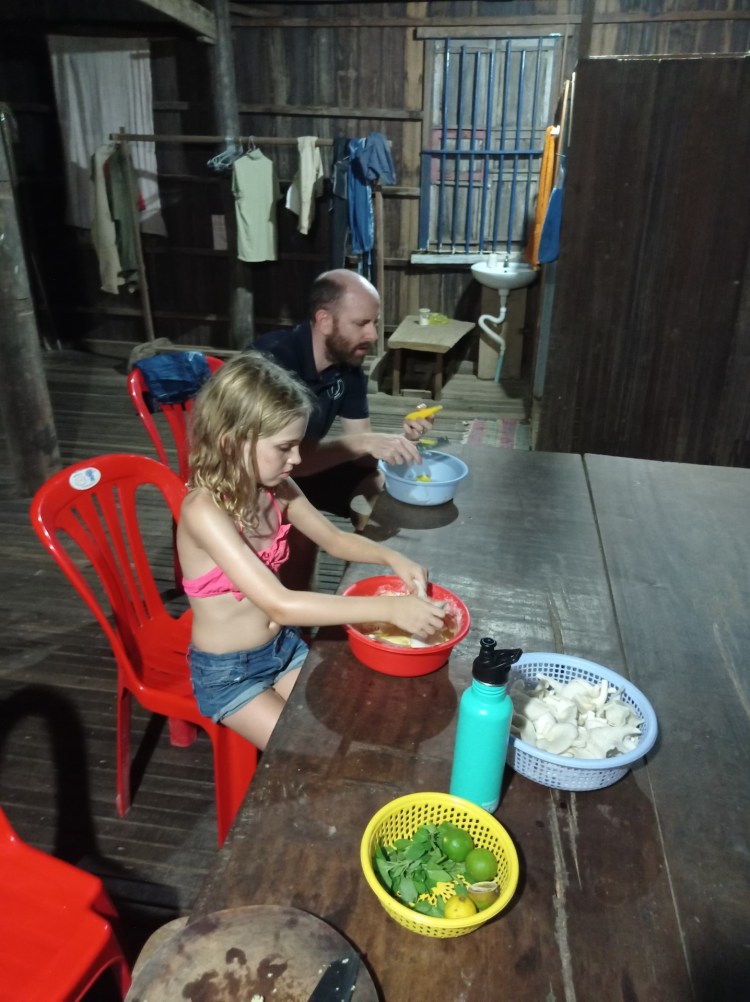 Une fois de retour à la pension, il s’agit de préparer le repas du soir. C’est justement pour ce genre de moment que nous avons choisi de venir vivre chez l’habitant. Tout le monde met la main à la pâte et nous aidons Virek à préparer le souper. Au menu, champignons frits à la sauce au poivre en entrée (ceux récupérés chez le voisin), riz blanc et porc à l’ananas pour le plat principal.