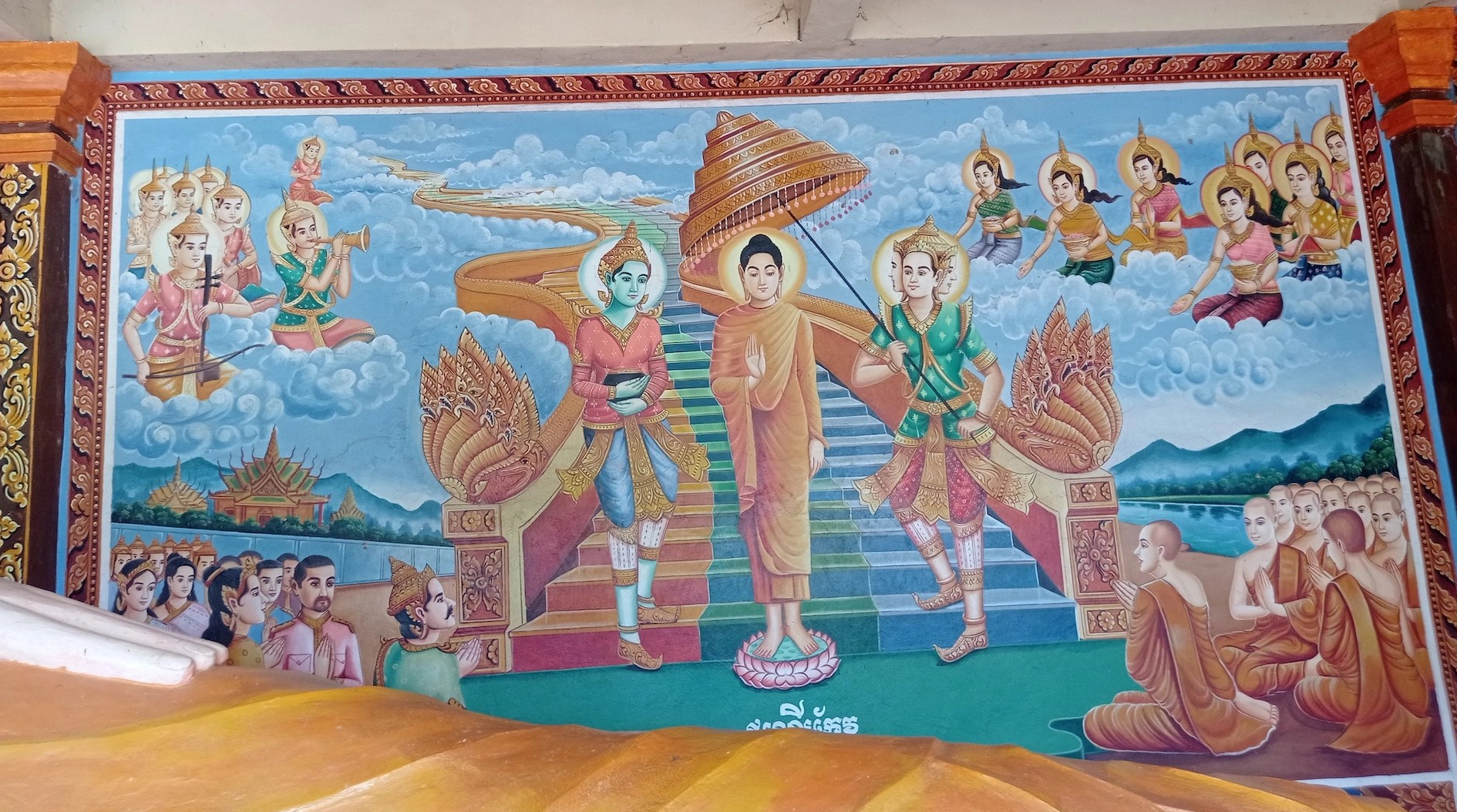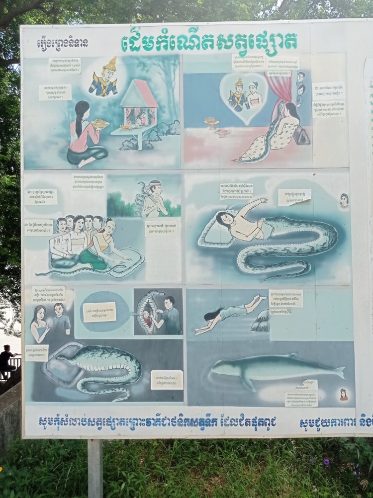 Selon le mythe populaire, une jeune fille pauvre souhaite épouser un homme et elle prie pour cela. Un python arrive chez elle et il s’avère que ce python est en fait un prince divin. Tout le monde au village entend parler de cette histoire et le père d’une autre jeune fille décide d’aller chercher un python dans la forêt afin de la marier à cet animal. Il pense en effet que celui-ci se changera également en prince et qu’ils deviendront riches. Malheureusement, ce serpent n’est qu’un vulgaire python et il dévore la jeune fille. Par chance, son père et sa mère entendent les appels à l’aide de leur fille et ils la sortent du ventre du python. Souillée par le sang et les entrailles du serpent et honteuse de ce qui vient de lui arriver, la jeune femme se jète dans le Mékong pour y mourir. Mais à peine son corps entre-t-il en contact avec l’eau qu’elle se transforme en dauphin. Depuis ce jour, des dauphins vivent dans le Mékong.