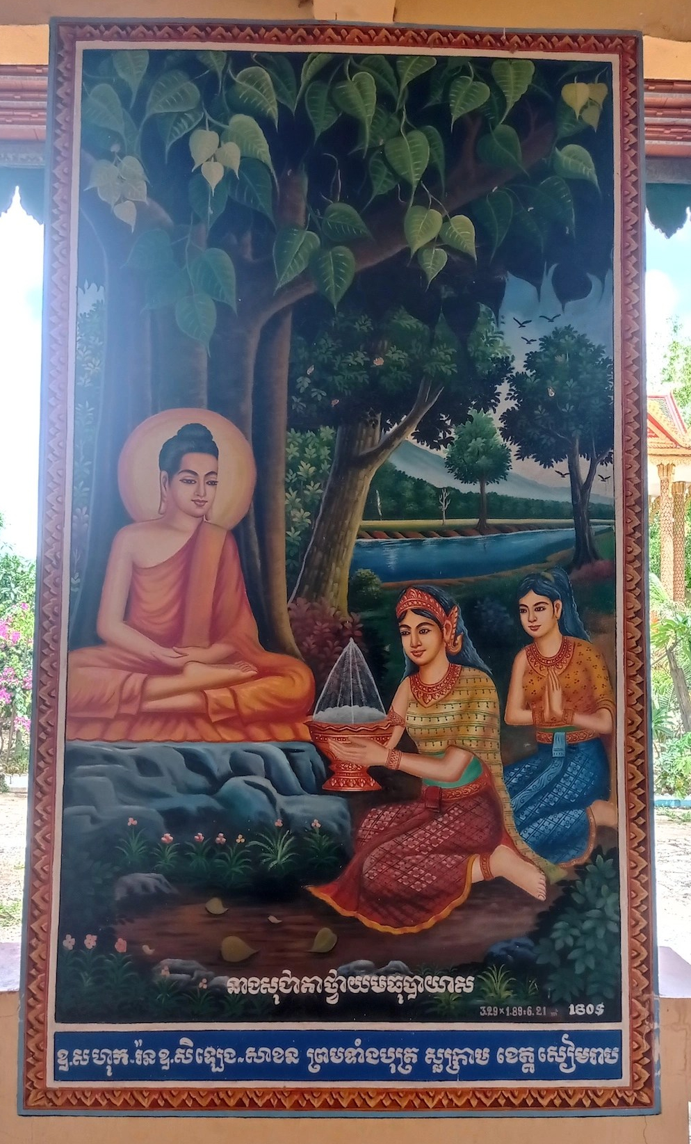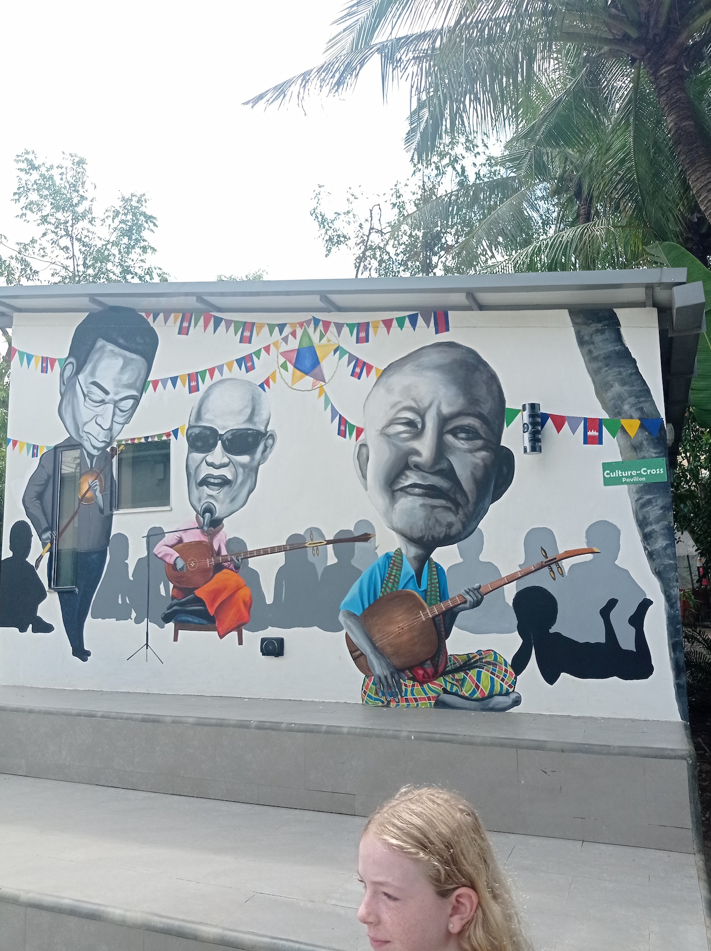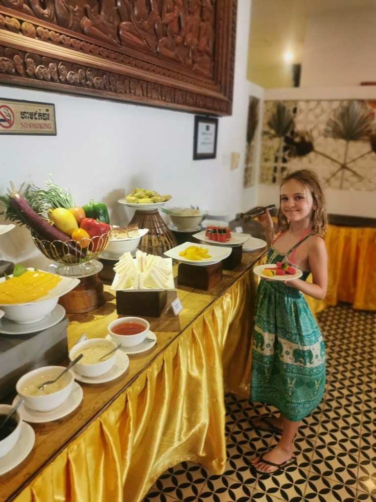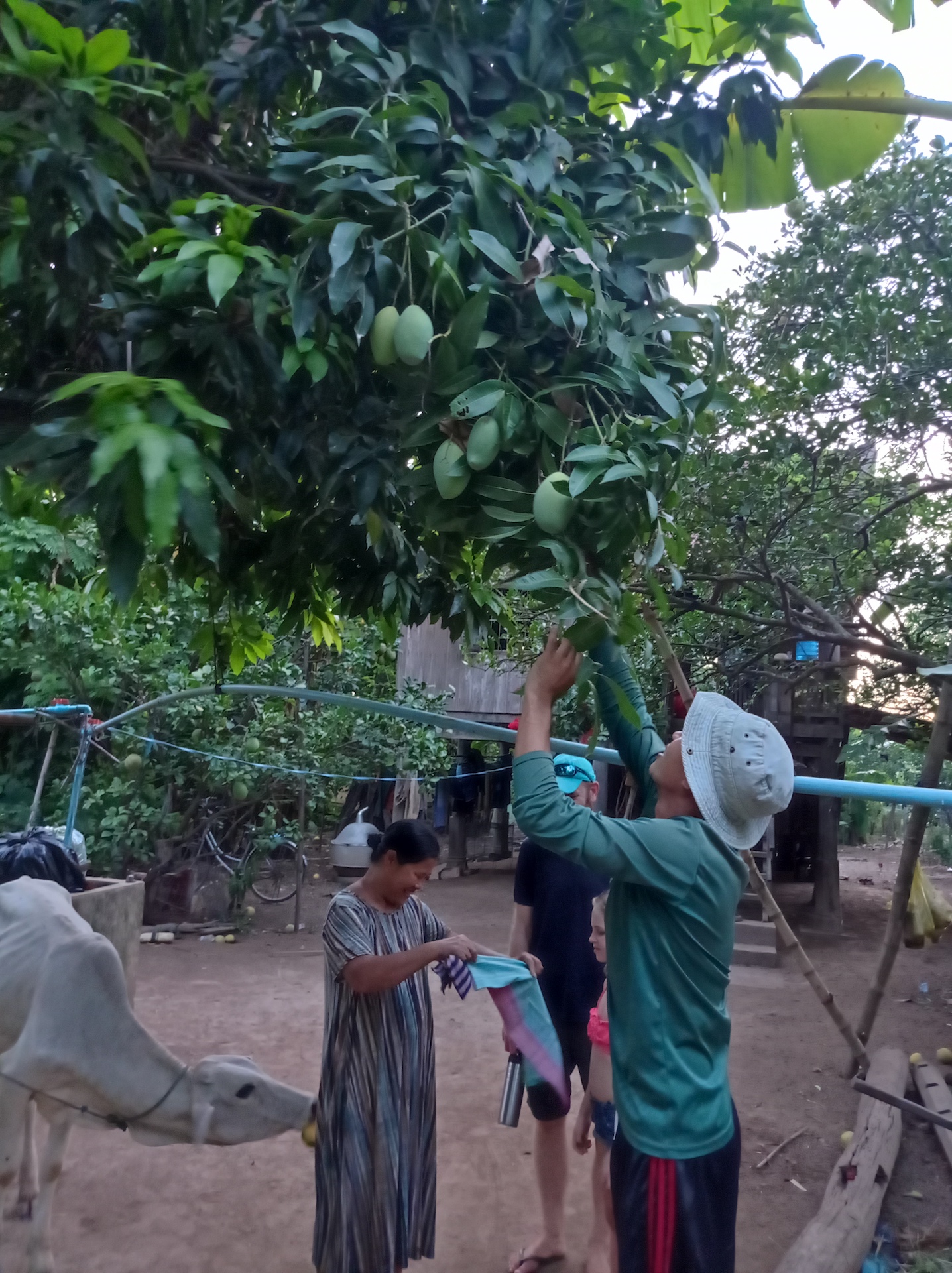 Nous terminons notre sortie en passant chez les parents de Virek et nous rencontrons sa maman. Pendant qu’il récupère une mangue directement sur l’arbre, celle-ci offre aux filles un Krama, une écharpe traditionnelle khmère.