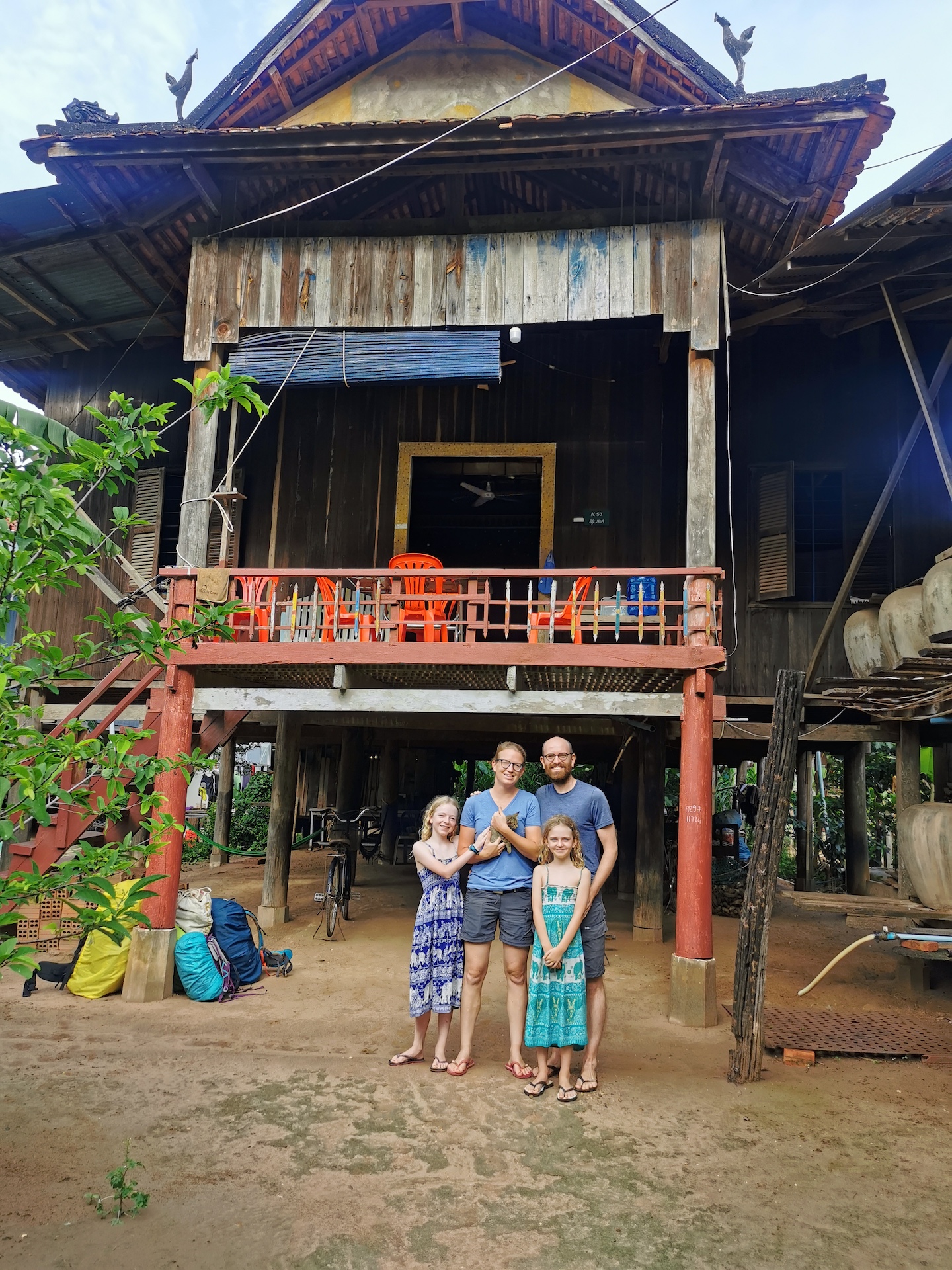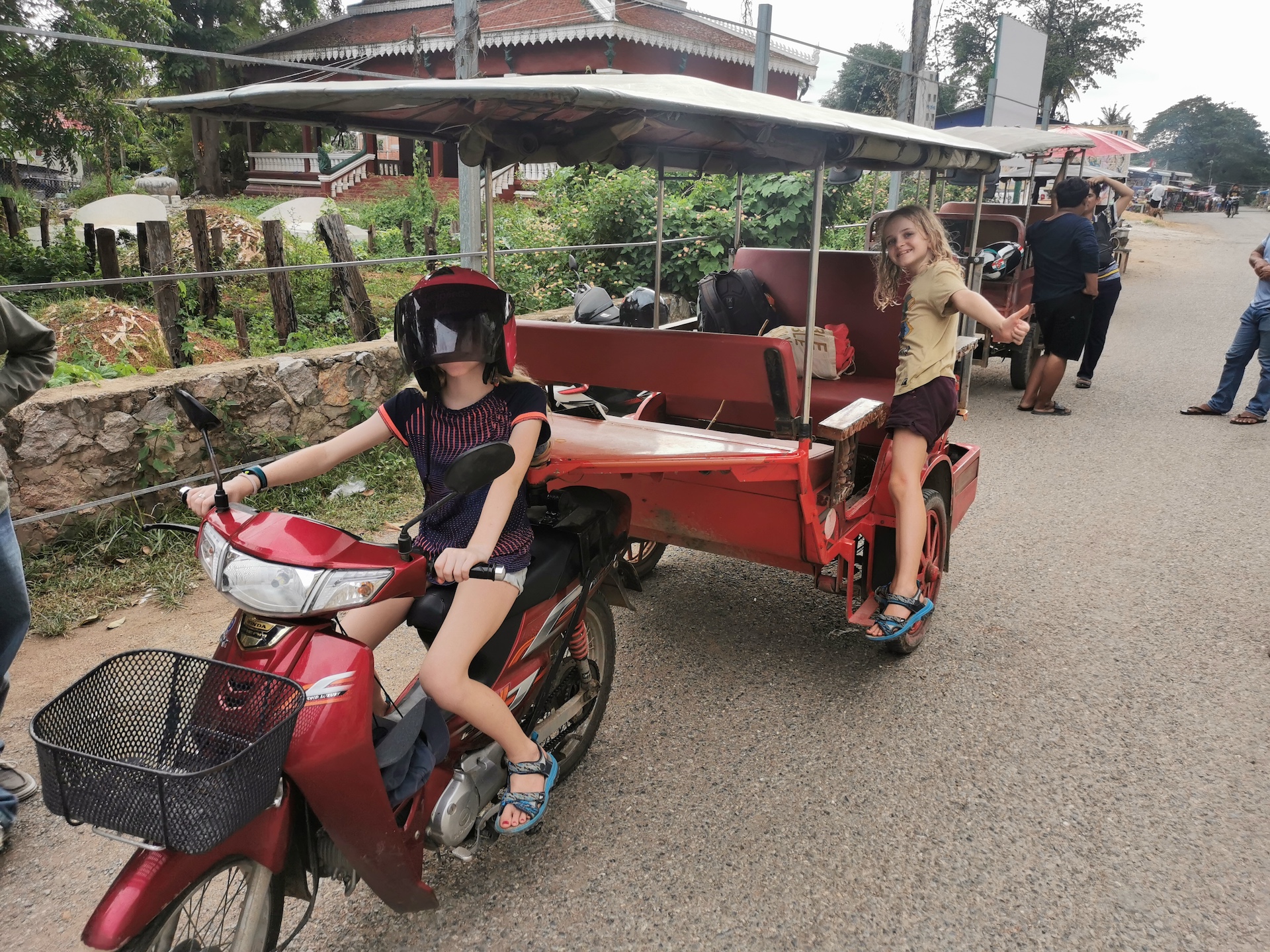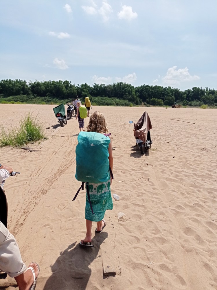 Pfiouuuu… Difficile ce réveil… Nous avons eu un violent orage au milieu de la nuit qui a réveillé toute la famille. C’est surtout Estelle qui en a fait les frais, elle qui n’est plus du tout confiante lorsque le tonnerre gronde et que la tempête fait rage. Encore plus depuis notre mauvaise expérience à Torotoro en Bolivie ⚡️. Enfin bon, pas le temps de nous plaindre, nous ne pouvons pas nous permettre de rater le bus, ils ne sont pas nombreux. Le temps de faire nos adieux à Virek et de le remercier pour ces deux superbes journées en sa compagnie, nous reprenons le petit bateau pour traverser le fleuve et rejoindre la ville de Kratie.