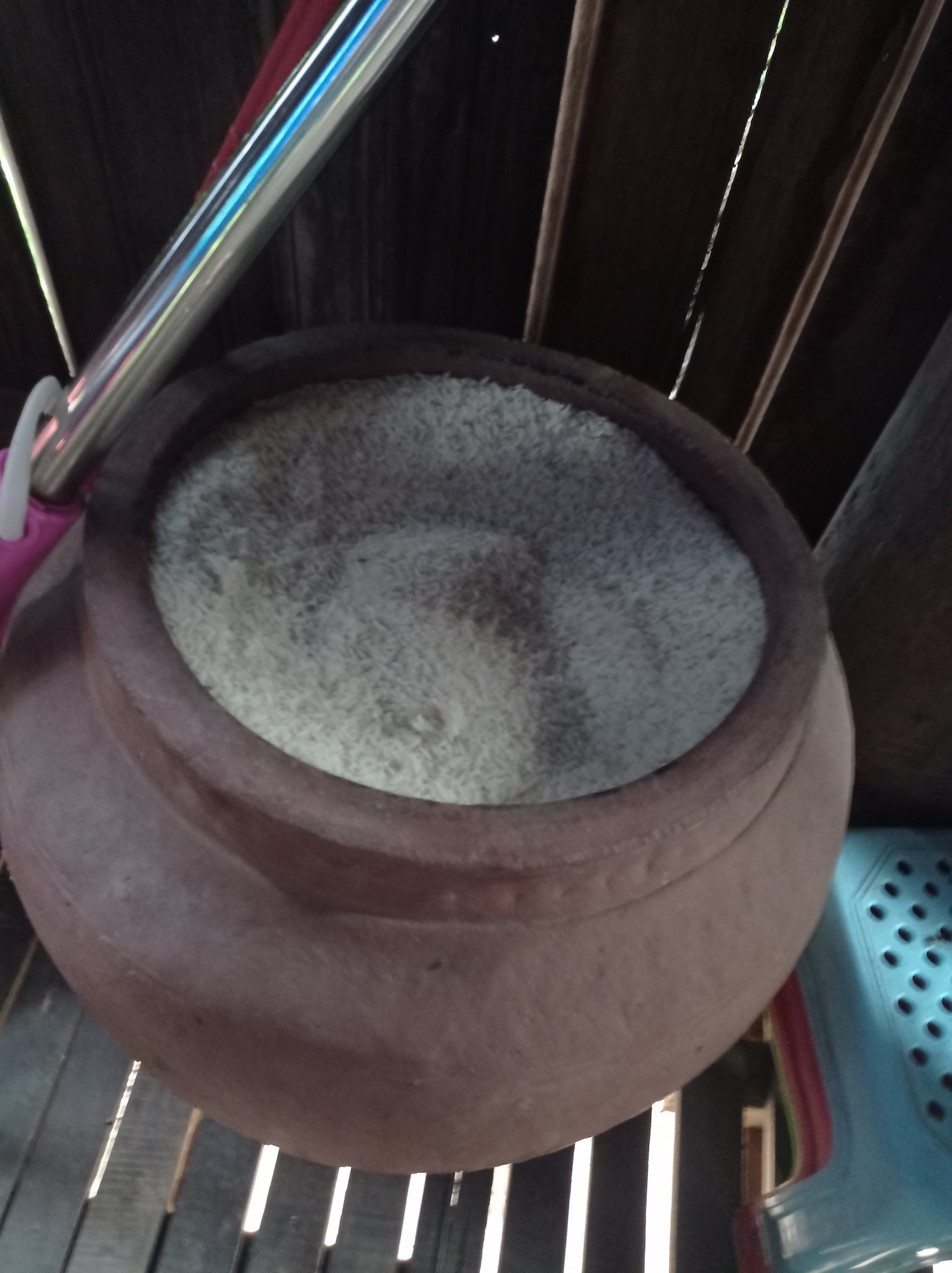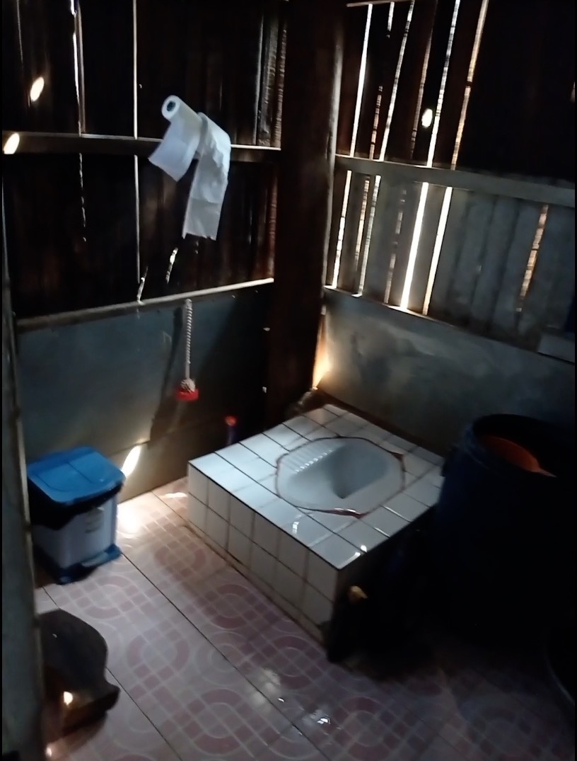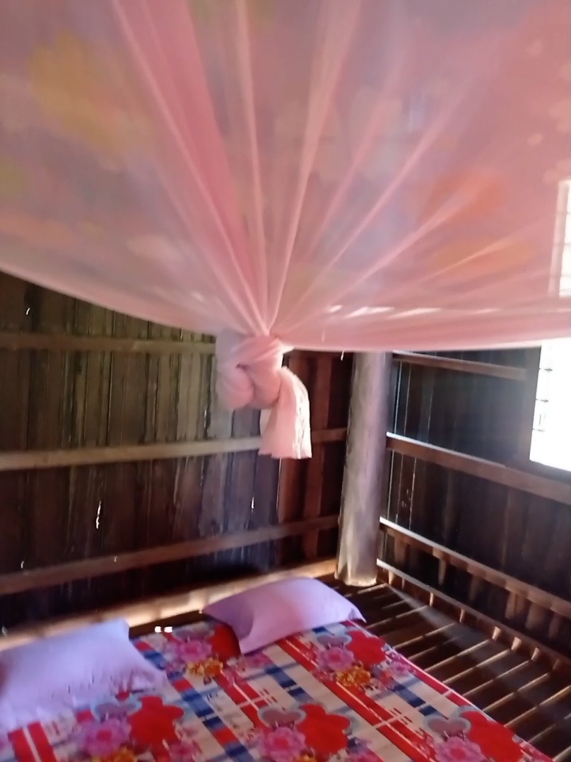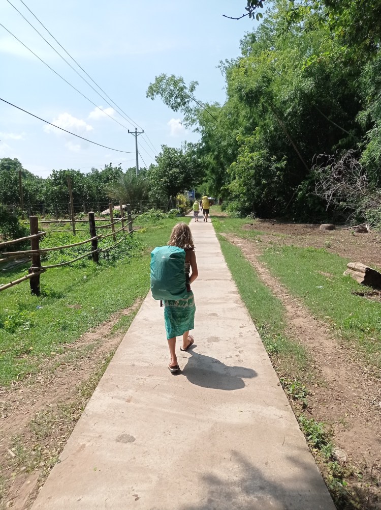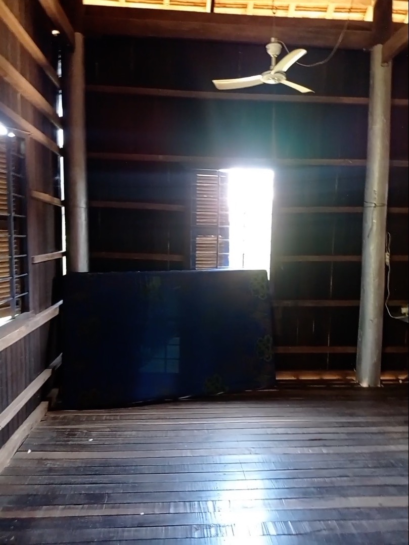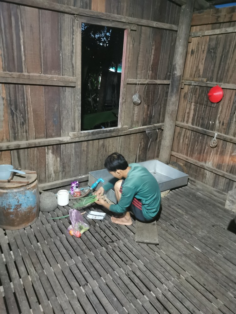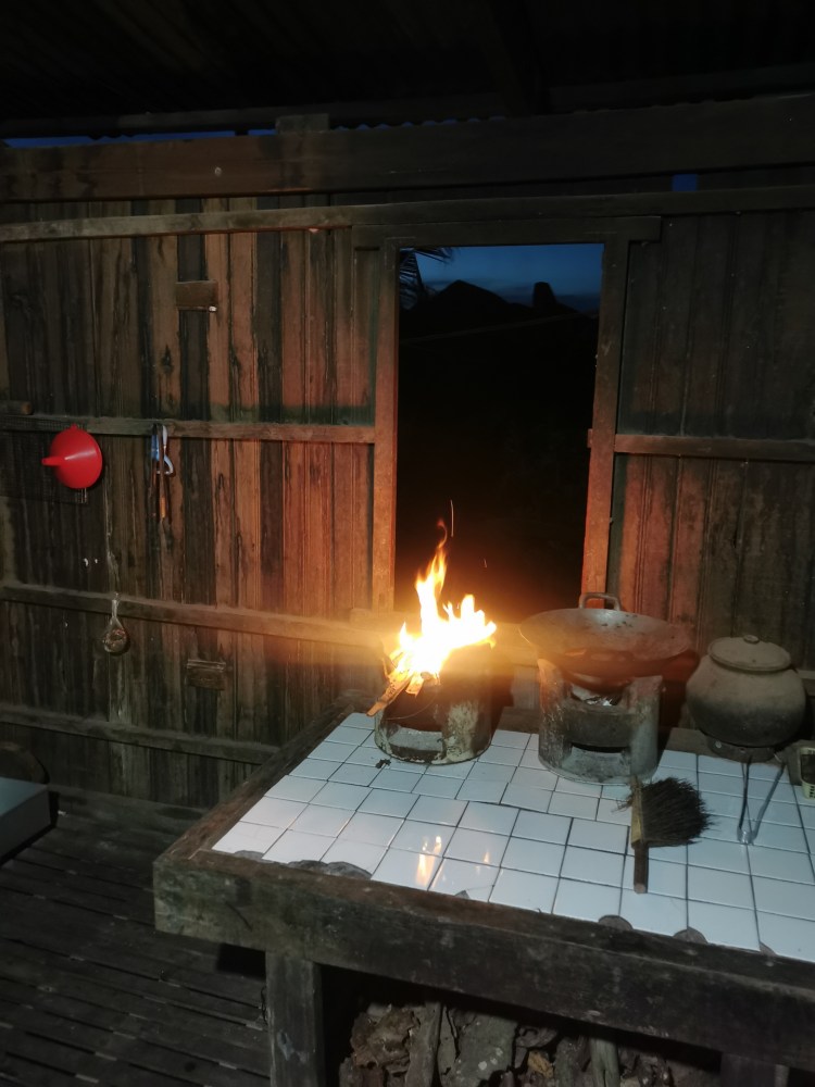 Le résultat est délicieux et c’est l’estomac bien rempli que nous rejoignons nos lit. En fait de lit, il s’agit de matelas posés au sol. Notre pension est une maison traditionnelle construite sur pilotis, avec une grande pièce principale, une petite chambre et une cuisine plutôt vaste avec un coin WC/douche (sans eau courante). Le plancher est formé de nombreuses lattes en bois légèrement espacées les unes des autres et qui laissent passer l’air. Virek dort dans la toute petite chambre, son petit frère sur un matelas dans la grande pièce, et nous avons deux grands matelas posés à même le sol avec des moustiquaires et un rideau pour avoir un peu d’intimité. C’est simple, mais cela nous suffit tout à fait.