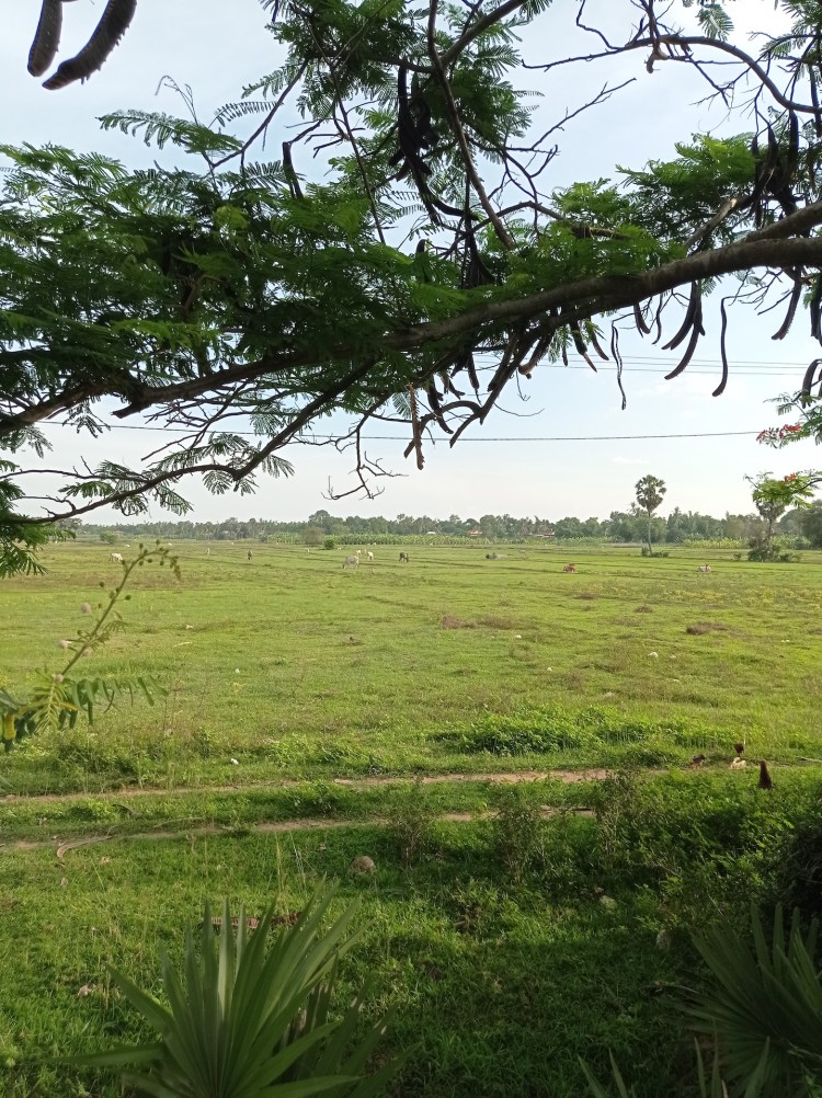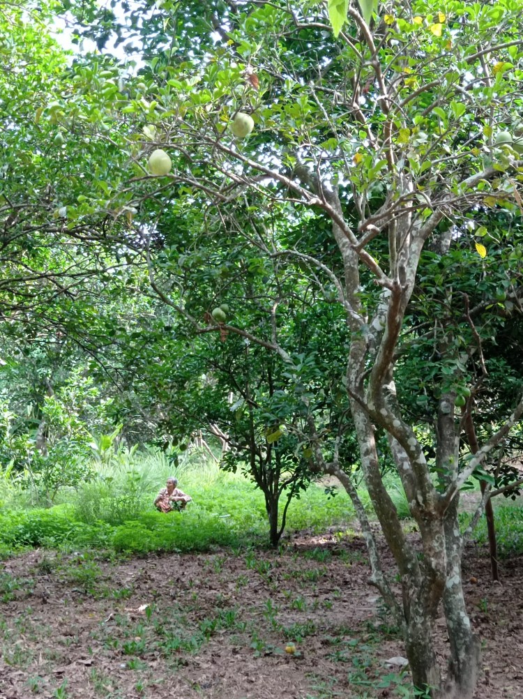 Virek est un jeune homme dans la vingtaine, très souriant et qui s’exprime dans un très bon anglais. Il est très à l’aise et il nous donne pleins d’informations sur l’île et sur la manière dont il vit. Tout cela attablés devant un succulent pamplemousse de son jardin (nous voyons l’arbre juste en dessous de la terrasse) qu’il prépare devant nous. Sa chaire est blanche et magnifiquement sucrée 😋. Cette île est connue pour sa culture du pamplemousse et c’est d’après ce fruit qu’il a nommé son Home Stay (Pomelo Homestay). Après Phnom Penh c’est un changement total d’ambiance! Beaucoup plus calme et tranquille, nous plongeons dans la culture et le mode de vie rural et traditionnel des populations khmères vivant dans cette région du Mékong. Cela nous plaît énormément, c’est un vrai coup de coeur! Koh Trong est très peu développée et son économie est surtout basée autour de l’agriculture. Pamplemousse, riz, banane, voilà en priorité ce qu’on y trouve.