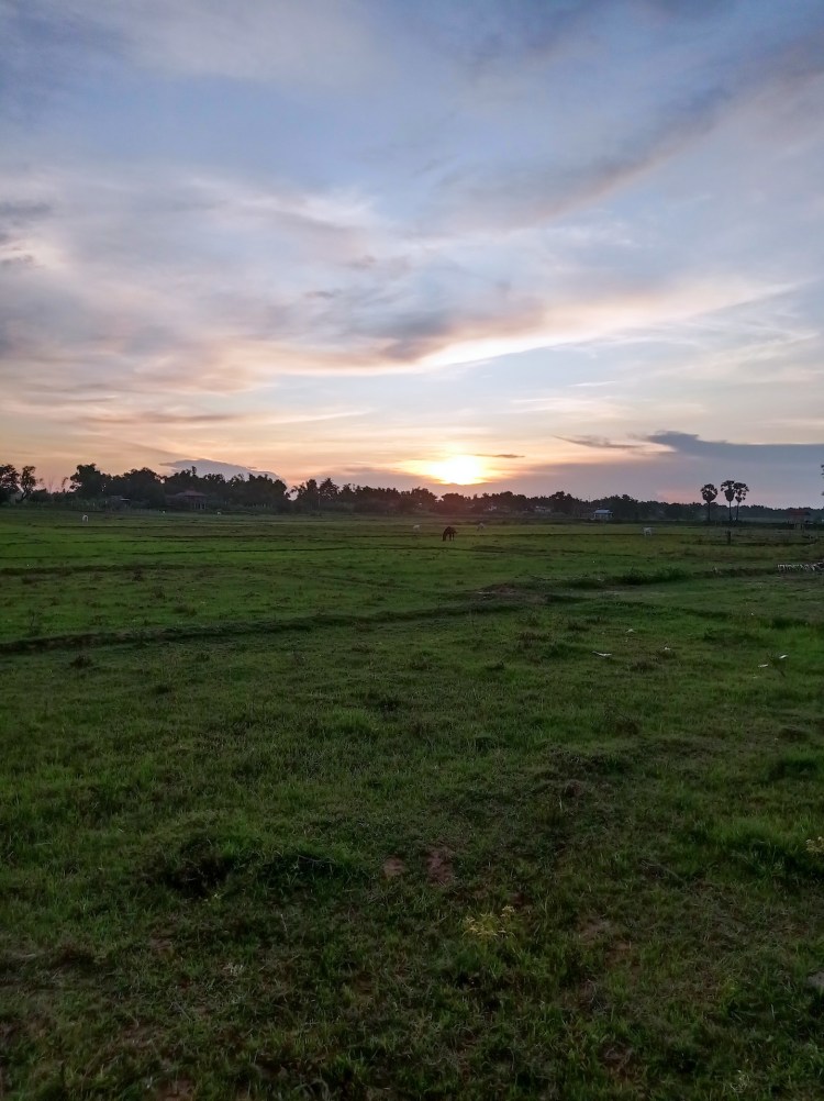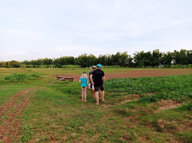 De retour à la maison, Virek nous emmène avec lui pour nous faire visiter les champs de sa famille, qui se trouvent derrière sa maison. En chemin, il nous explique les différents types d’agriculture qui se font sur l’île et ce que eux produisent: riz, bananes, pamplemousses, pastèques, etc. Il s’agit également de récupérer les différents ingrédients pour le repas du soir. Les couleurs sont belles et la compagnie de notre hôte est très agréable. Il répond volontiers à toutes nos questions et il nous explique qu’ils ont la chance d’avoir des terres fertiles qui leur permettent non seulement de se nourrir mais aussi d’exporter certains de leurs produits, tels que les bananes et les pamplemousses.