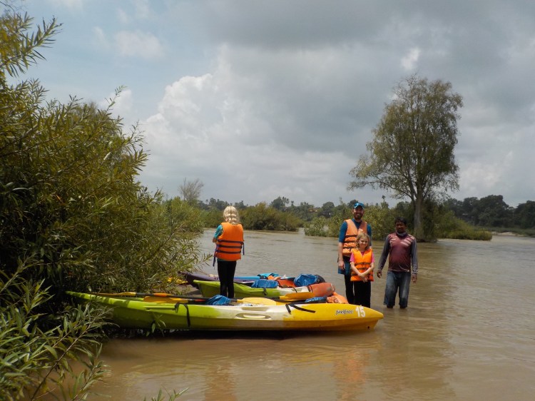 Enfin, nous arrivons à la fin de notre périple aquatique. C’est là, à une quinzaine de kilomètres au nord de de la ville de Kratie que nous allons essayer d’apercevoir les dauphins de l’Irrawady. D’une taille d’environ 2m30 à l’âge adulte et d’un poids approximatif de 130kg, ces cétacés sont de couleur bleu-grise et ils sont très discrets. Vu leur nombre restreint, nous espérons vraiment avoir la chance d’en apercevoir, mais nous préparons les filles au risque que nous restions bredouilles. Notre guide nous explique que nous devons essayer de rester le plus tranquille possible, de ne pas parler fort et, surtout, d’avancer doucement avec nos pagaies, afin de ne pas les effrayer.