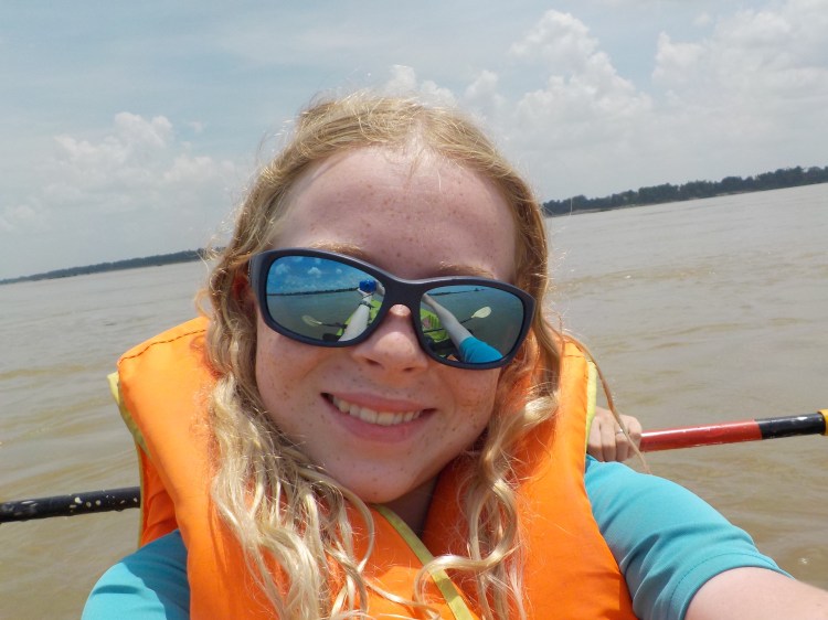 Chacun de nous prend une fille dans son kayak et nous démarrons notre descente du Mékong, fleuve large, imposant et très opaque. Heureusement le courant nous aide bien et nous n’avons pas besoin de trop ramer.