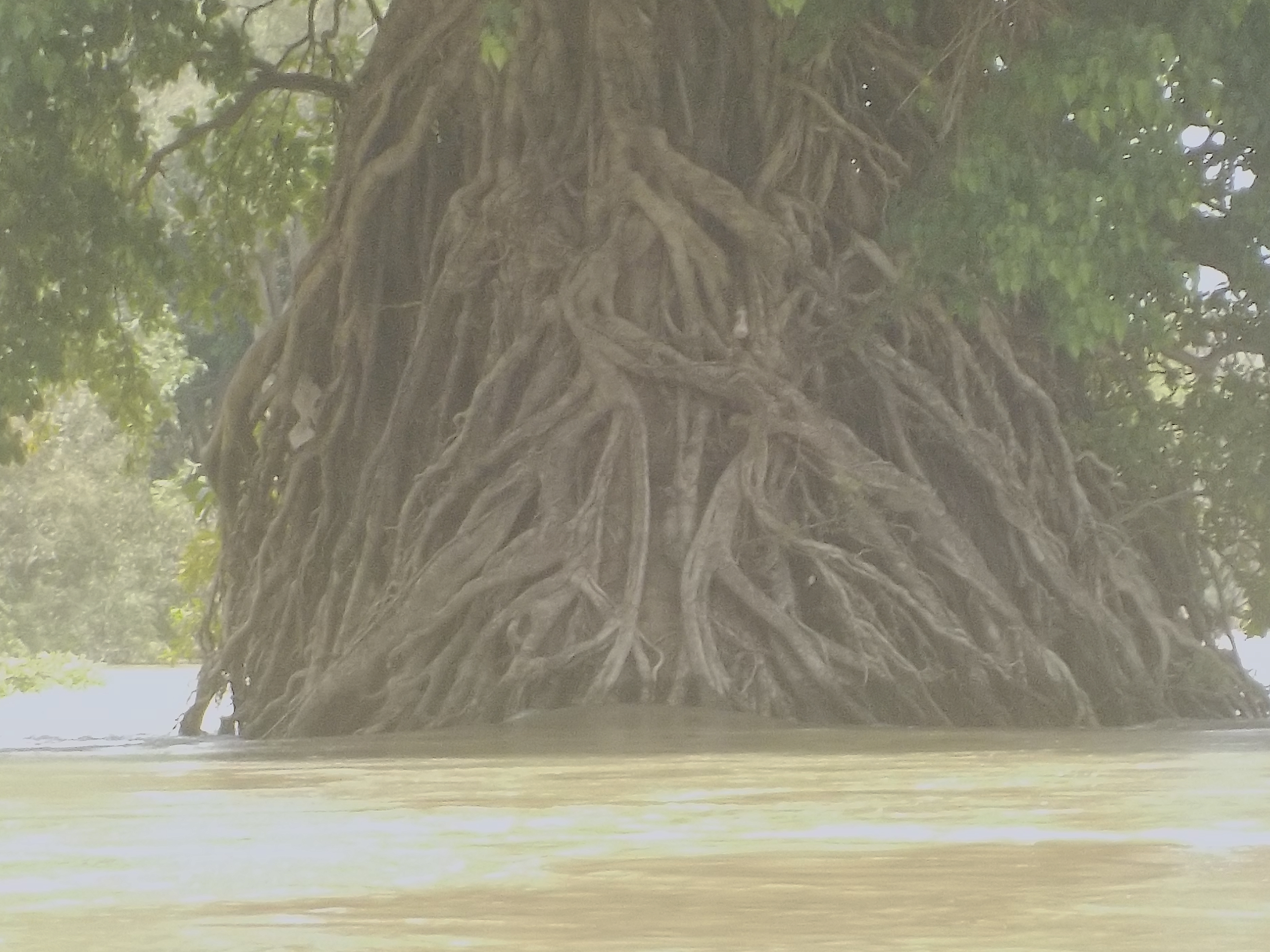Après cette pause fraîcheur bienvenue, nous poursuivons notre descente du cours d’eau. La prochaine étape est le passage à travers une forêt inondée. Nous nous retrouvons à naviguer entre de gigantesques arbres qui se trouvent en plein milieu du fleuve. Même si nous aimons nous abandonner à la contemplation de ces géants, il nous faut faire attention de ne pas trop nous en approcher, par peur de nous retrouver coincés par le courant contre leurs impressionnantes racines.