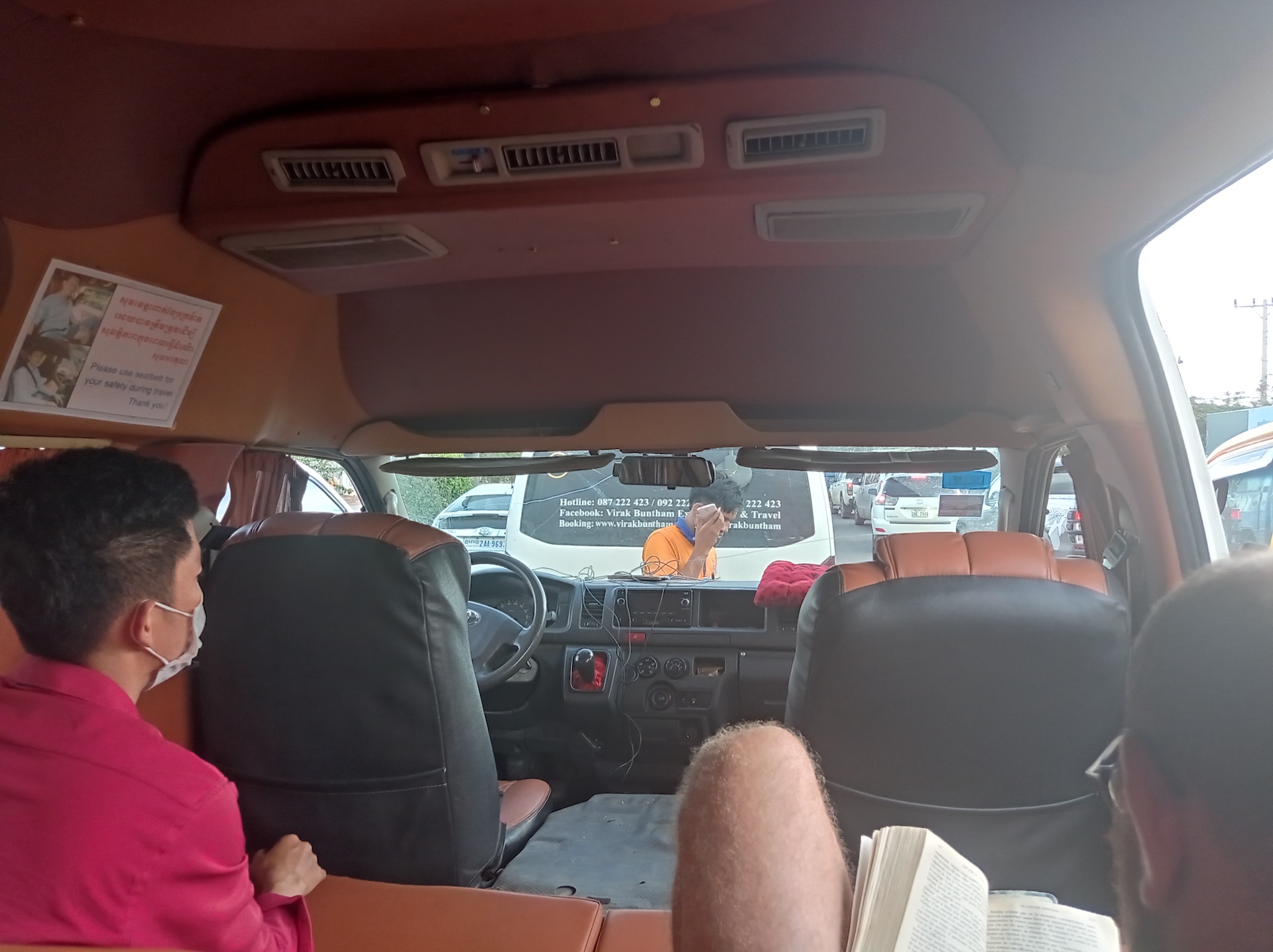 Après quelques parties de cartes et de yatzee, nous revenons au terminal de bus pour apprendre qu’il va encore falloir patienter une trentaine de minutes. Nous commençons sérieusement à nous demander si nous allons réussir à partir aujourd’hui. Mais voilà que notre véhicule arrive finalement 🥳. Nous récupérons nos affaires, nous chargeons le tout et nous montons dans le van 🚌 qui part sans tarder, afin de ne pas rajouter encore du retard à son horaire!
