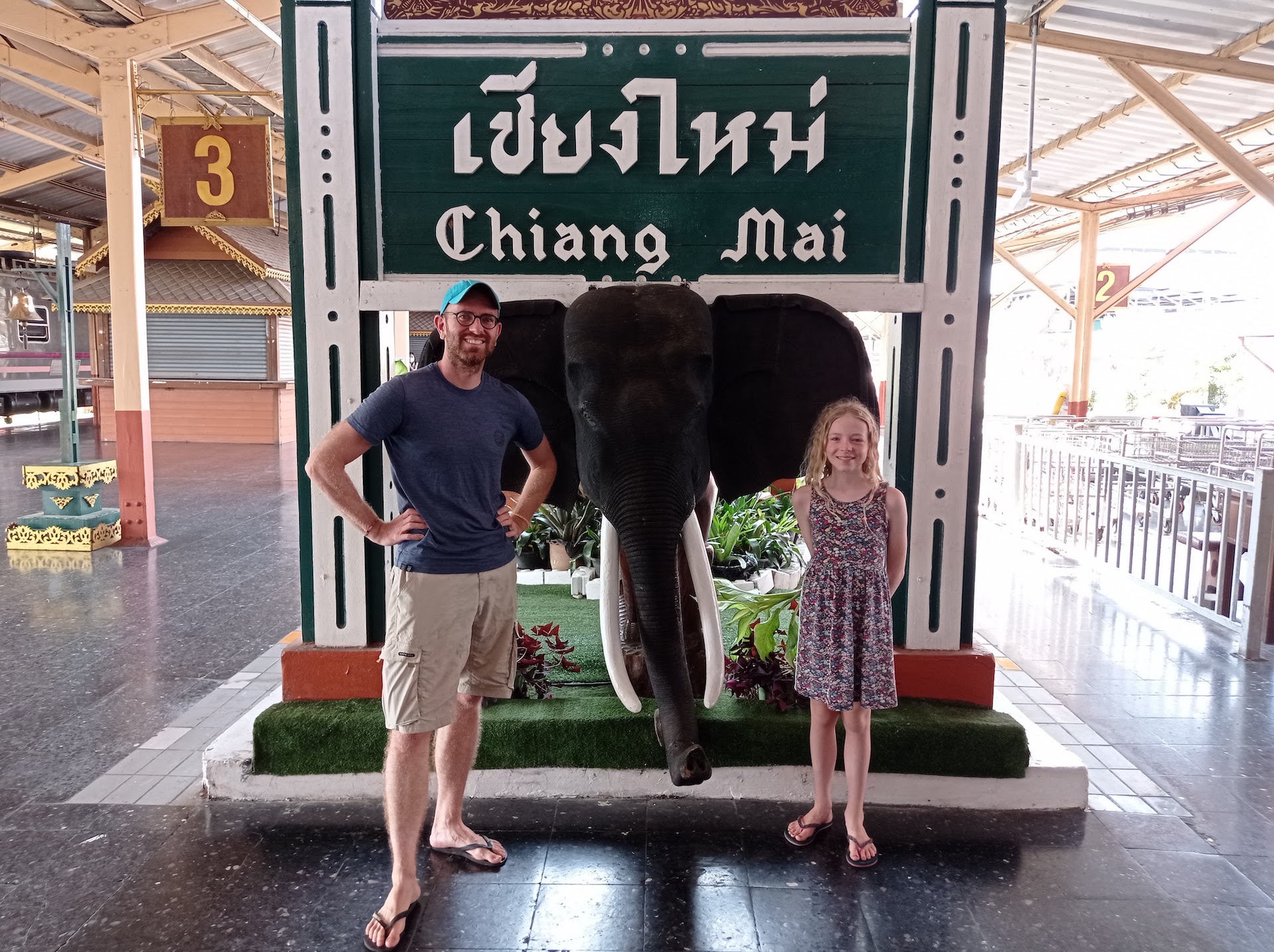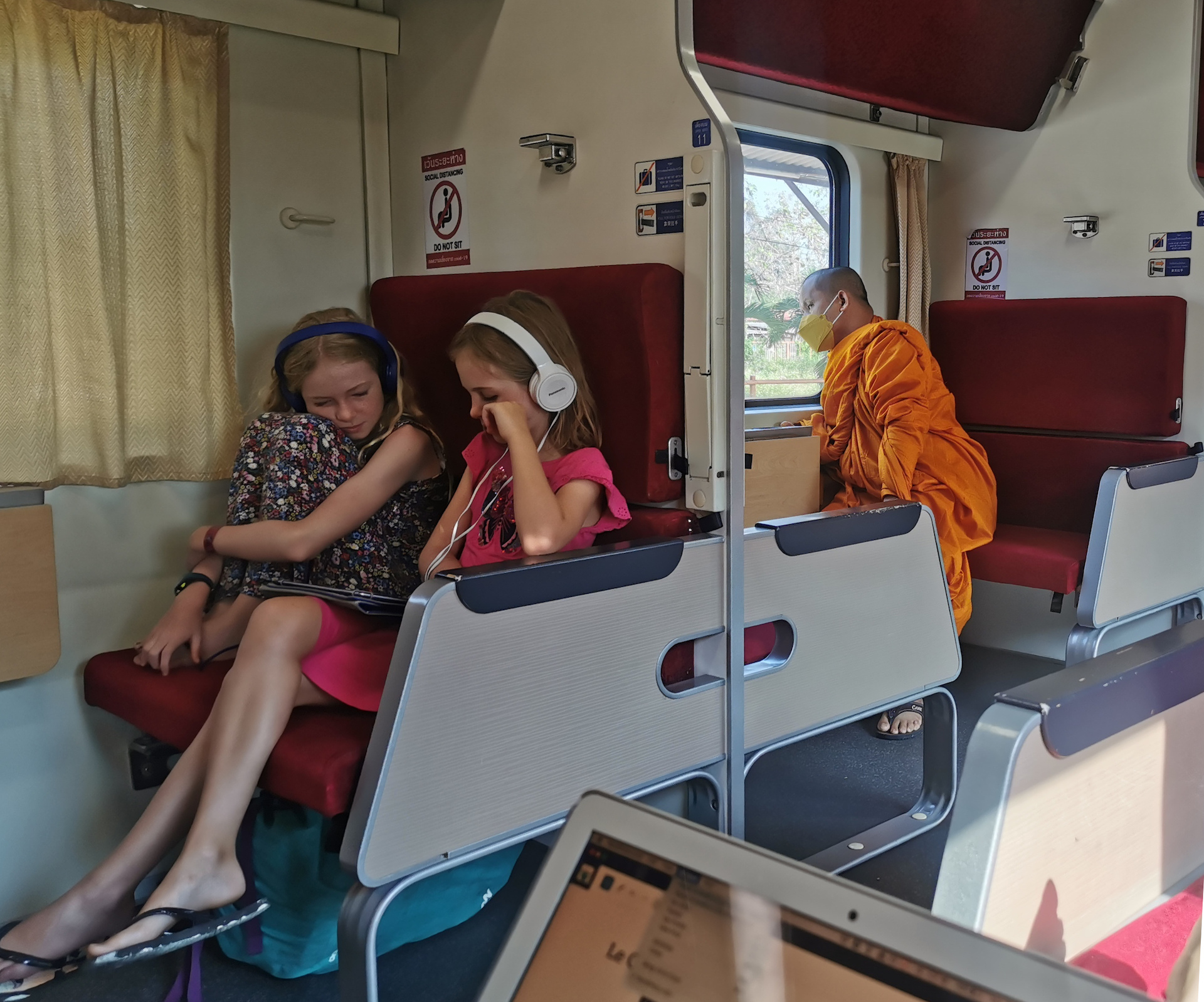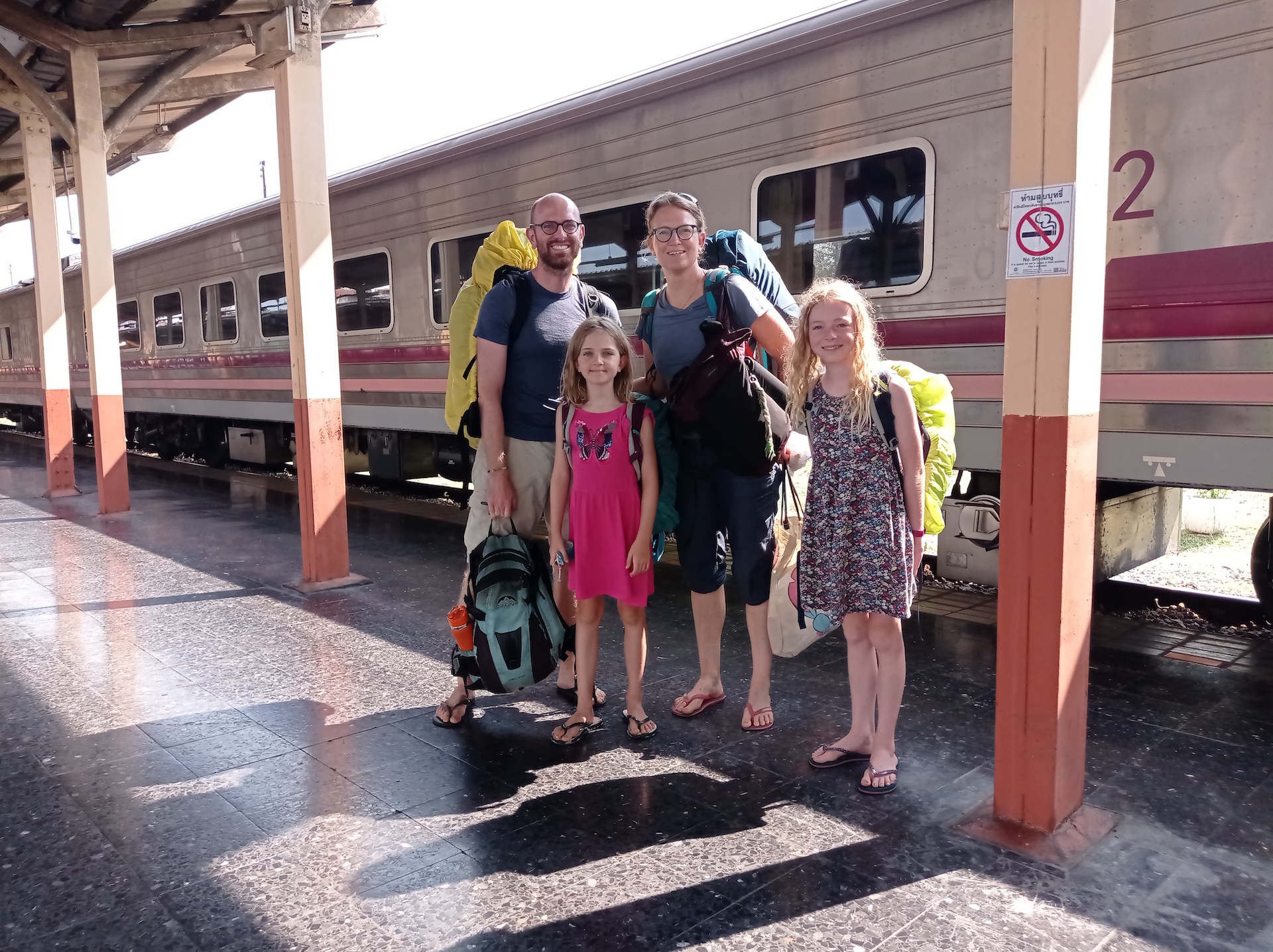 Malgré des lits confortables, nous n’avons pas énormément dormi car la lumière des plafonniers est restée allumée toute la nuit. Mais quand même beaucoup mieux qu’en bus de nuit 😃 ! Selon l’horaire prévu, nous devons arriver autour des 6:30 à Chiang Mai, mais c’est avec plaisir que nous découvrons au réveil que nous avons 2 heures de retard. Nous pouvons donc attendre encore un peu avant de lever les filles et profiter de la fin du voyage pour admirer le paysage.