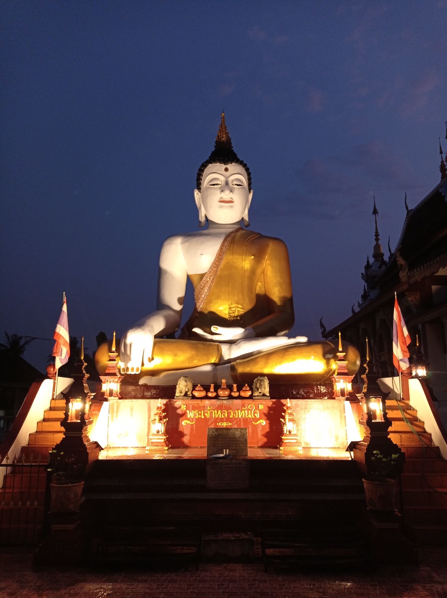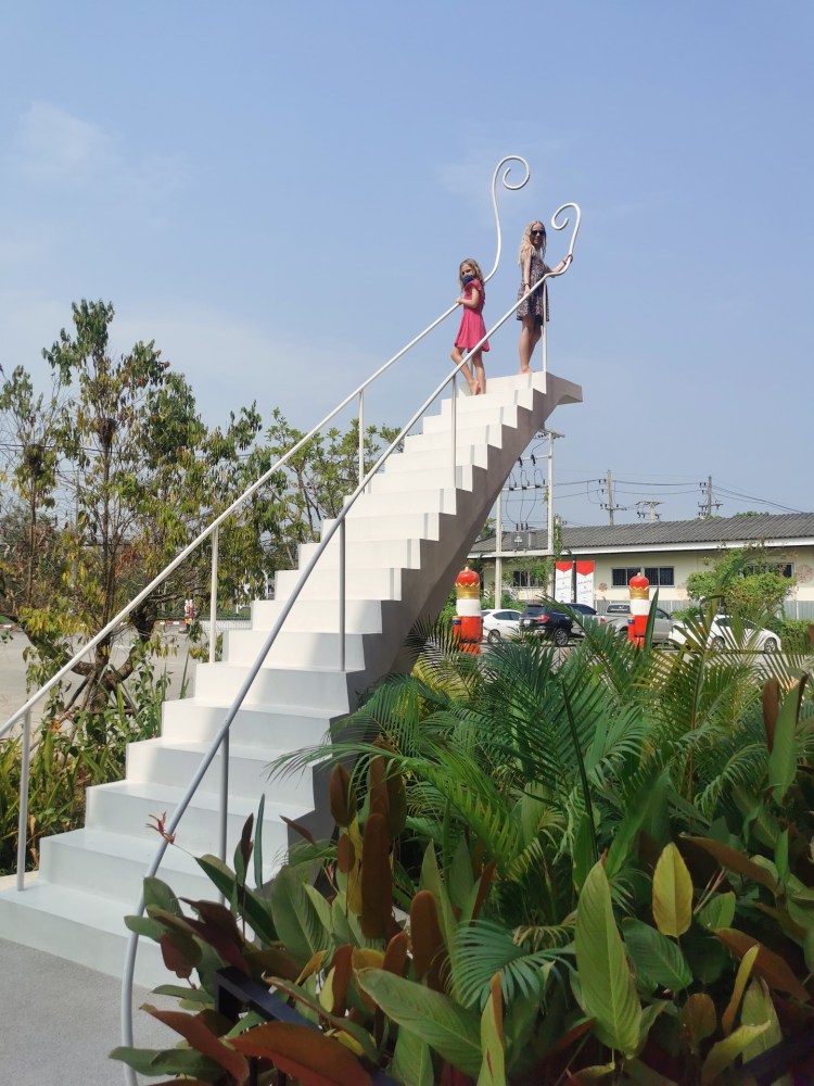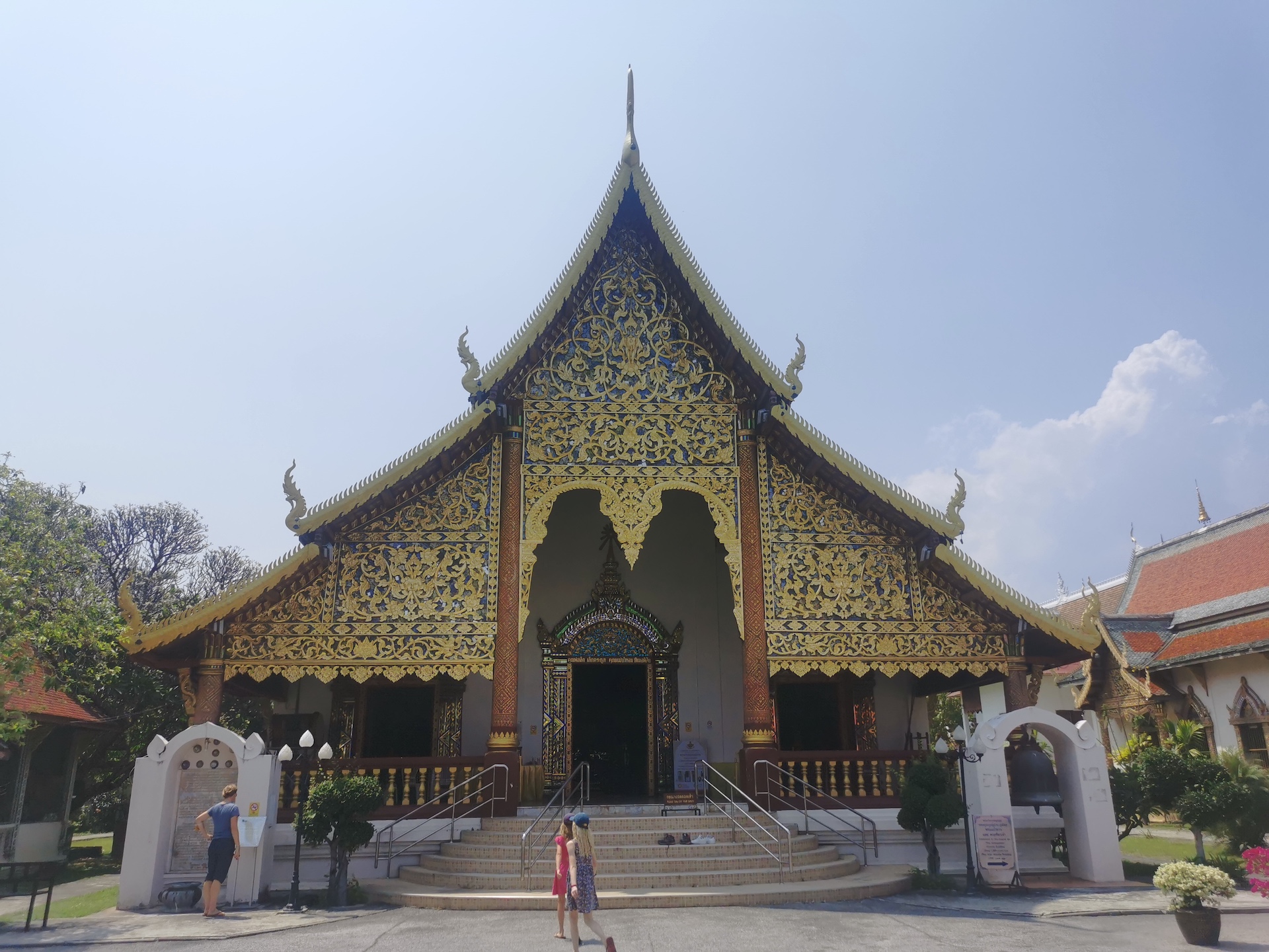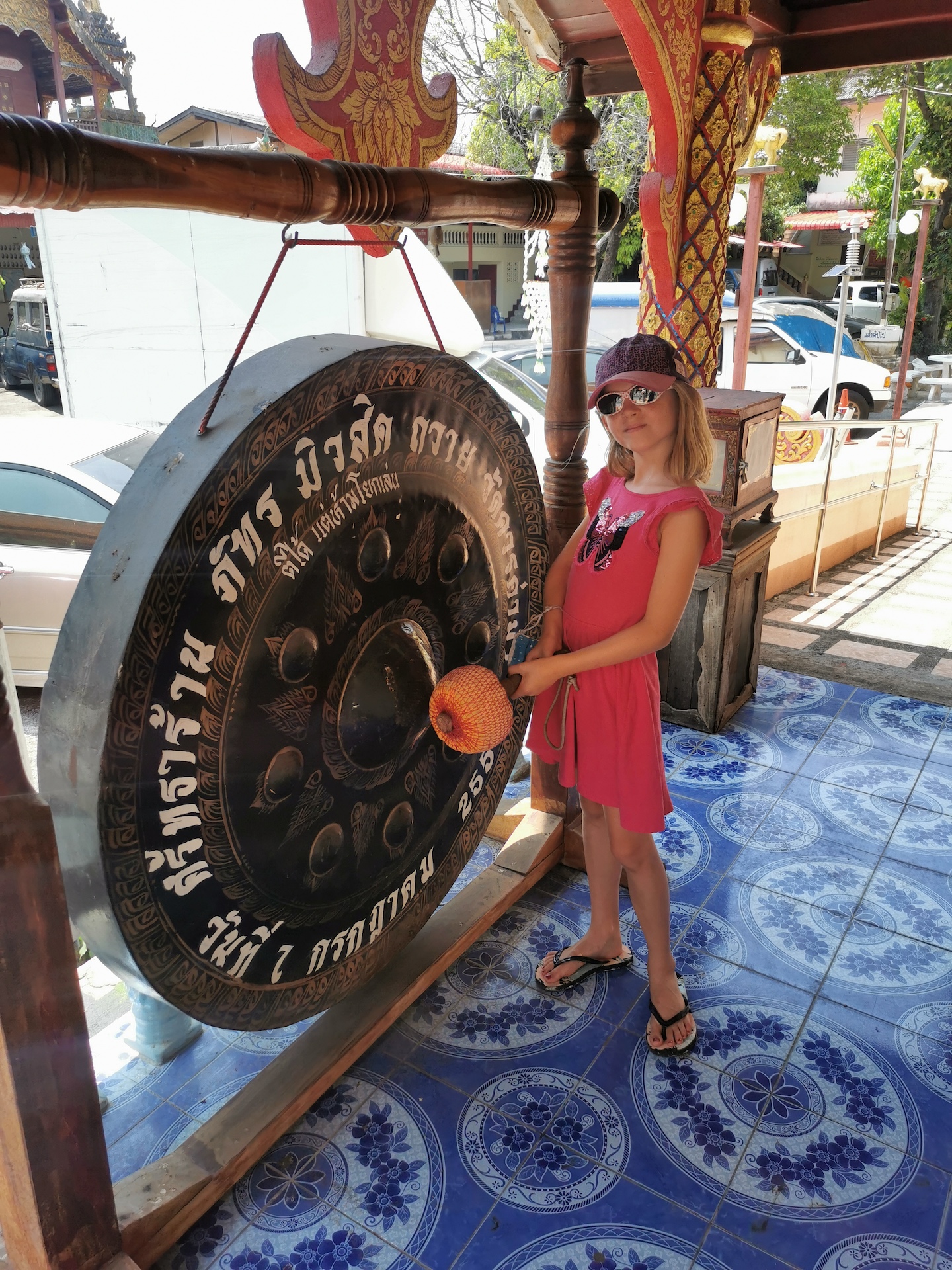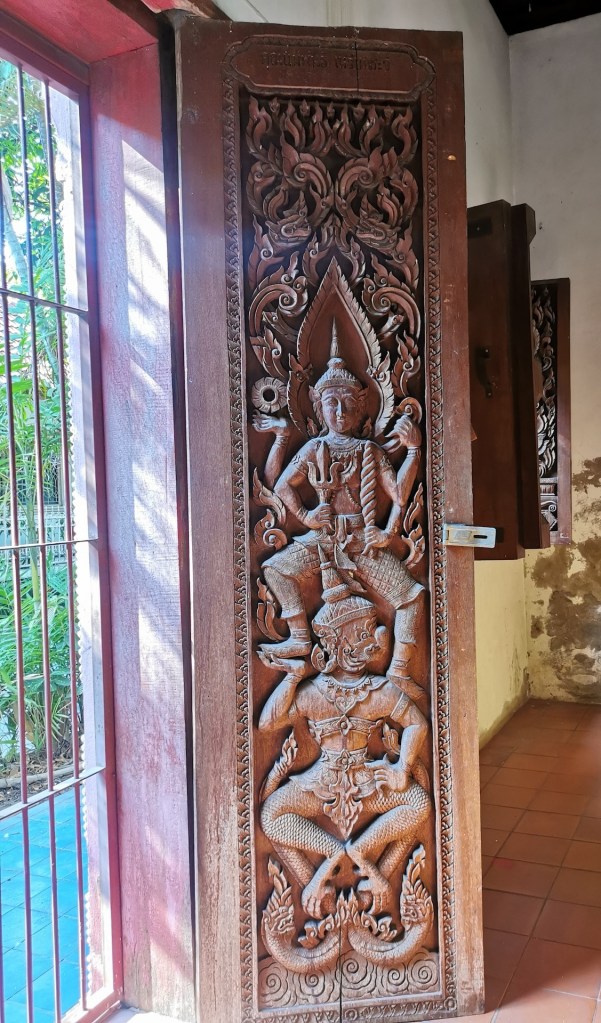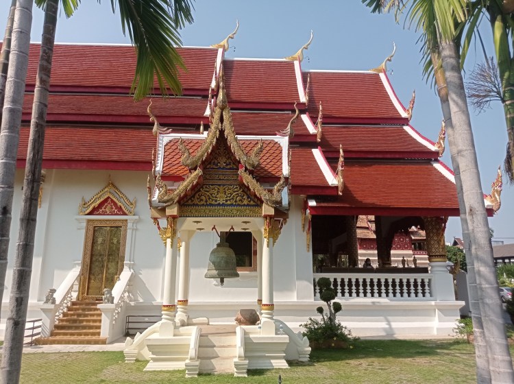 Sur le chemin du retour, nous nous arrêtons, non sans râlements de la part des filles 😜, pour visiter rapidement deux derniers temples qui nous font de l’oeil. A relever aussi qu’en nous baladant un peu au hasard dans les rues de la ville entre deux temples, nous tombons sur un panneau « Représentation consulaire de Suisse ». Nous voyant arrêtés, le propriétaire des lieux, un Suisse marié à une Thaïe, nous rejoint et nous avons le plaisir de discuter (en français) avec lui de la ville et de la région.