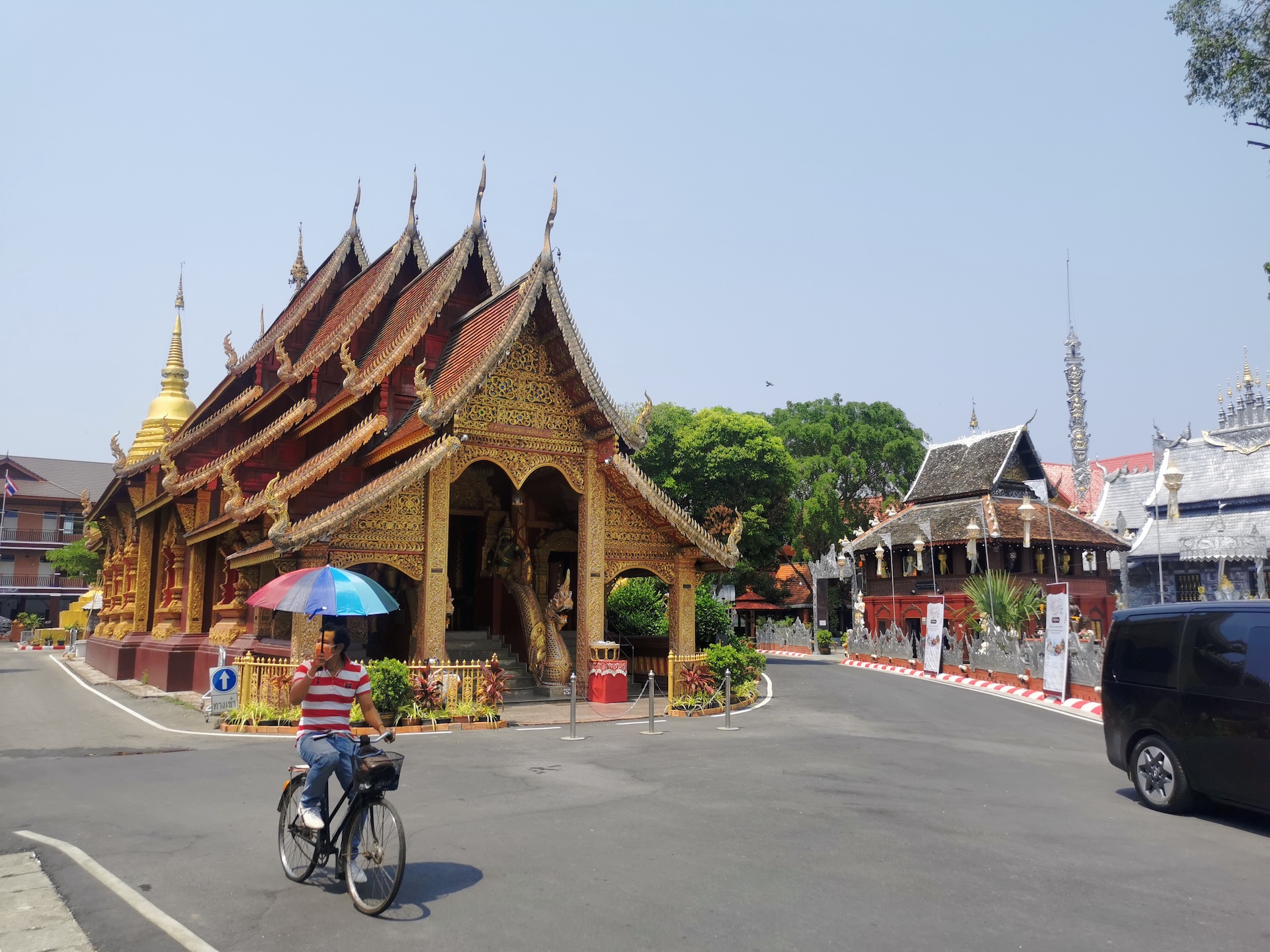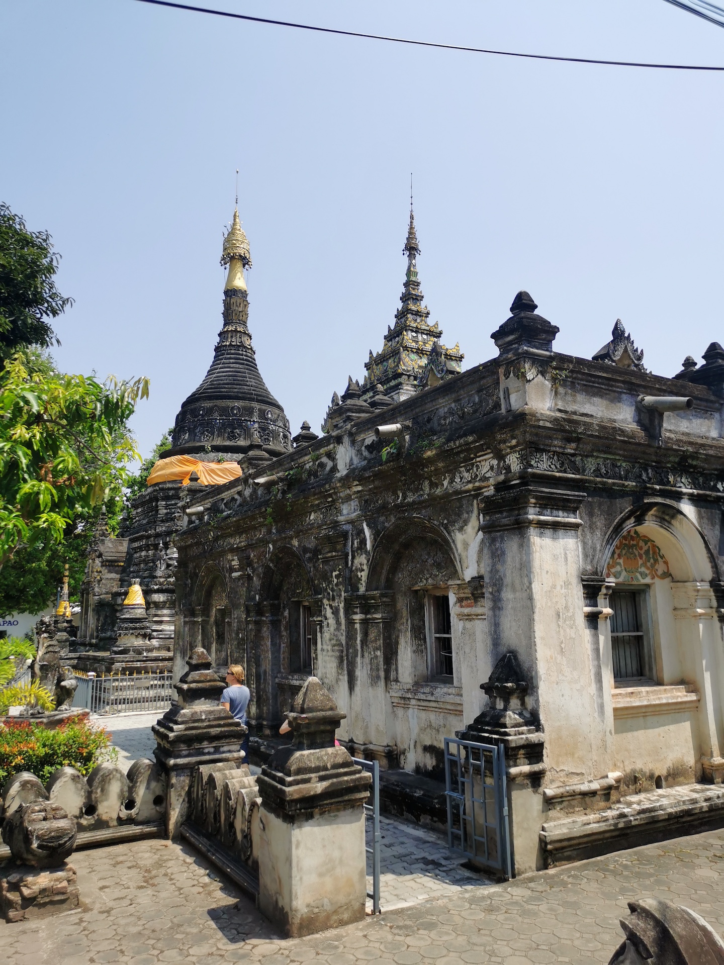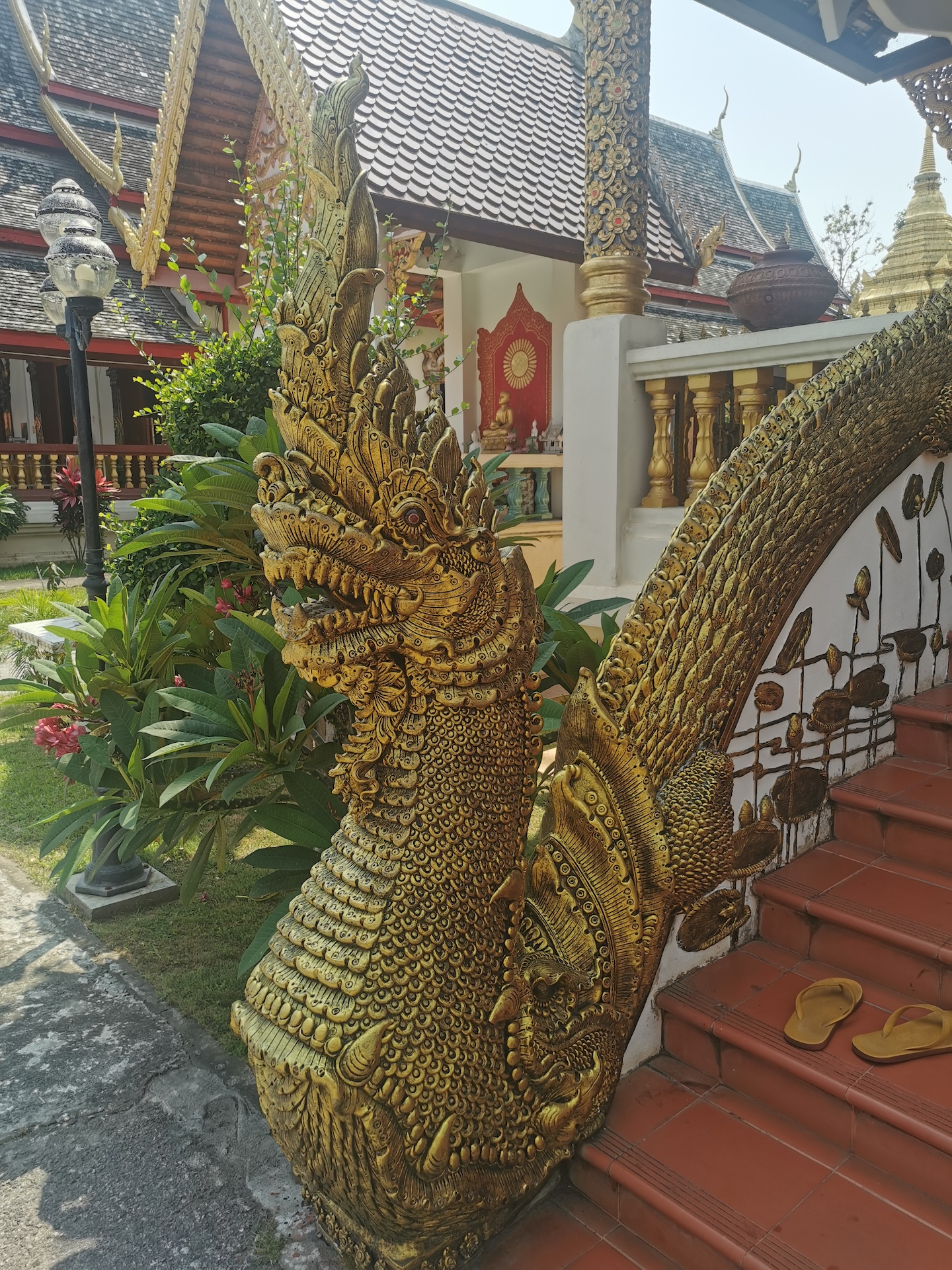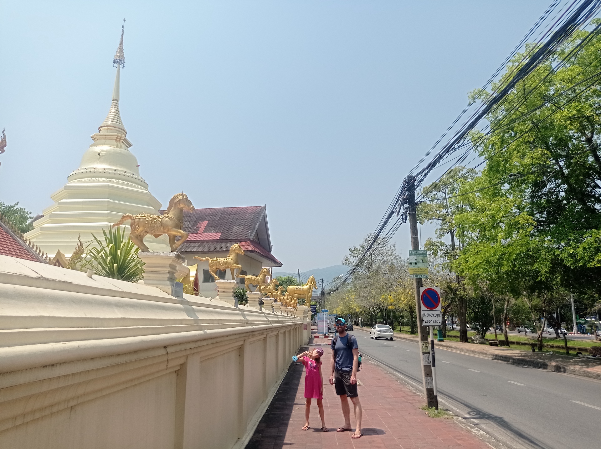 Sur le chemin du retour, nous nous arrêtons, non sans râlements de la part des filles 😜, pour visiter rapidement deux derniers temples qui nous font de l’oeil. A relever aussi qu’en nous baladant un peu au hasard dans les rues de la ville entre deux temples, nous tombons sur un panneau « Représentation consulaire de Suisse ». Nous voyant arrêtés, le propriétaire des lieux, un Suisse marié à une Thaïe, nous rejoint et nous avons le plaisir de discuter (en français) avec lui de la ville et de la région.