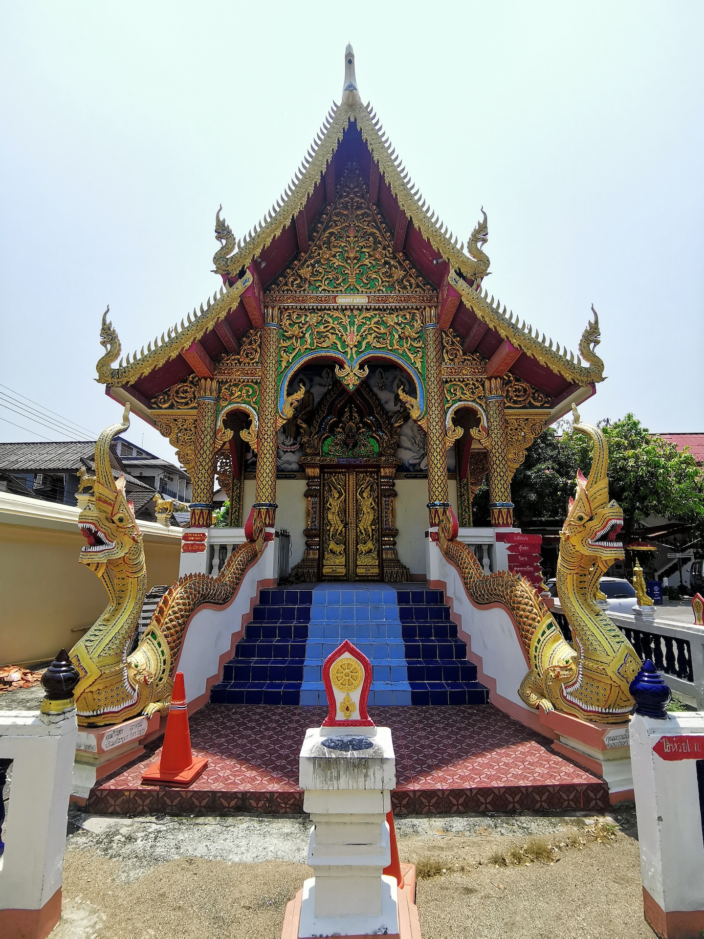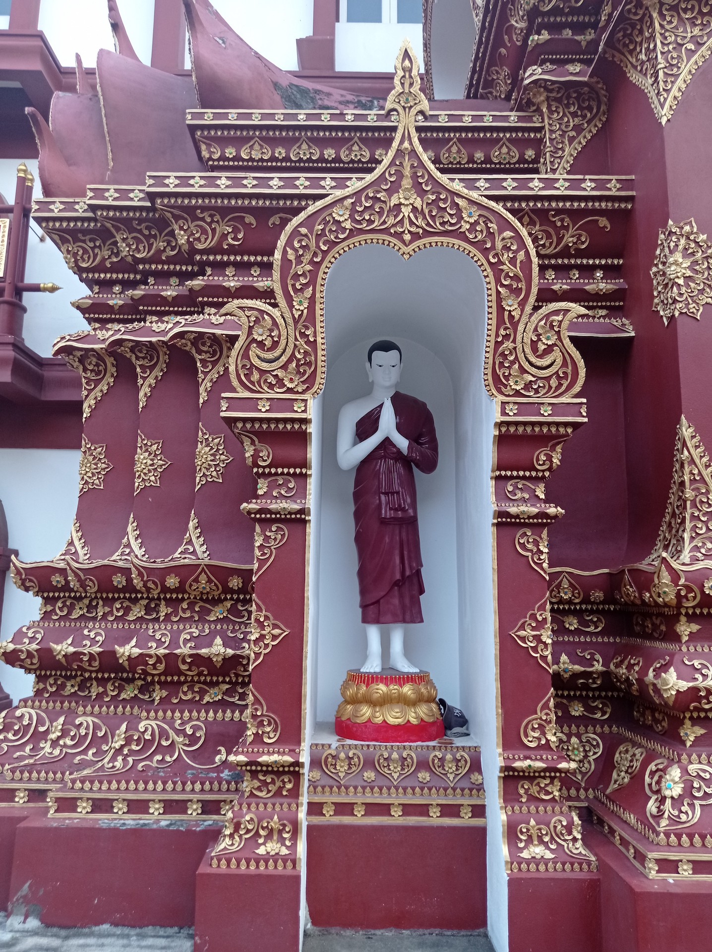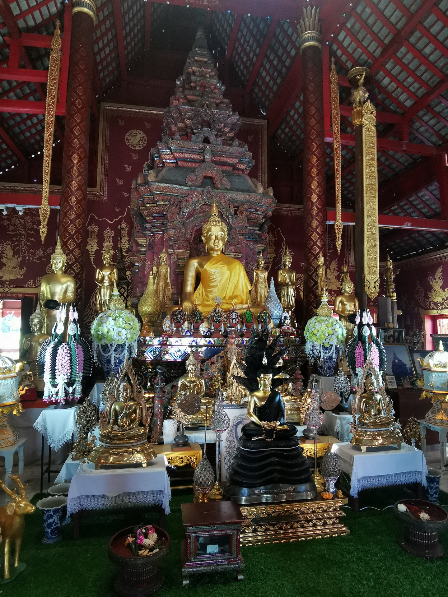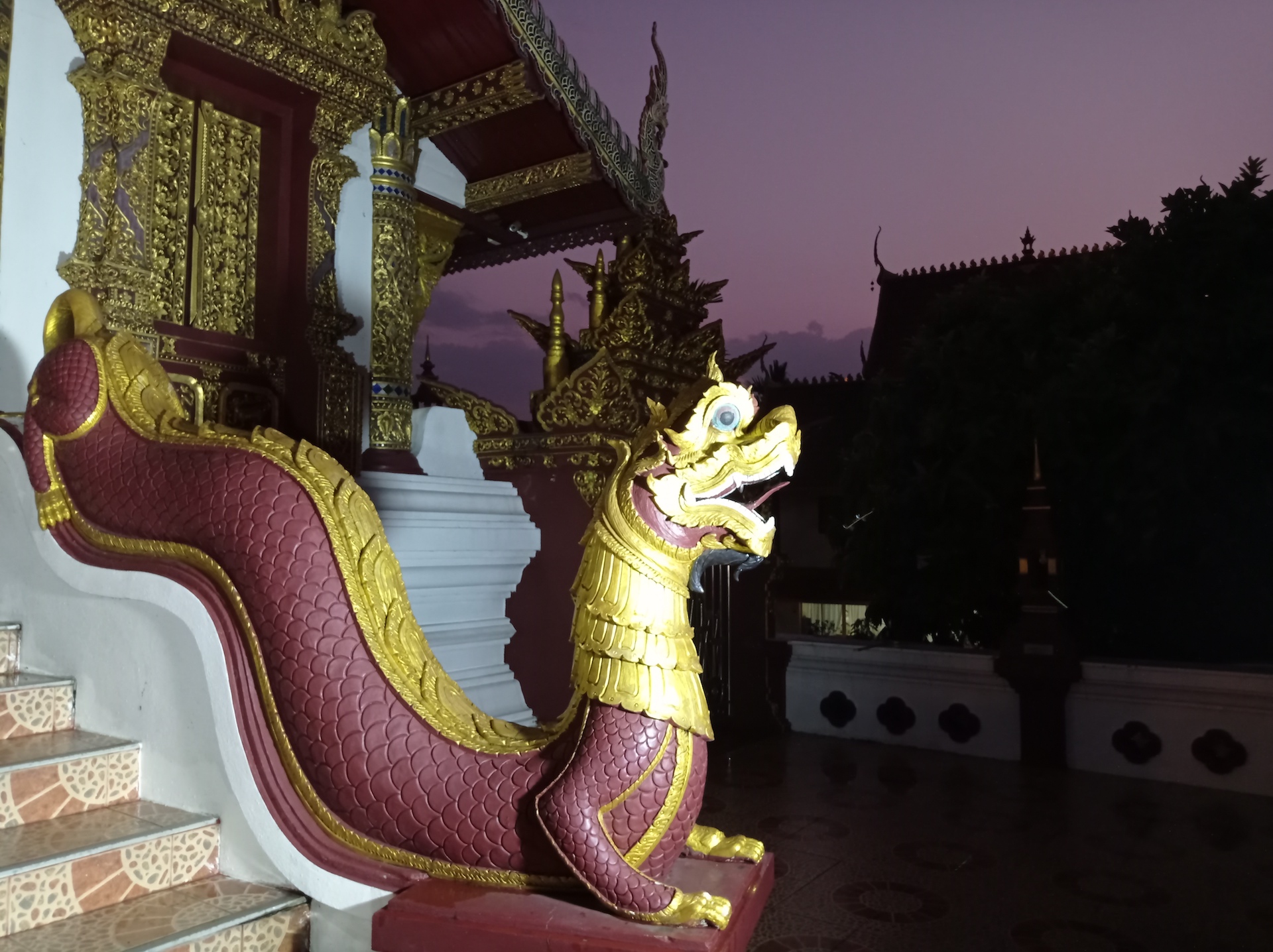 Sur le chemin du retour, nous nous arrêtons, non sans râlements de la part des filles 😜, pour visiter rapidement deux derniers temples qui nous font de l’oeil. A relever aussi qu’en nous baladant un peu au hasard dans les rues de la ville entre deux temples, nous tombons sur un panneau « Représentation consulaire de Suisse ». Nous voyant arrêtés, le propriétaire des lieux, un Suisse marié à une Thaïe, nous rejoint et nous avons le plaisir de discuter (en français) avec lui de la ville et de la région.