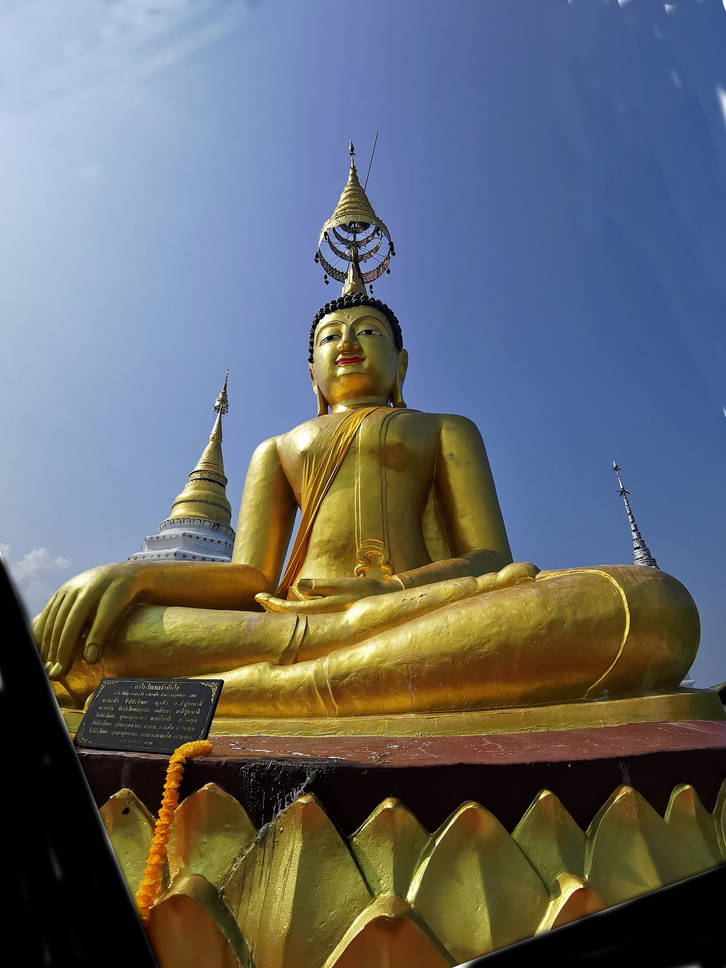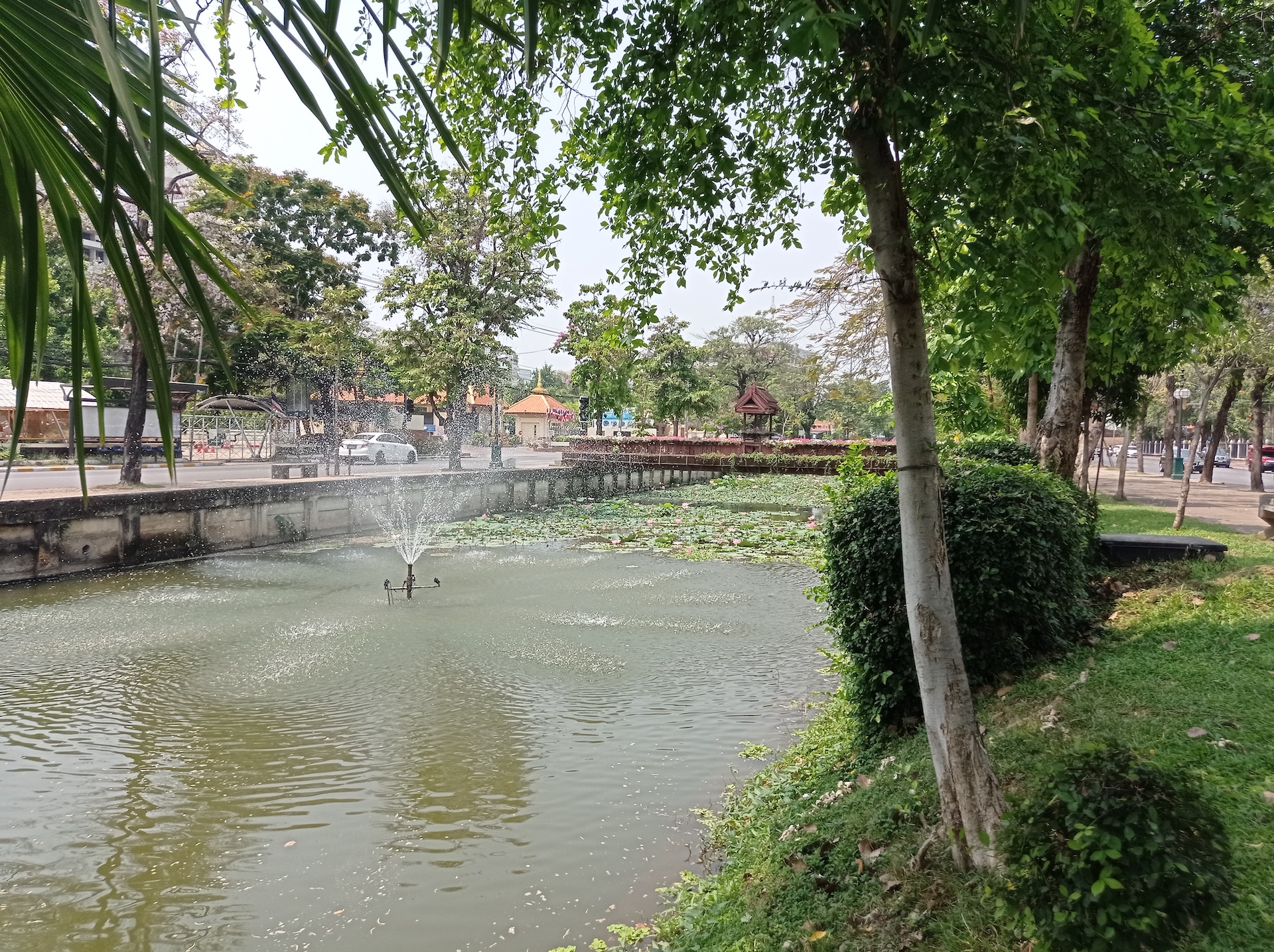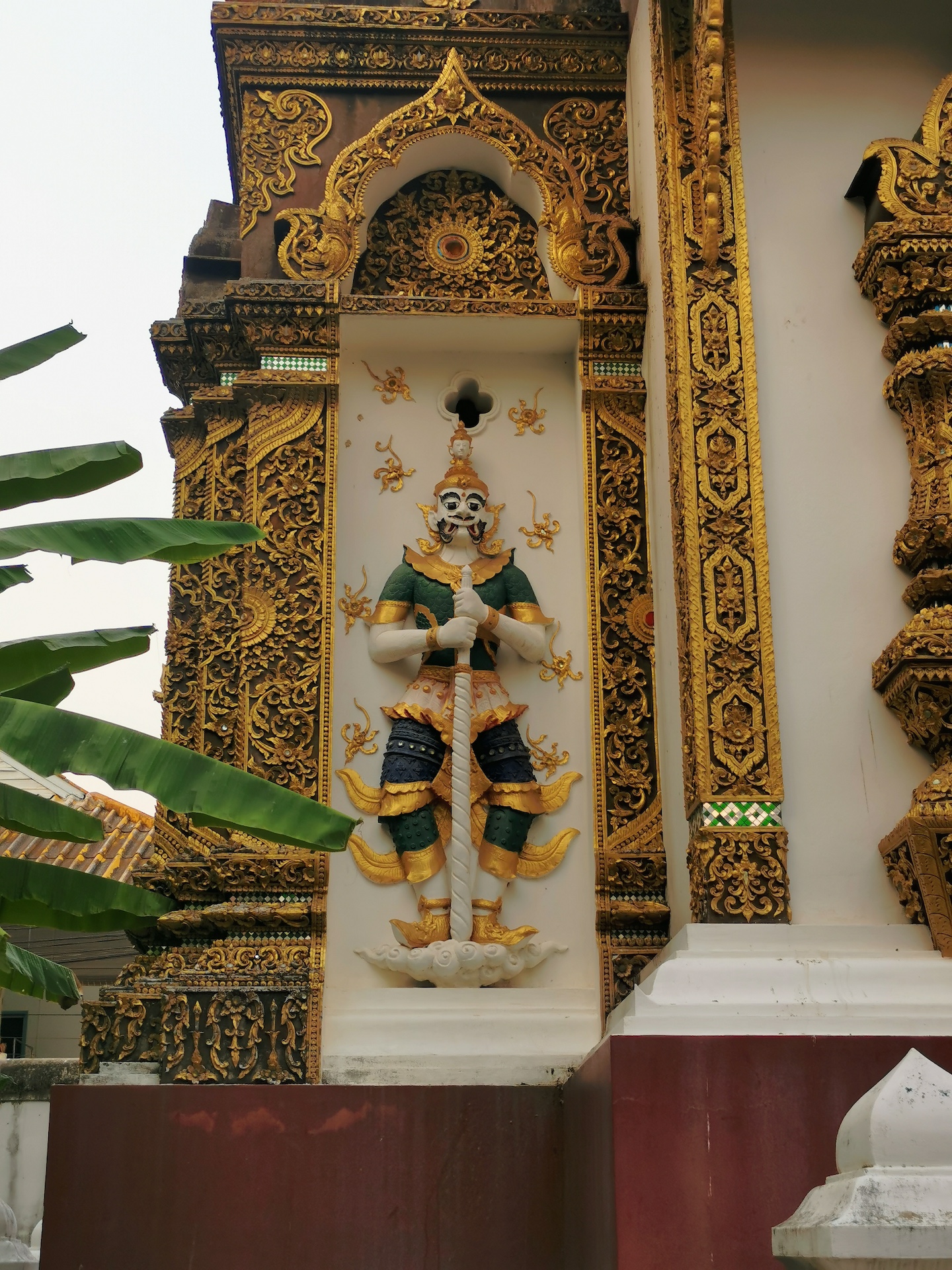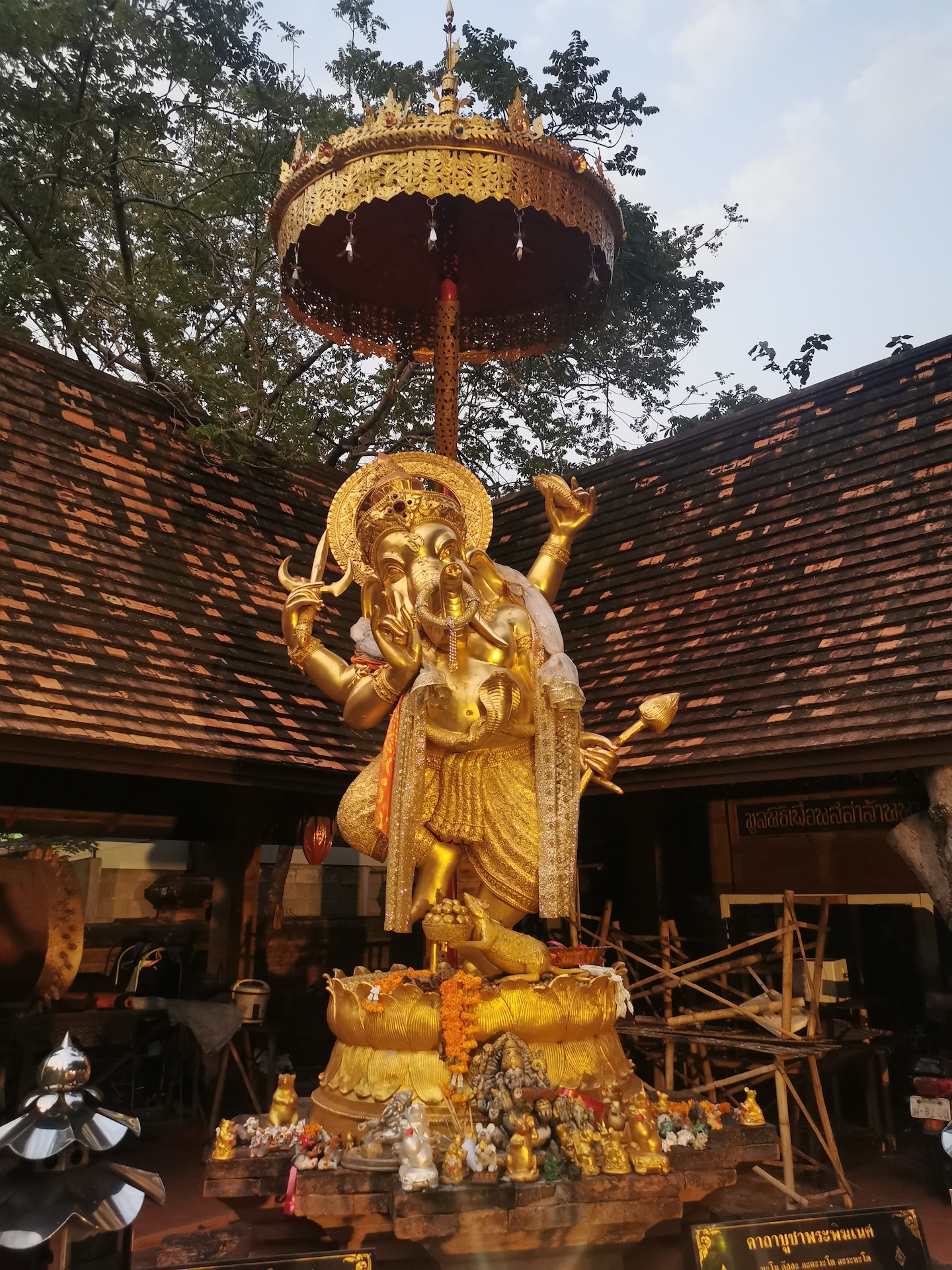 Sur le chemin du retour, nous nous arrêtons, non sans râlements de la part des filles 😜, pour visiter rapidement deux derniers temples qui nous font de l’oeil. A relever aussi qu’en nous baladant un peu au hasard dans les rues de la ville entre deux temples, nous tombons sur un panneau « Représentation consulaire de Suisse ». Nous voyant arrêtés, le propriétaire des lieux, un Suisse marié à une Thaïe, nous rejoint et nous avons le plaisir de discuter (en français) avec lui de la ville et de la région.
